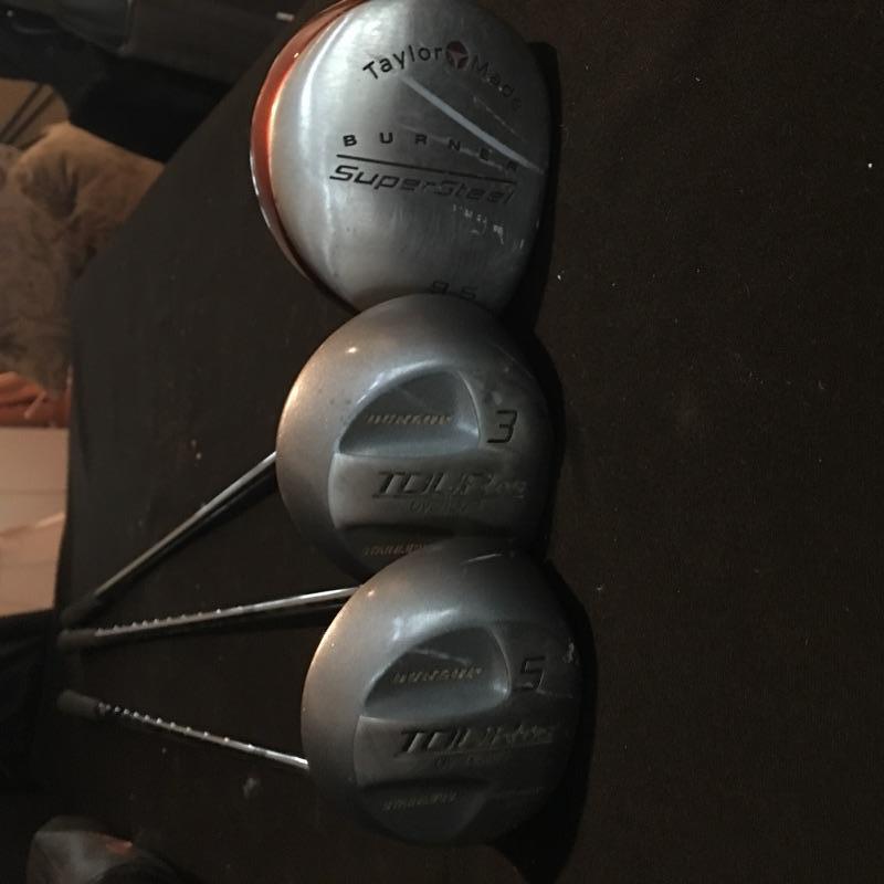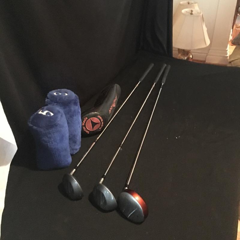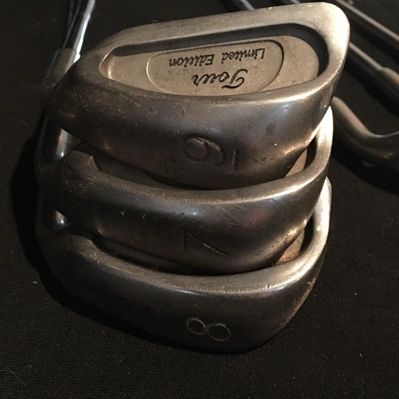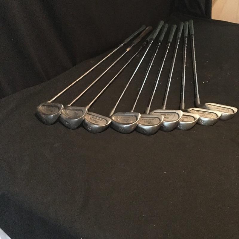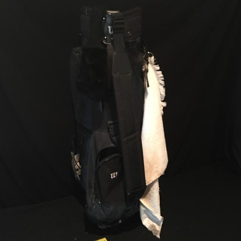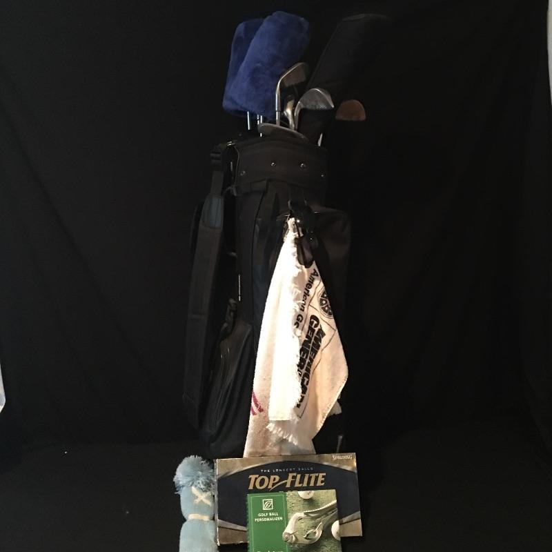 Lot includes nine Tour irons, Taylor Made Driver, Dunlop three and five wood, Wilson bag, ball personalizer and an assortment of golf balls.