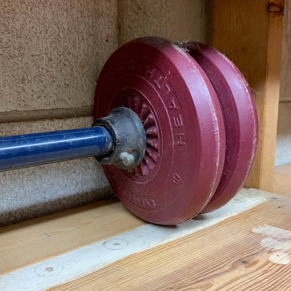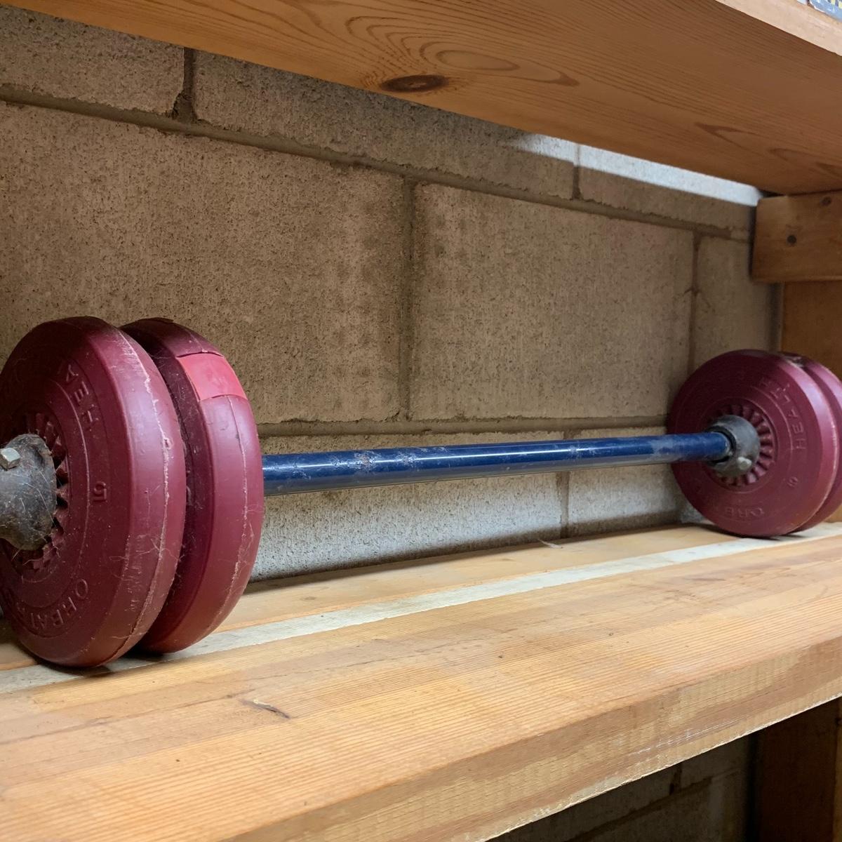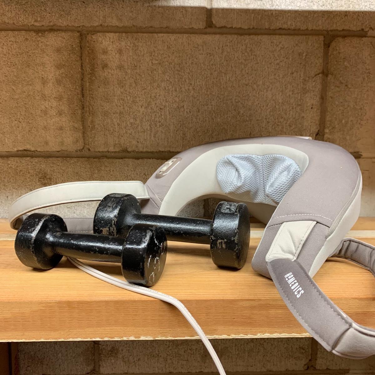 Give yourself the treat of a nice shiatsu neck massage after a good workout with this exercise equipment. Included is a Homedics Shiatsu Neck Massager, Model NMS-230-THP. It functions when plugged in. There is a 3 lb. and 5 lb. York dumbbell and a barbell with four 5 lb. Orbatron Health Disc weights. There is also a 65 cm SIL Fitness exercise ball and a few other exercise items (see photos). Local pickup only.