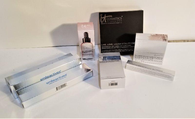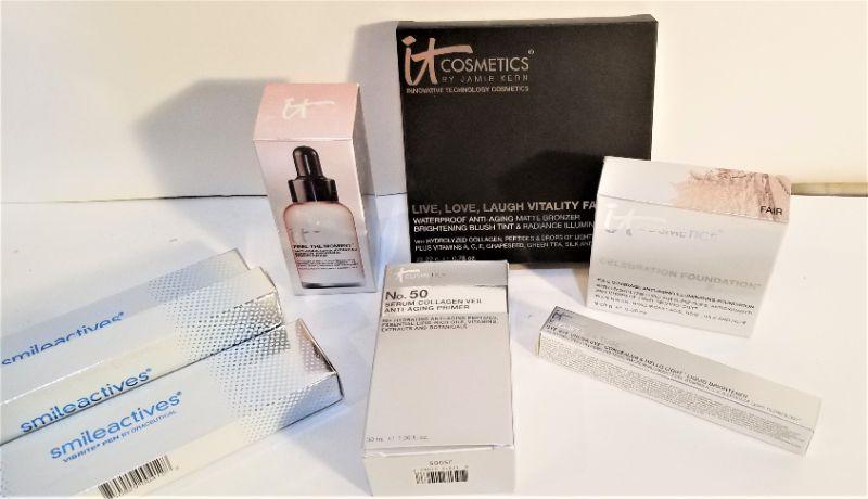 From IT cosmetics - you get everything you see here. #50 collagen veil (1 oz), Bye Bye Under Eye Concealer, Celebration Foundation (.3 oz) - Feel the Moment anti aging hydrating primer serum (1 oz)., Live Love Laugh Vitality Face Disc (anti aging bronze), and 3 SmileActives teeth whitening pens. All are new and unopened.
