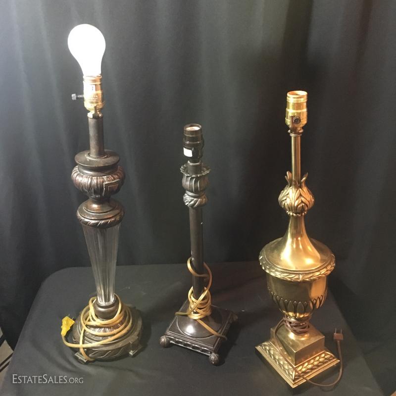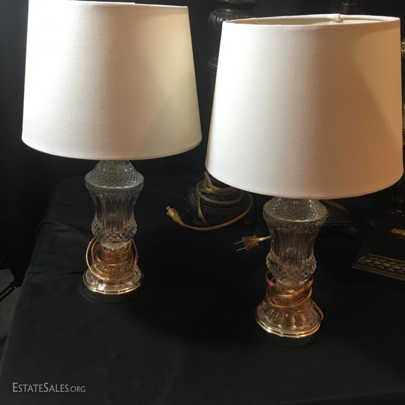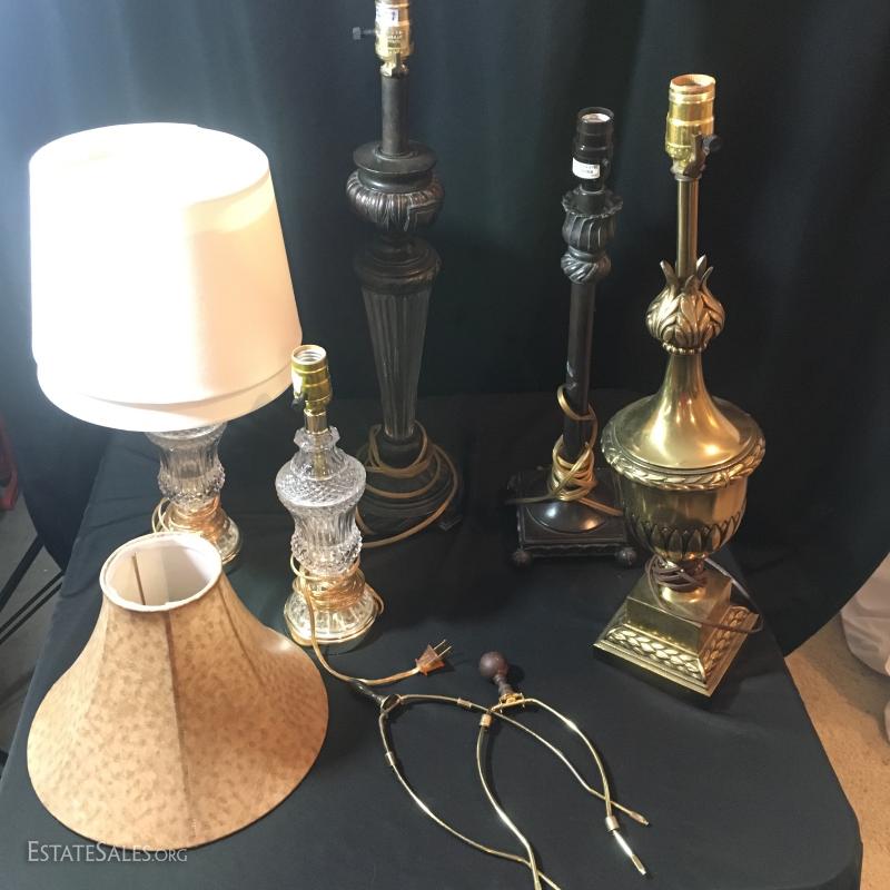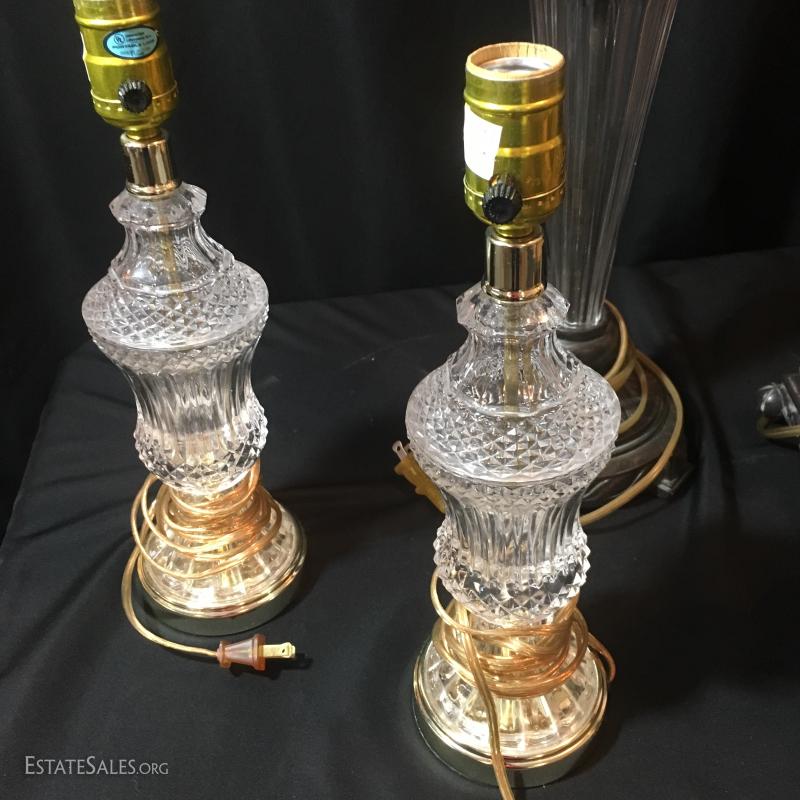 Lot of lamps: two matching crystal lamps, one solid brass lamp and couple misc lamps, shades and shade mounts.