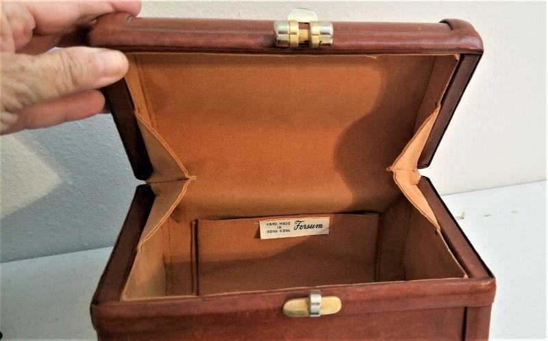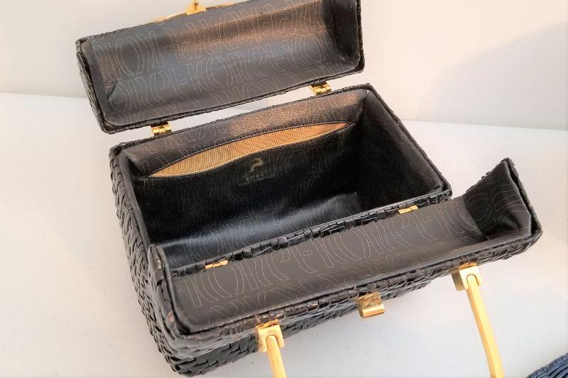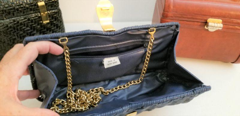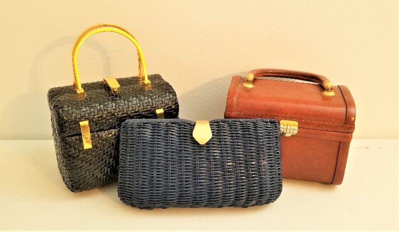 Good looking lot of three vintage (1960's) handbags - Camel leather bag made by Forsum, 8" x 6" x 5.5", Basket clutch/shoulder bag, made in Hong Kong, 10" x 6" and Koret Basket purse with gold tone handles, 7.5" x 7" x 5". All of these purses are in good vintage condition and large enough to hold a cell phone.