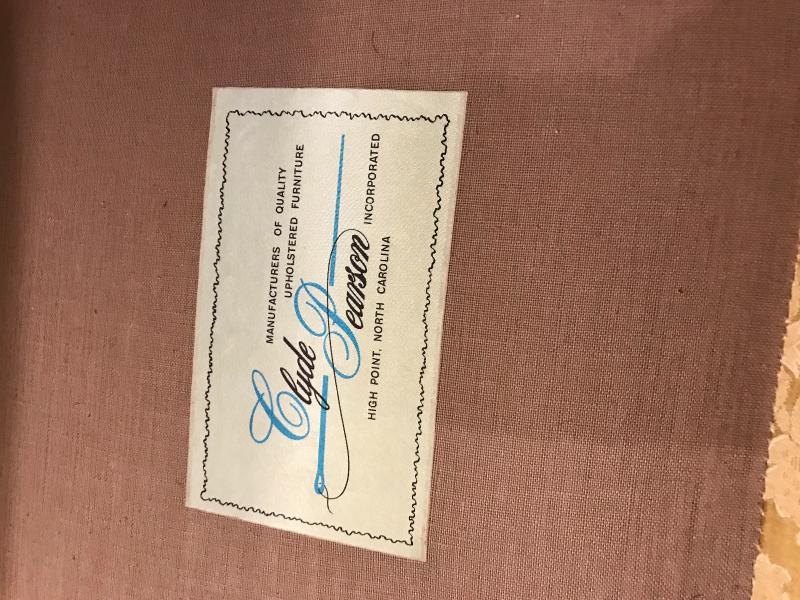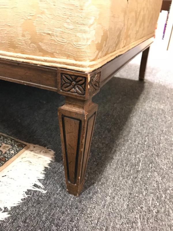 Vintage mid century Italian style sofa by Clyde Pearson. Wood frame and exposed legs. Gold damask upholstery has some minor tears. Two cushions. Button tufted back. A long low mid century beauty that would be fabulous updated with new upholstery. Very study and comfortable. 85 1/2" x 32" x 27" H