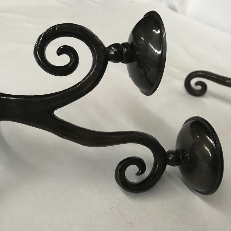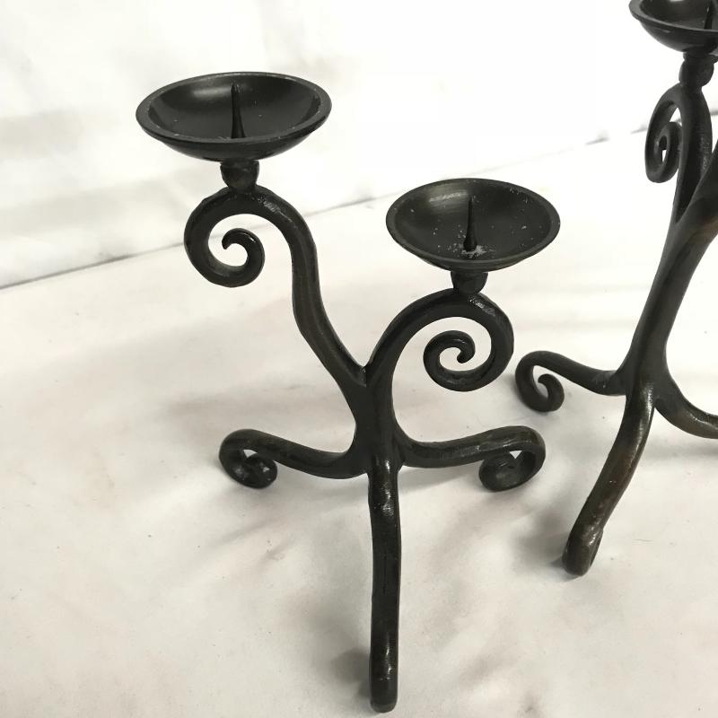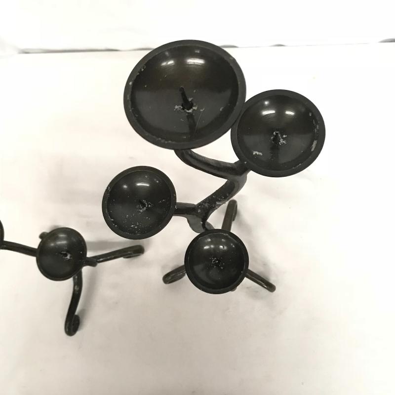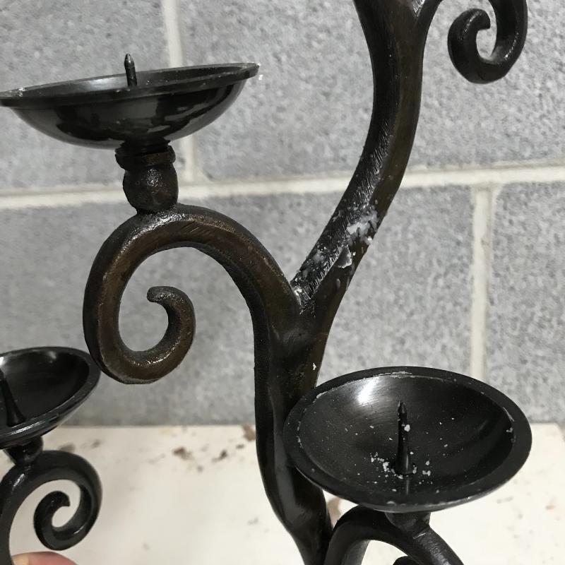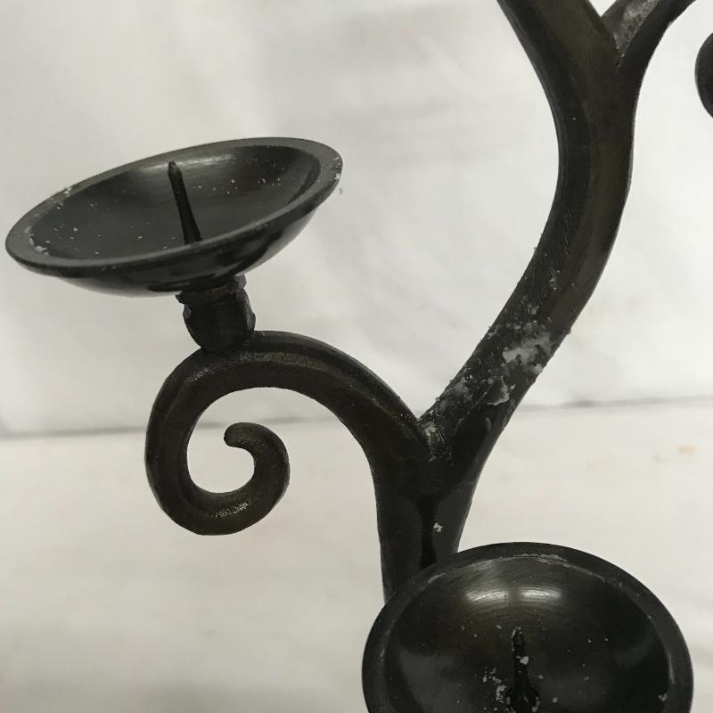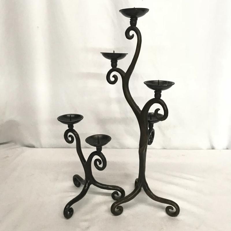 Two heavy metal candle holders with the ability to hold six candles collectively. They are dark with a brown/bronze hue and have some wax drips. No shipping.
