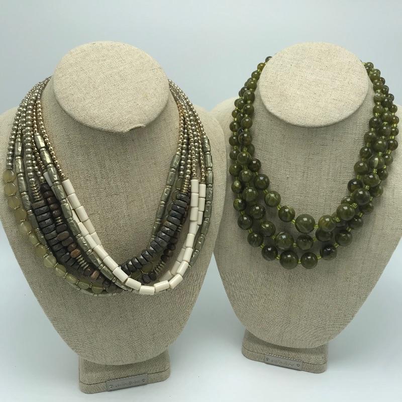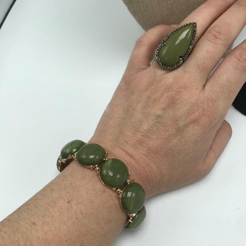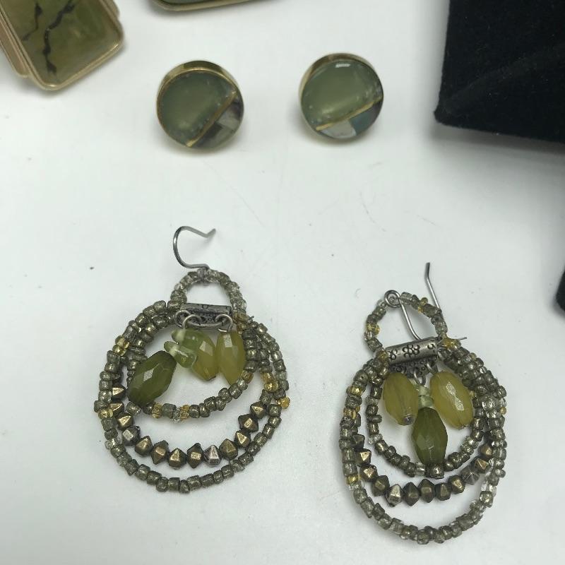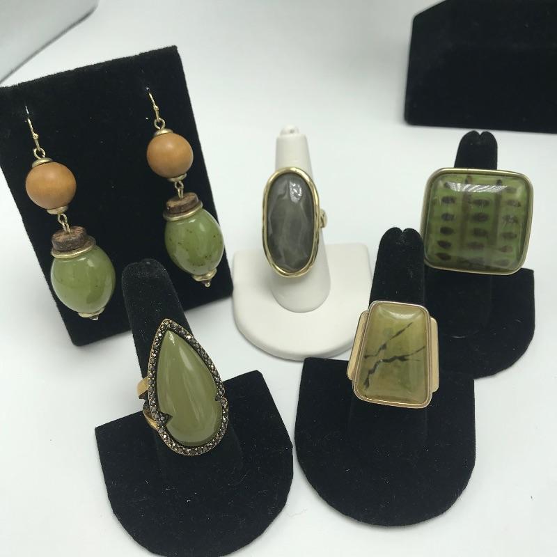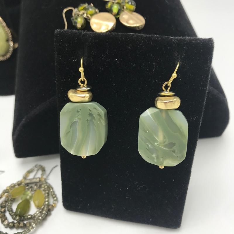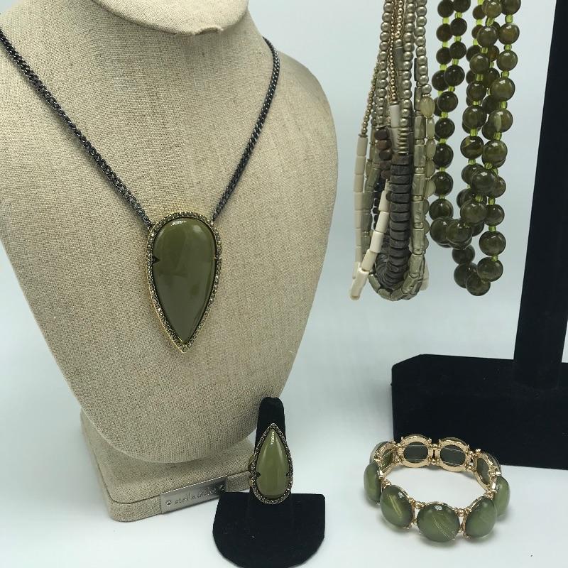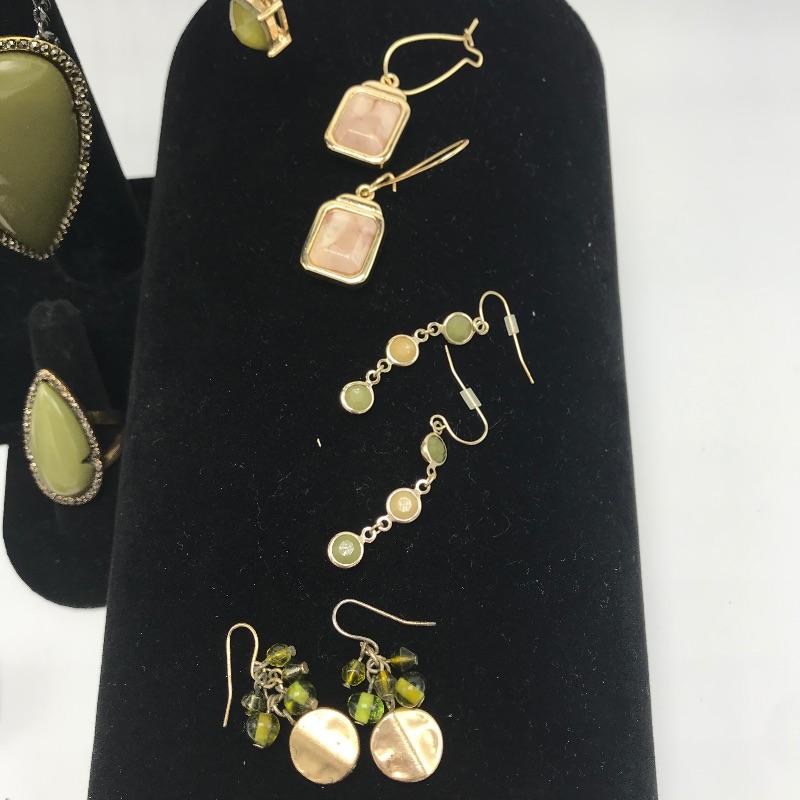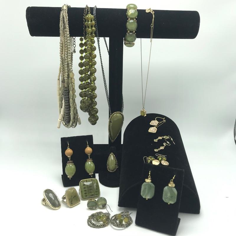 Nice olive colored jewelry including earrings for pierced ears, simple and chunk necklaces, rings and even a teardrop set by Charming Charlie’s.