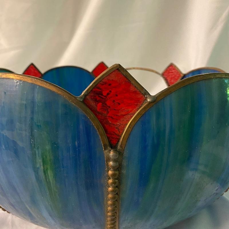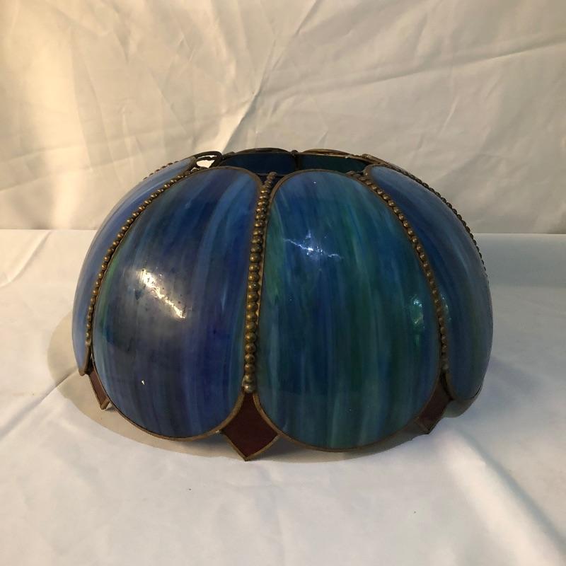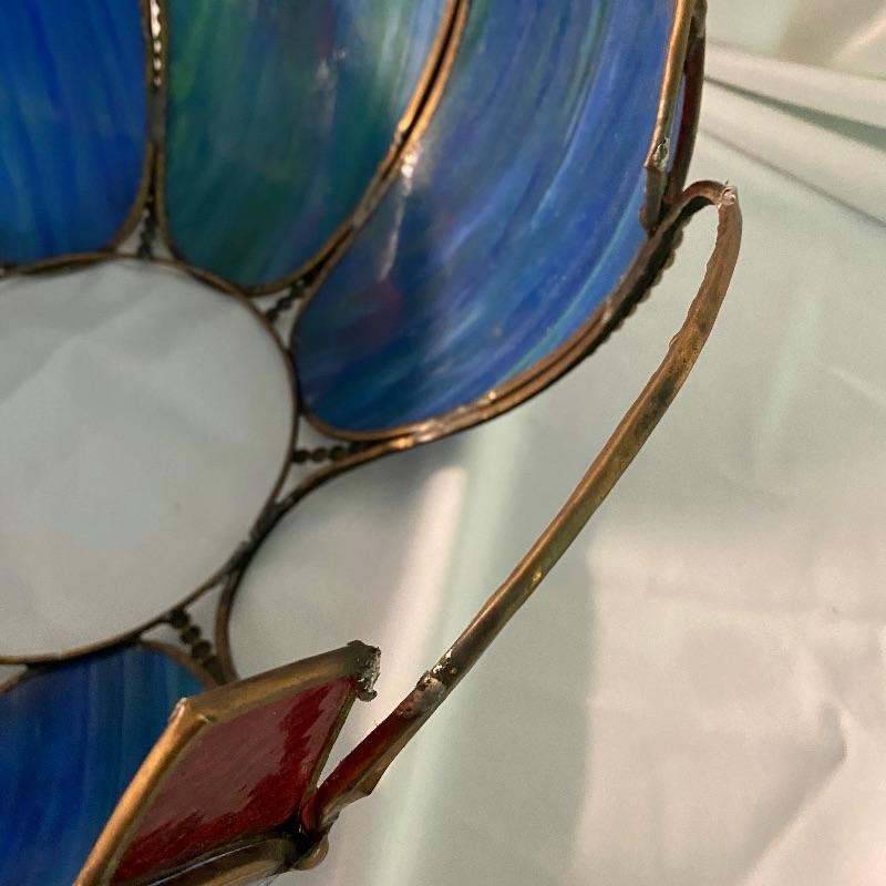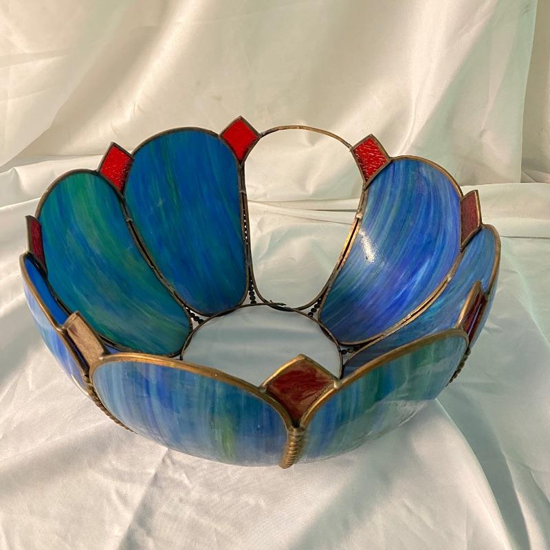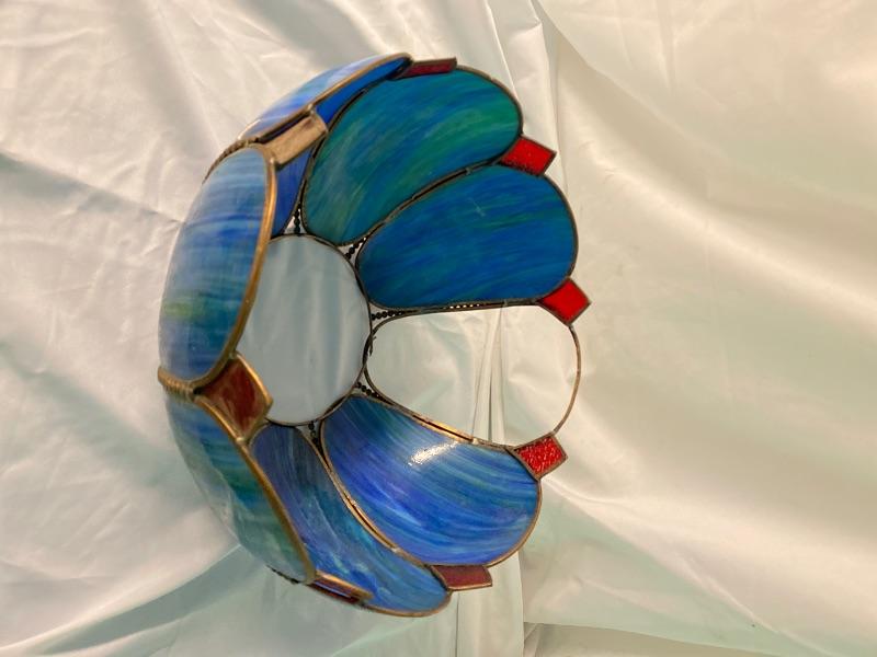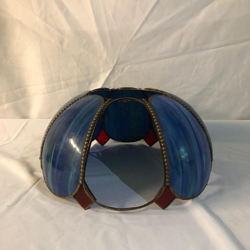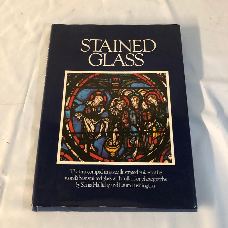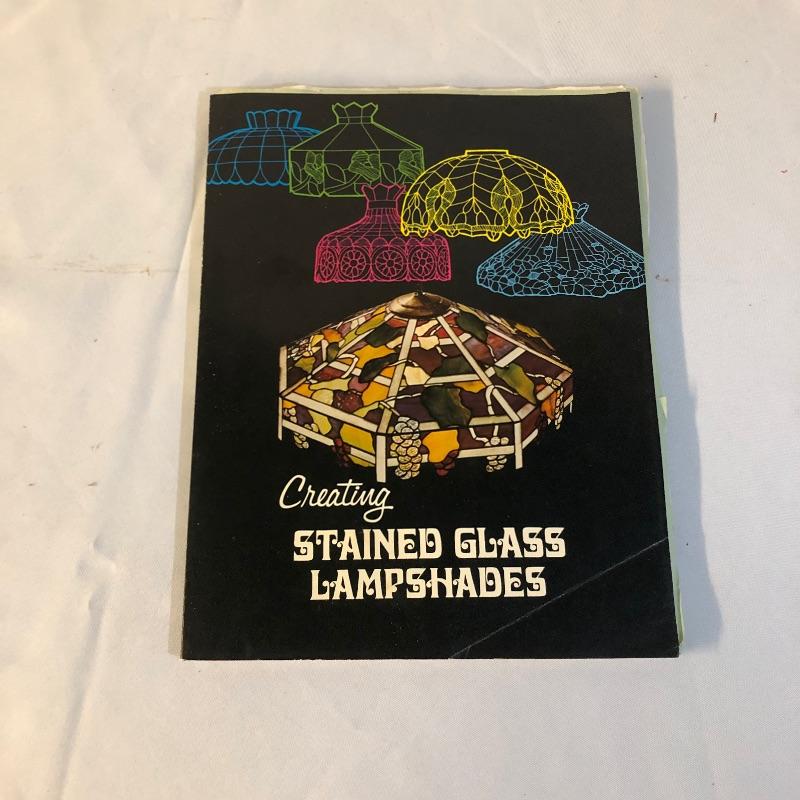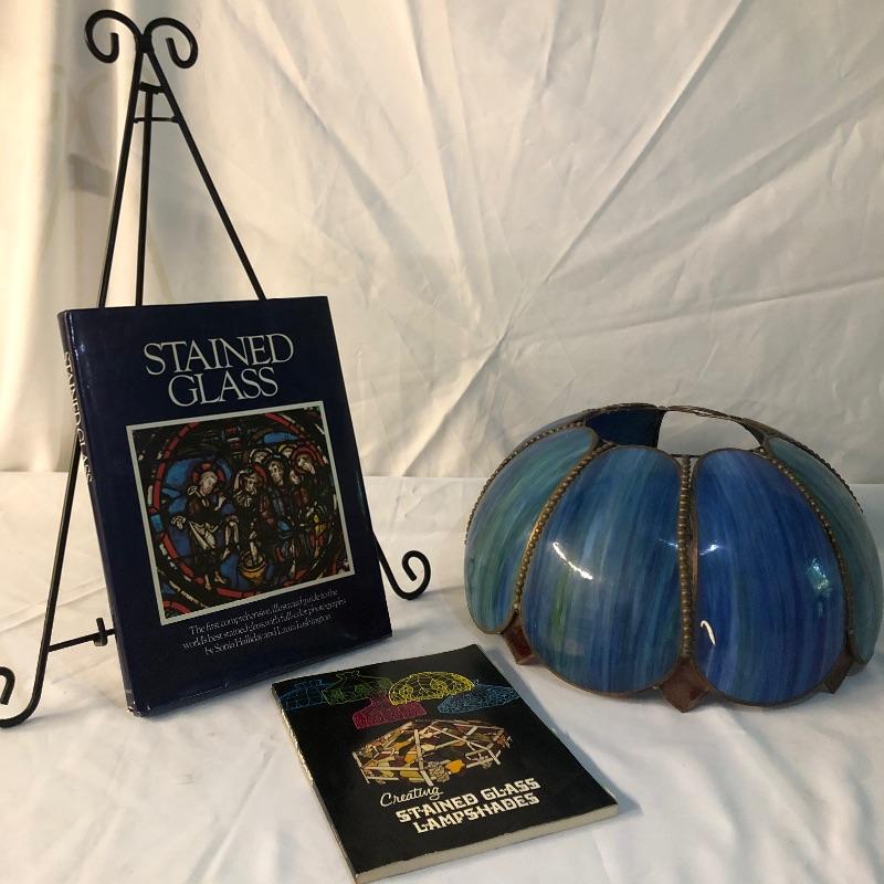 Calling all stained glass lovers! This lot includes a stained glass style lamp shade with metal detailing. One panel of the lamp is missing but the lamp parts can be repurposed for other art projects. Hard to tel if it’s actually glass or plastic. This lot also includes two books about stained glass. The lamp measures about 18” x 9.5”. Shipping available.