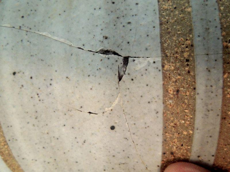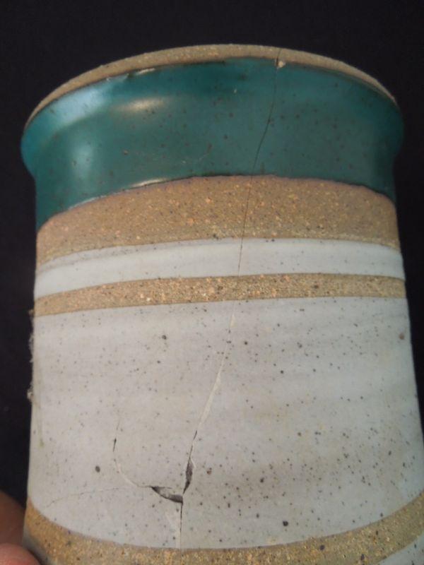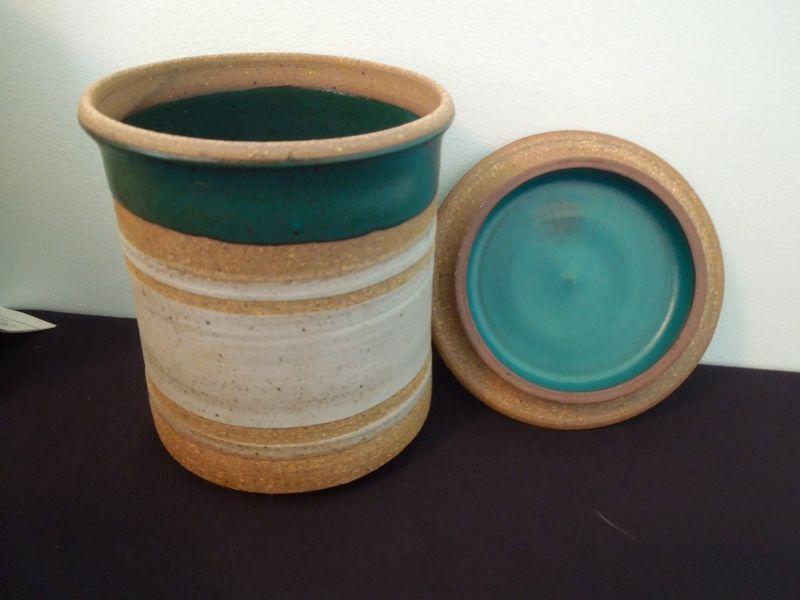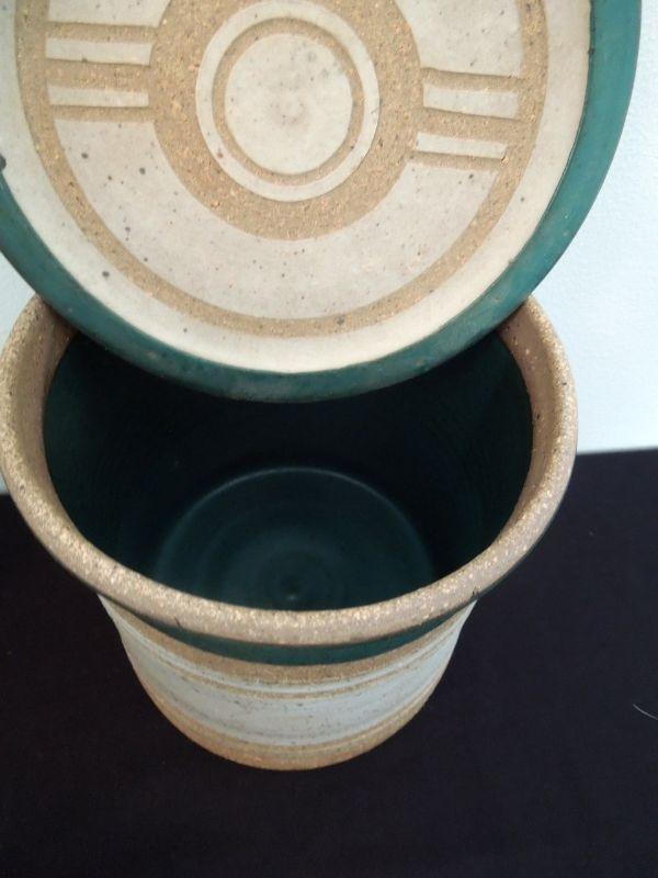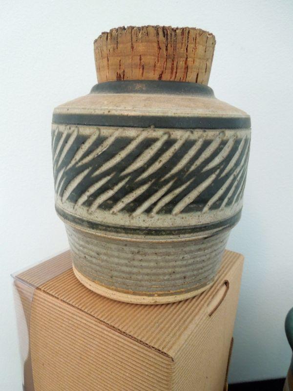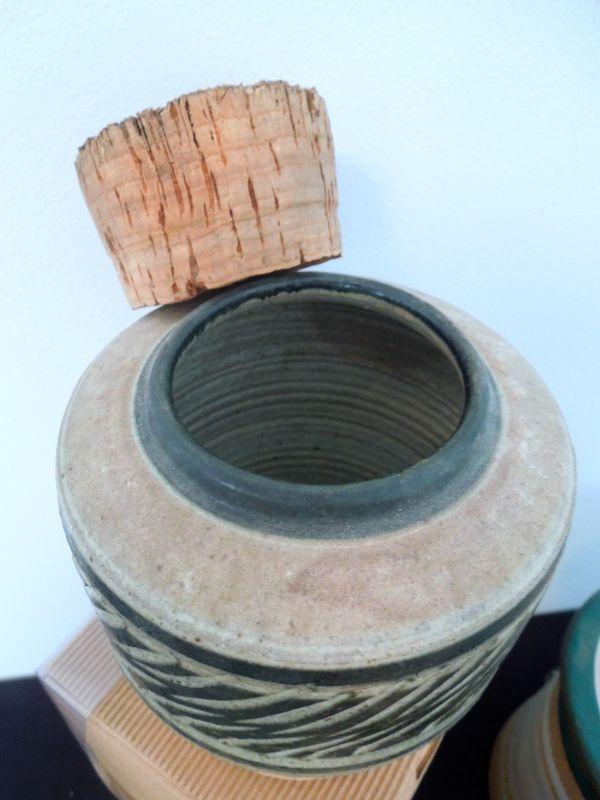 Striped stoneware crock with cork by Michael Pitts c. 1977. Cylinder lidded pot by "H" with emerald green stripes has a major crack. Scored grey stoneware stamped "Bill Suggs"