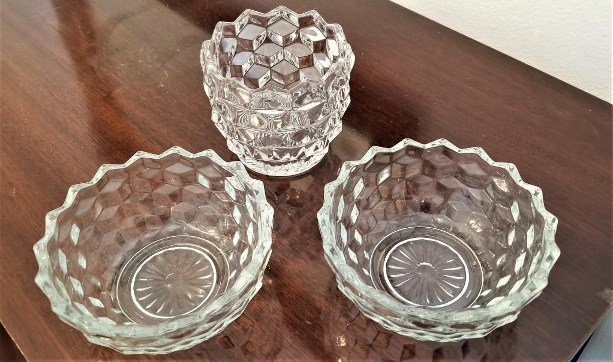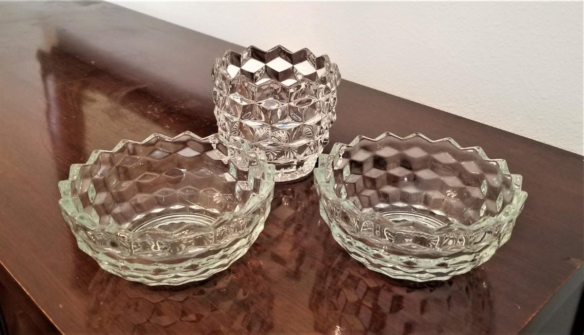 Three nice pieces of Fostoria - 2 low bowls, both 2" tall - the higher piece is 4" tall. Good condition.