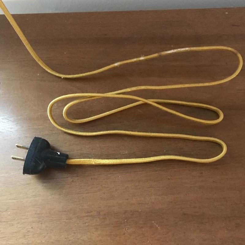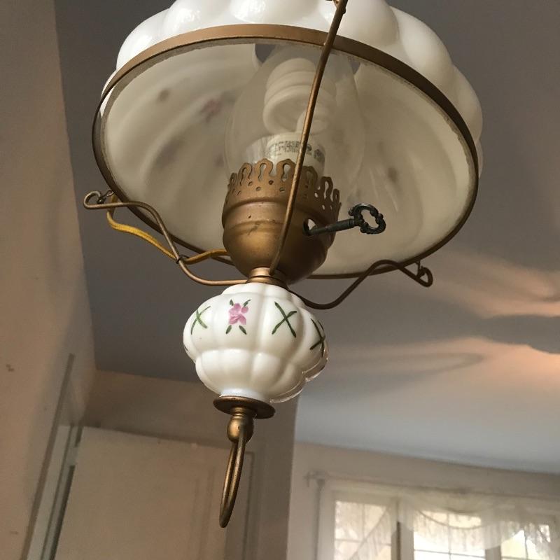 Gorgeous white and brass colored MCM lamp with delicate floral designs. This swag lamp has metal hardware and pipe-like features to stabilize the cord. Lamp works when plugged in. The shade appears to have milk-glass qualities, while the lower globe seems to have a less iridescent quality. Lamp has an approximate 12”d and is about 23” from metal “bell” to base hoop. Shipping available.