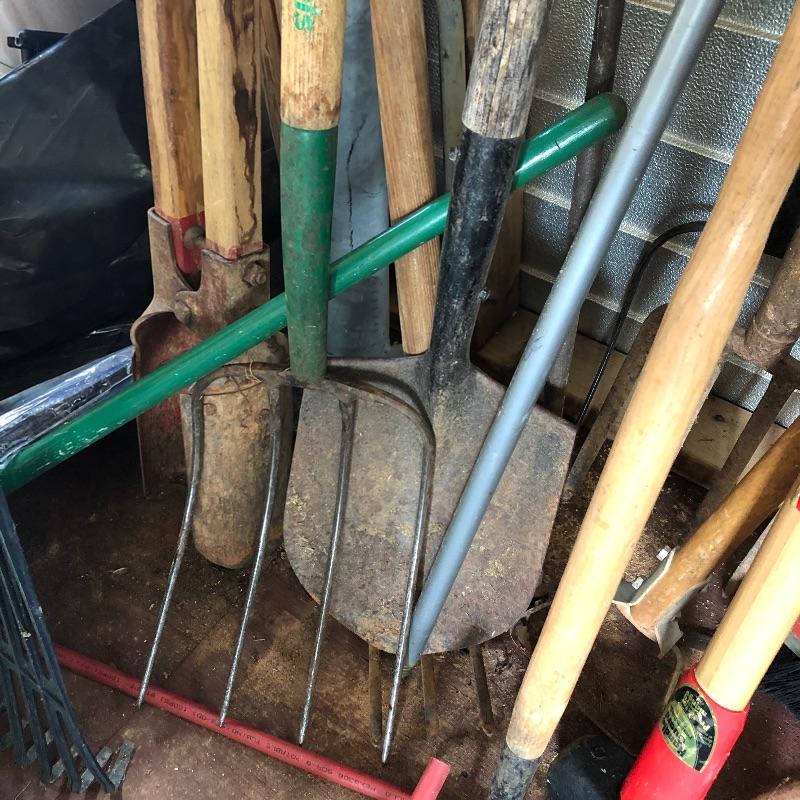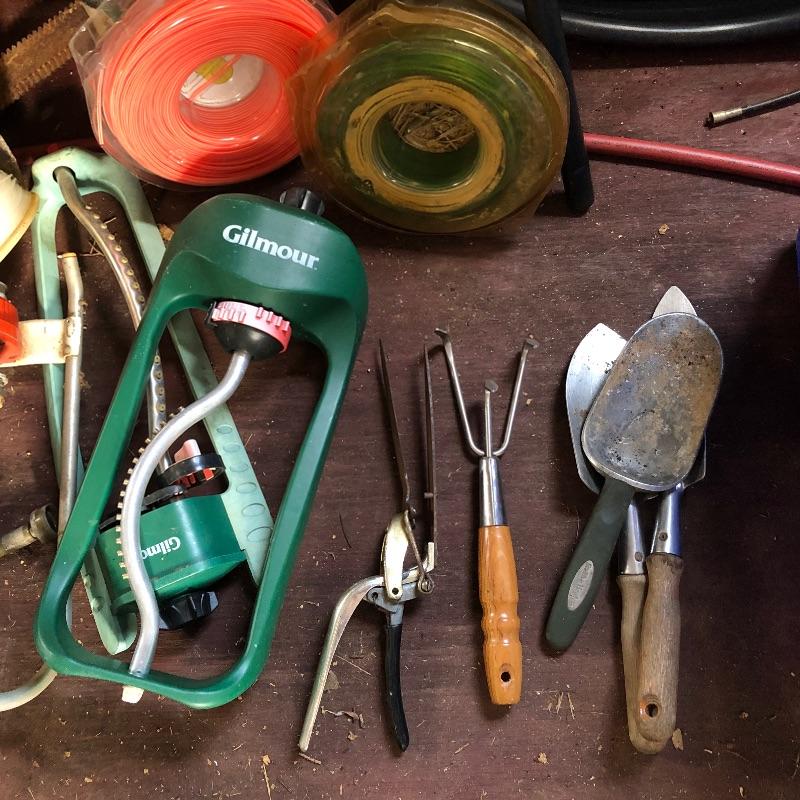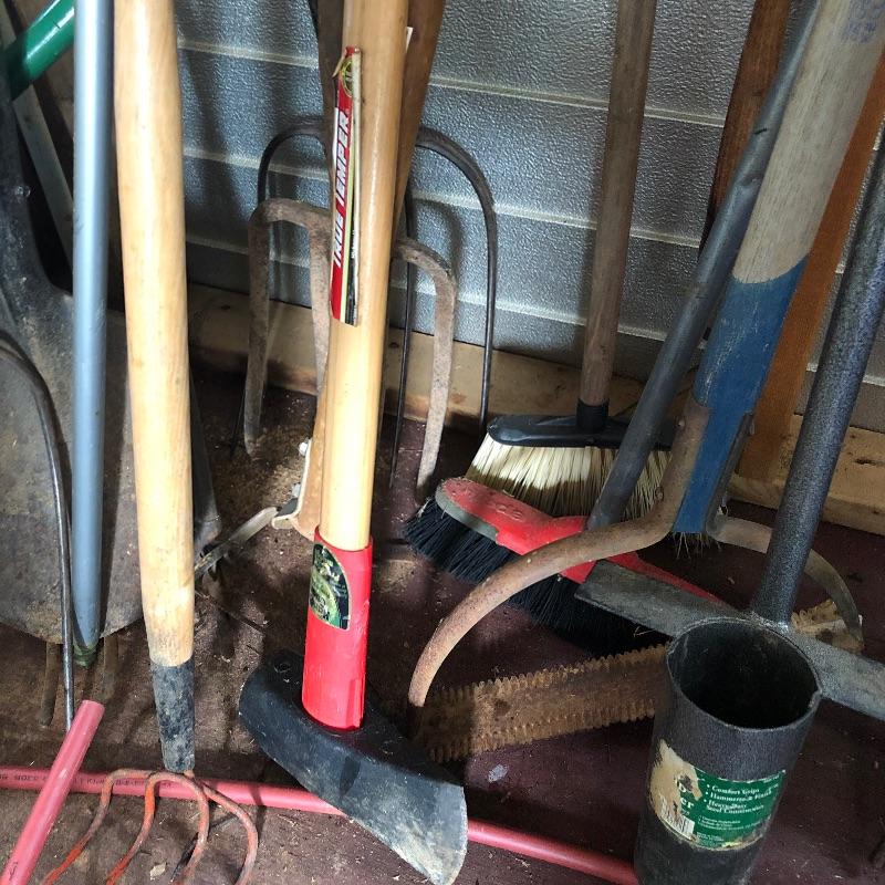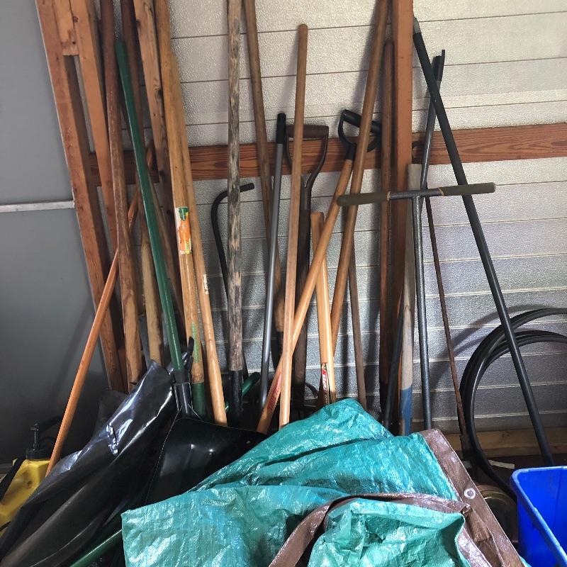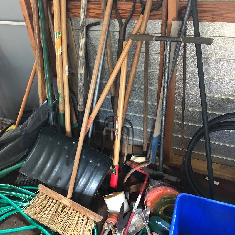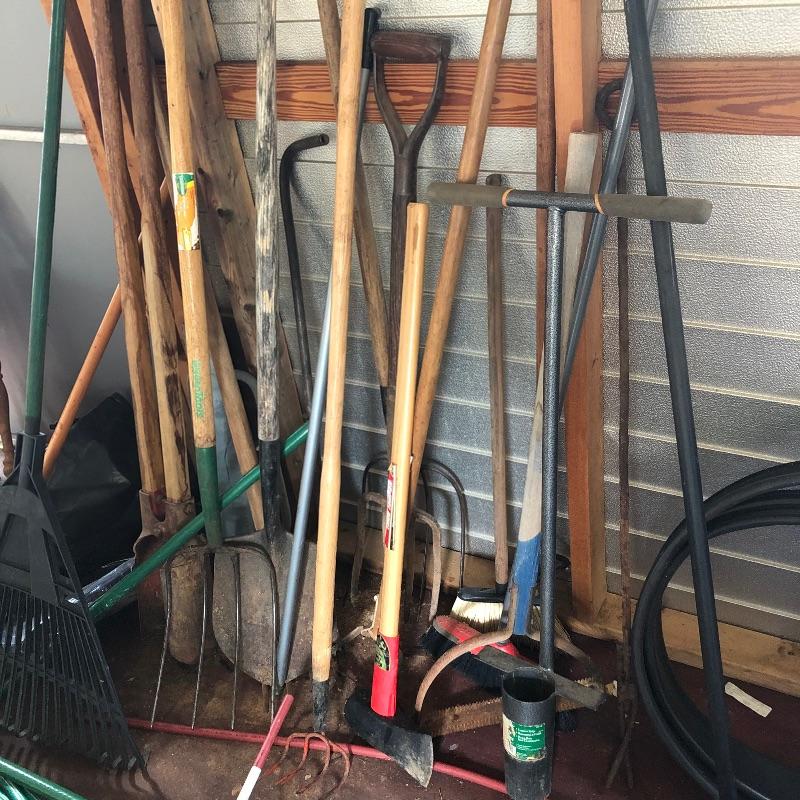 Everything you need to maintain your yard! This lot includes brooms, rakes, sprinklers, hand shovels, a tarp, a pitchfork, a hose, and more! Most of the handheld yard tools measure 40”-60”. Local pickup only.