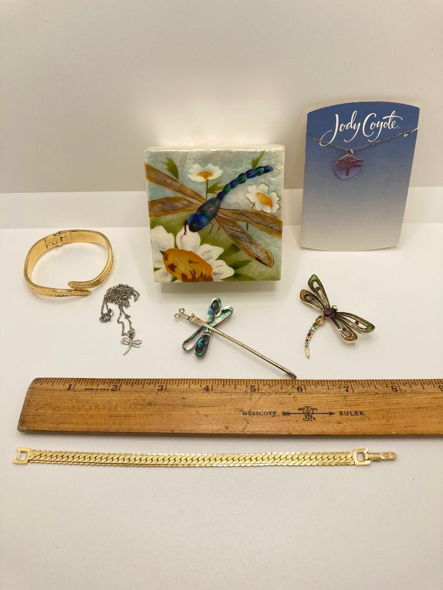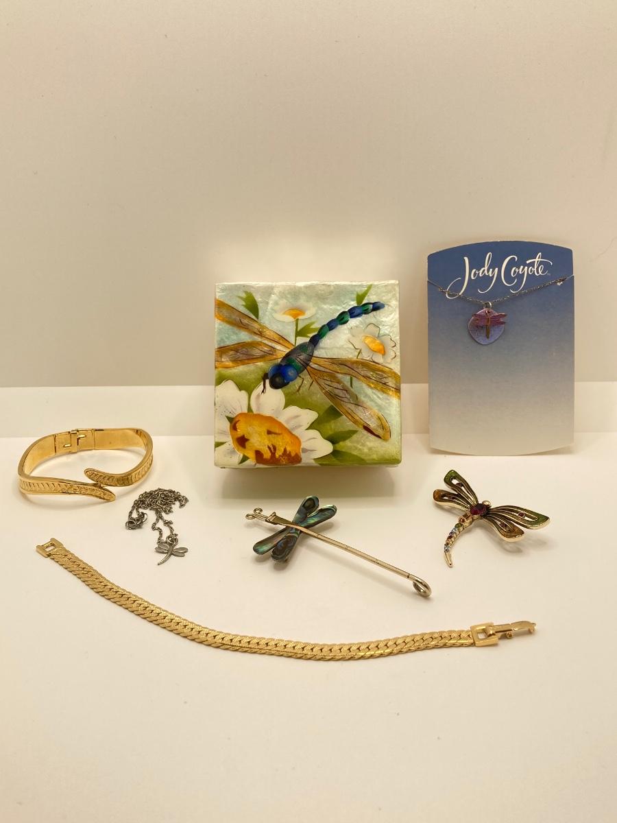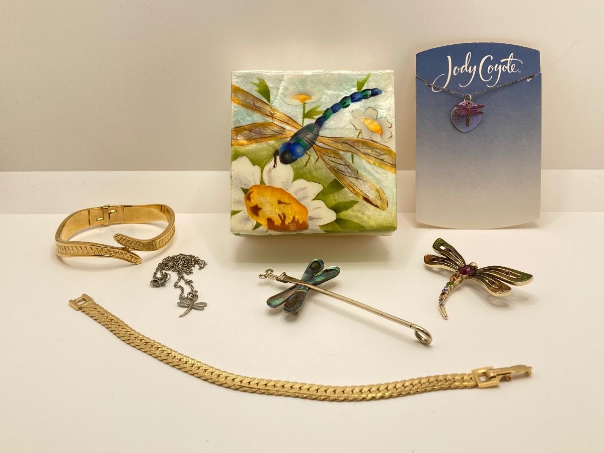 LOT 197: Dragonfly Themed Collection, Airbrushed Shell Trinket Box and Monet Jewelry