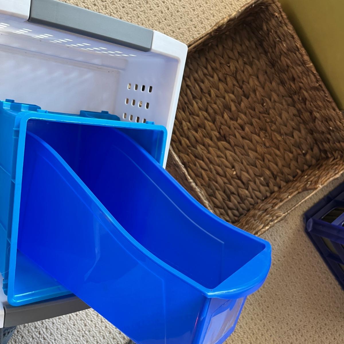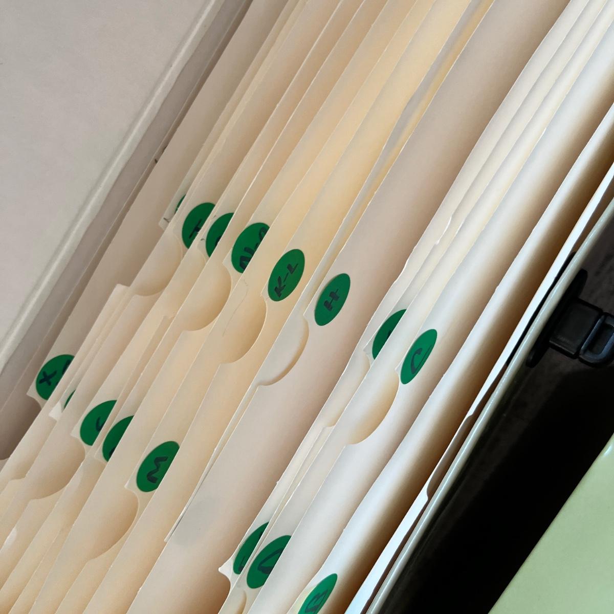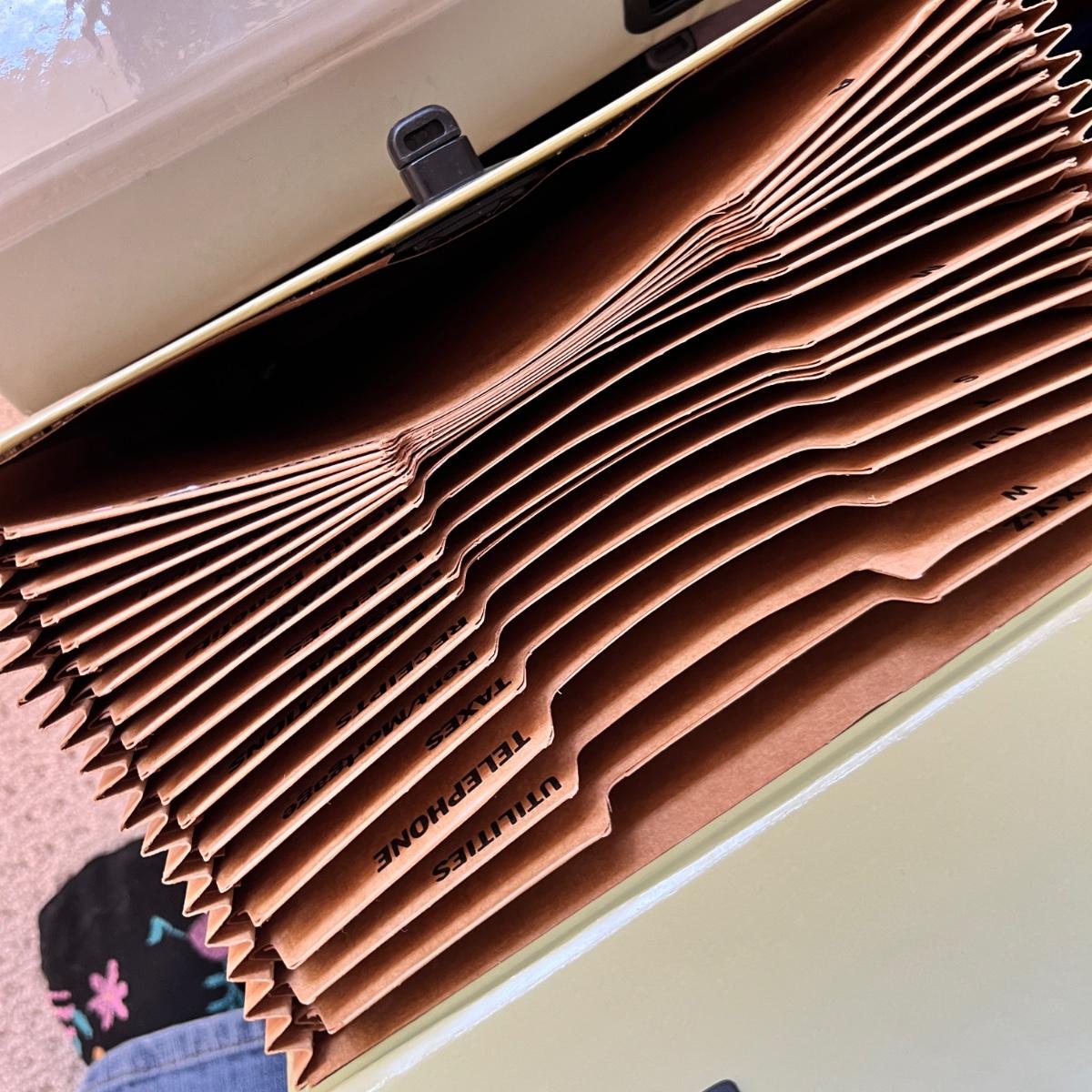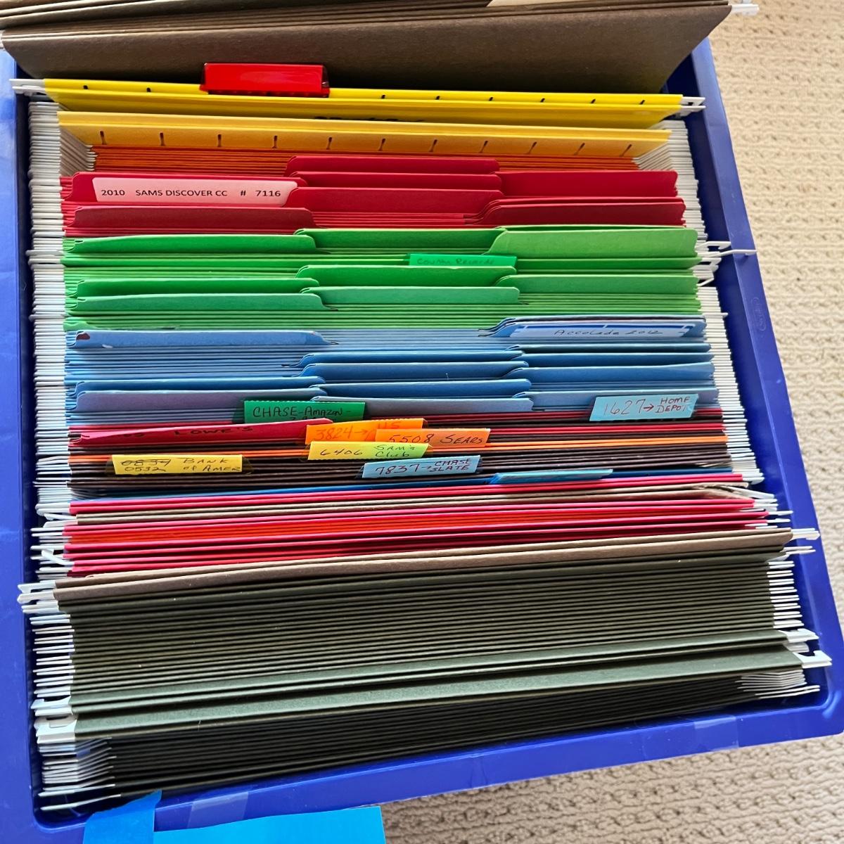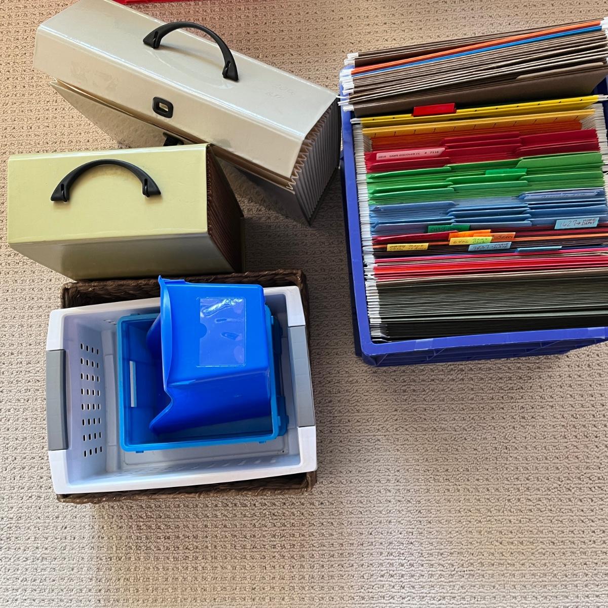 plastic milk crate of file folders, expanding file folders, 4 sizes of baskets