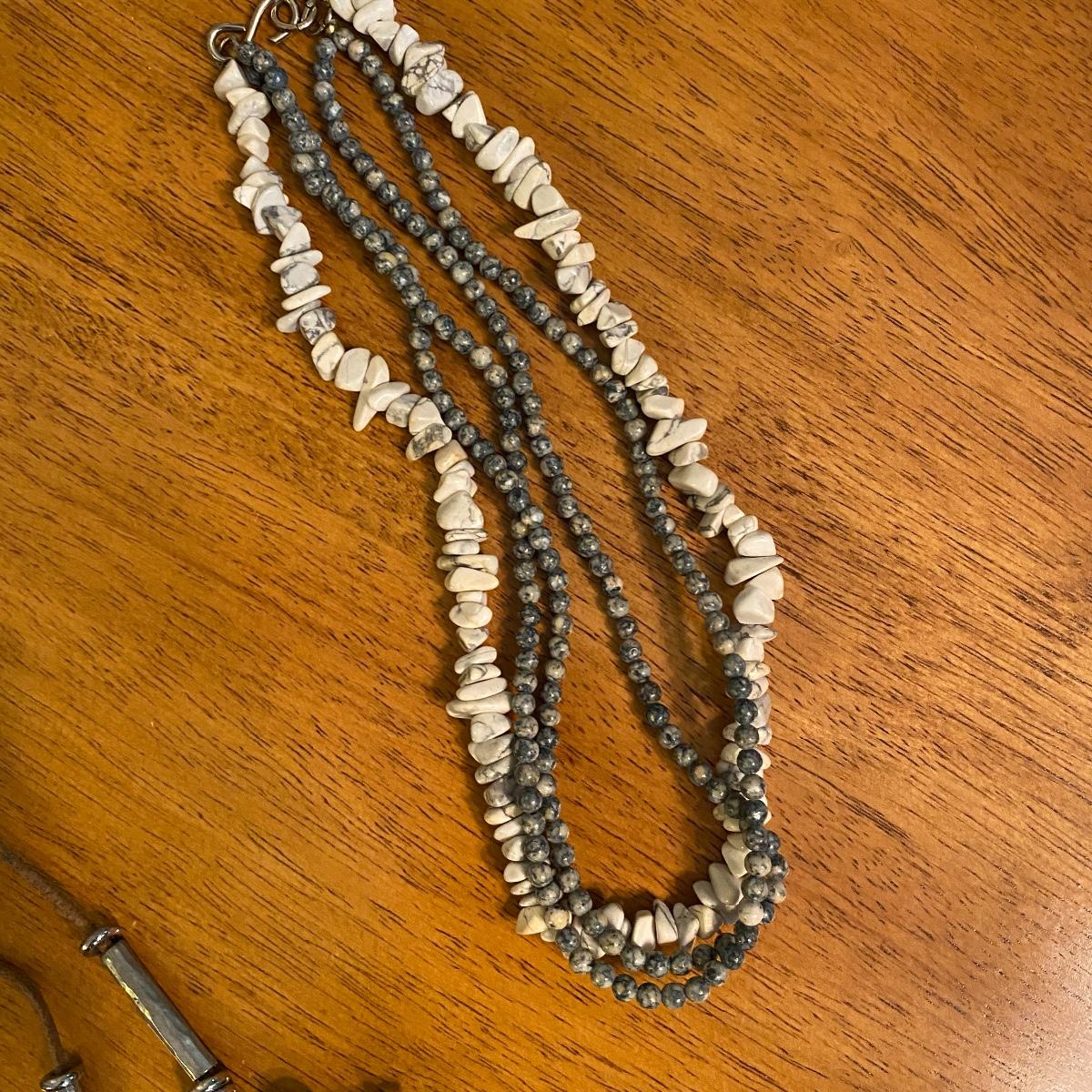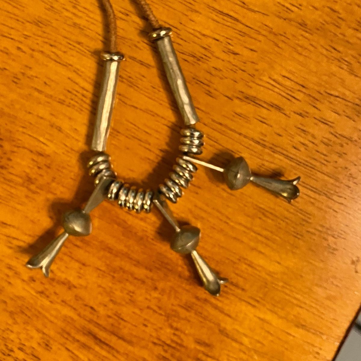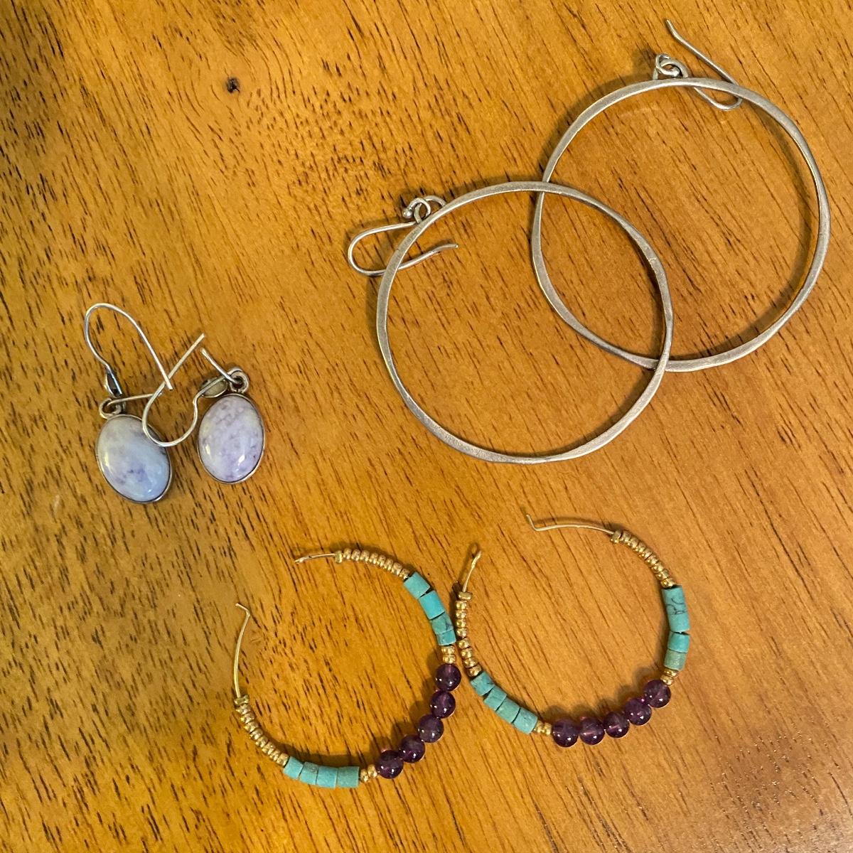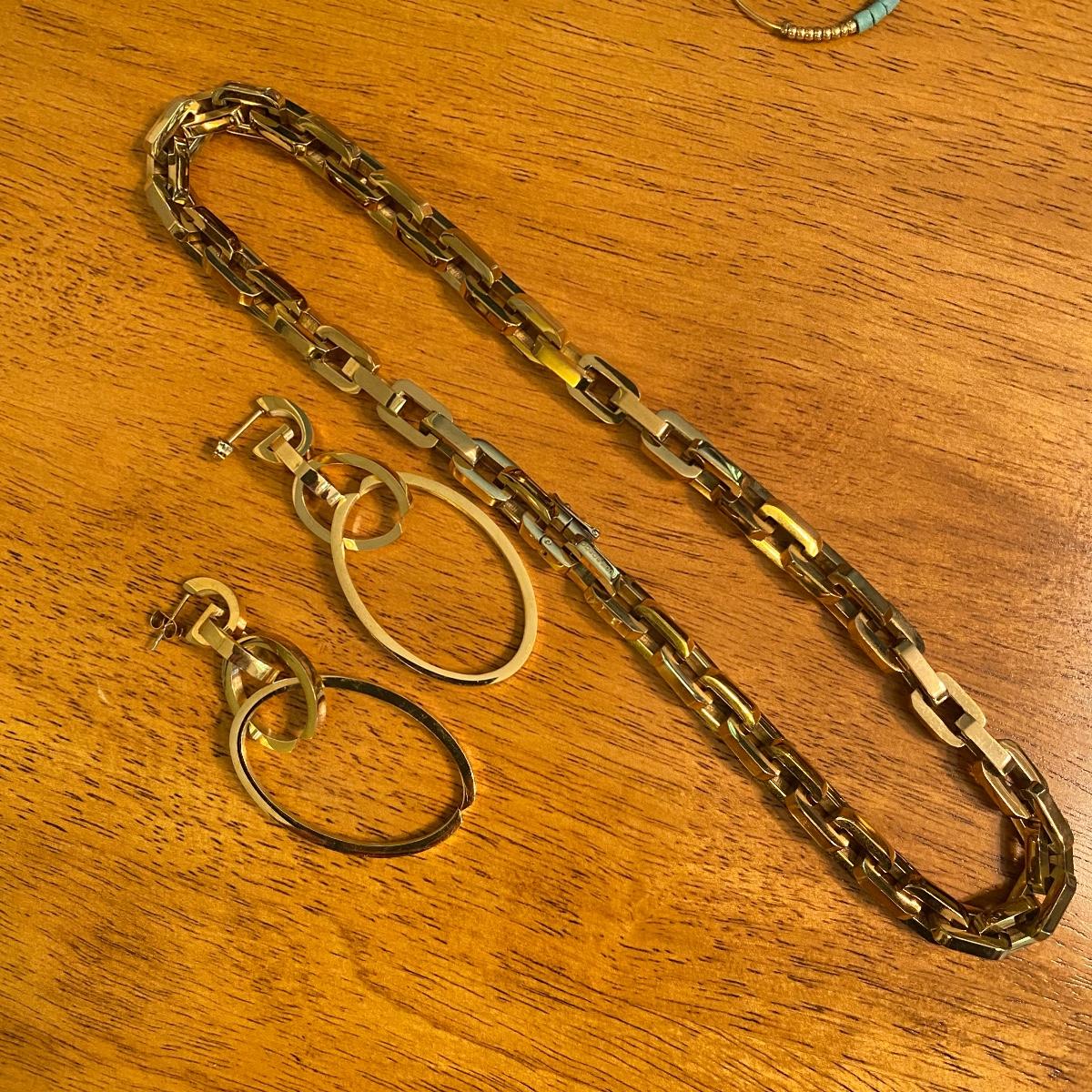Here’s a nice mix of fun jewelry. It includes a gold colored set of earrings and necklace that is chain link. The necklace is marked “ Eddie Borgo” It also includes two beaded necklaces, three earrings and one leather and silver necklace. No marks found on other pieces. Shipping available