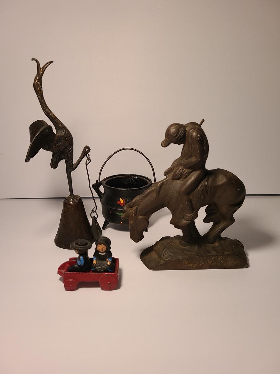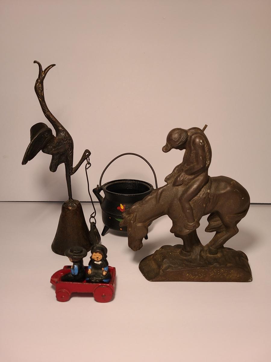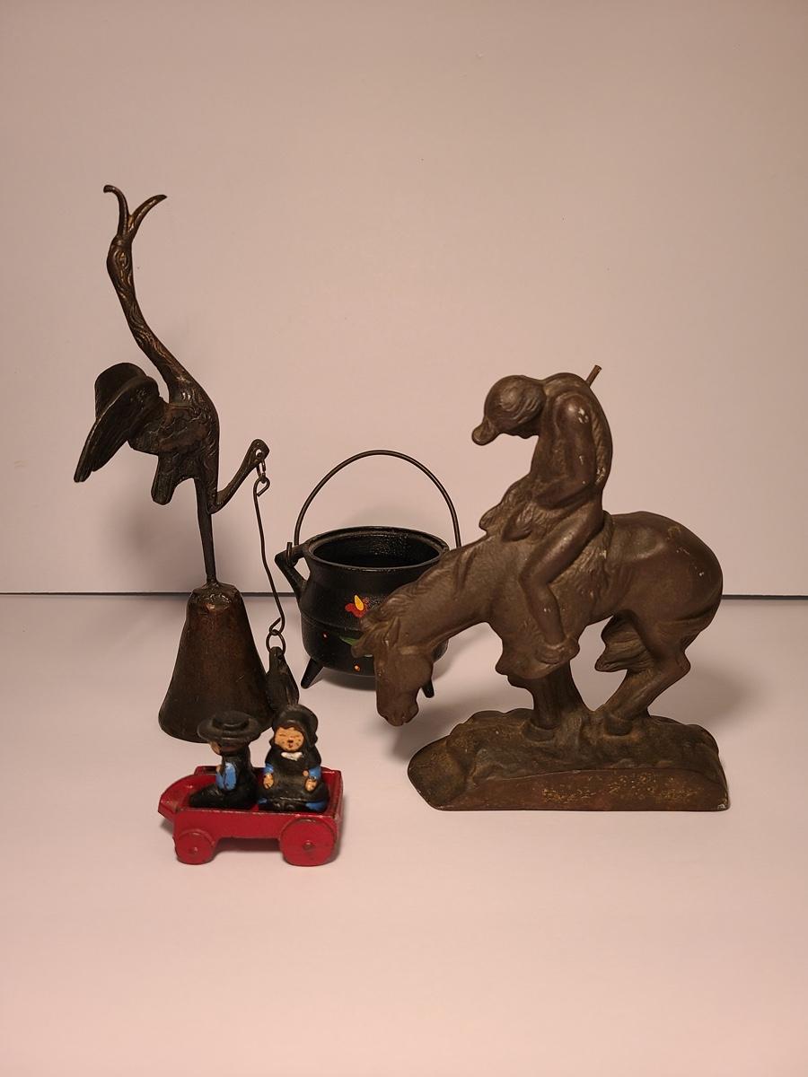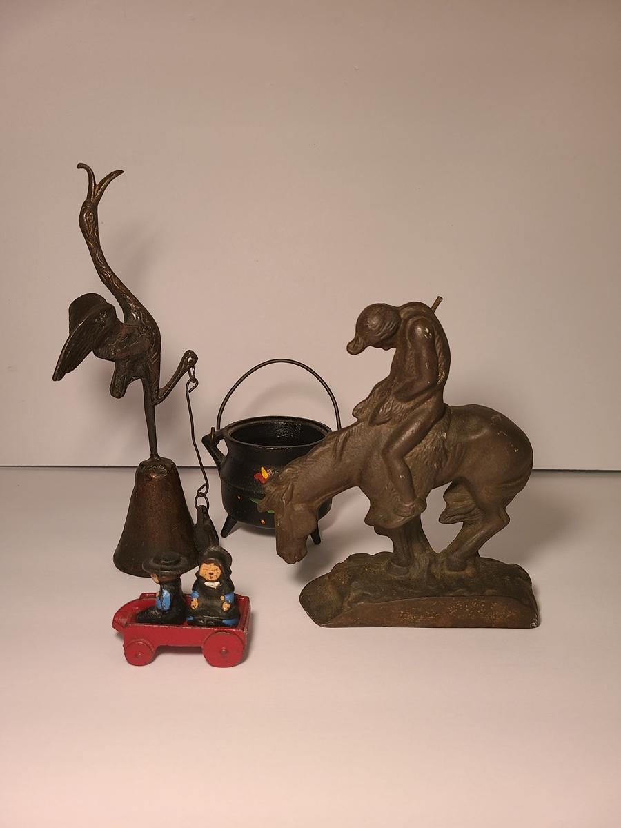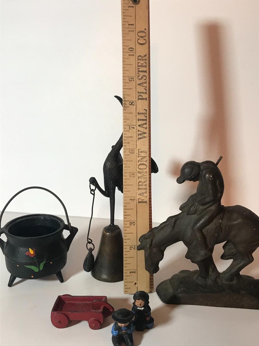 Amish boy and girl on wagon, a caldron, a door stop of horse and rider, and a crane on a bell. Please see all pictures as they are the best representation of the items. The pictures show condition, measurements if taken, and what is included in the lot. Due to the large amount that we photograph and the time frame, we are not always able to take measurements. All items unless noted, are pre-owned and have been used. If you purchased furniture, you must bring help. We do not allow one person to carry large furniture out on their own. Bring help, tools and a truck for the safety of our client’s homes, and your personal safety. Company policy. Thank you.