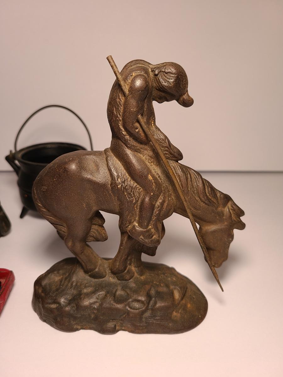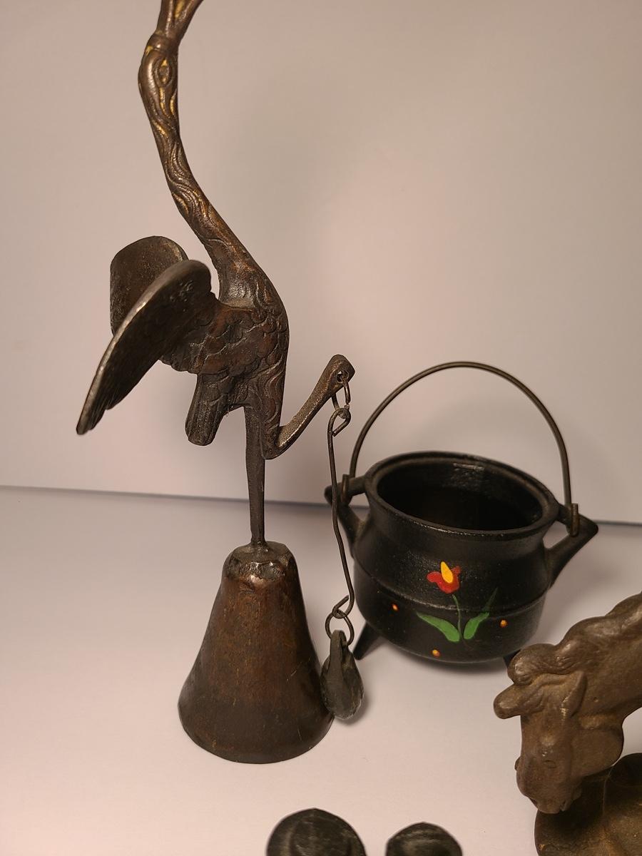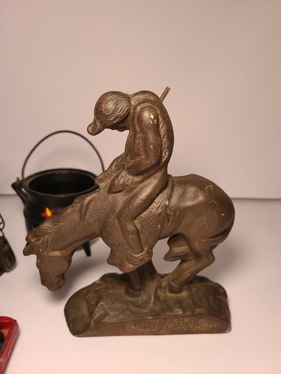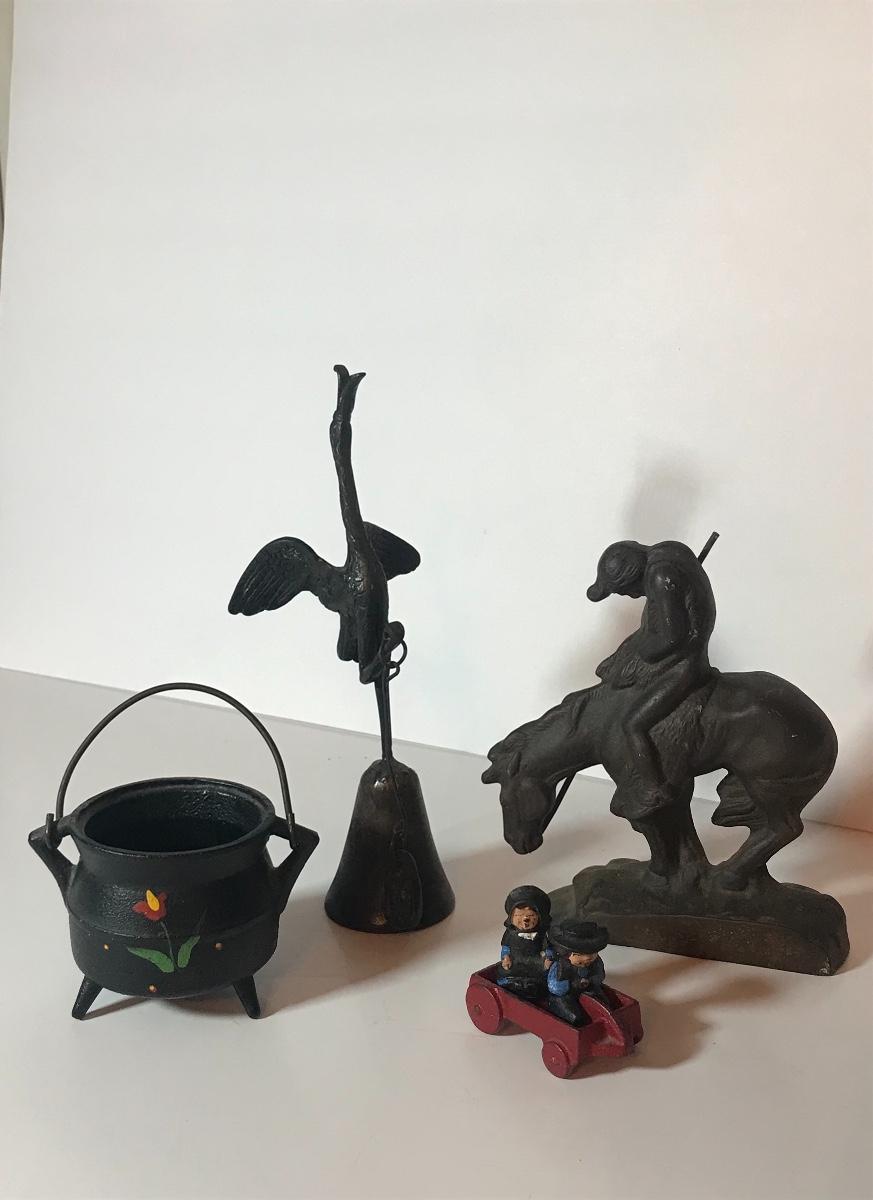Amish boy and girl on wagon, a caldron, a door stop of horse and rider, and a crane on a bell. Please see all pictures as they are the best representation of the items. The pictures show condition, measurements if taken, and what is included in the lot. Due to the large amount that we photograph and the time frame, we are not always able to take measurements. All items unless noted, are pre-owned and have been used. If you purchased furniture, you must bring help. We do not allow one person to carry large furniture out on their own. Bring help, tools and a truck for the safety of our client’s homes, and your personal safety. Company policy. Thank you.
