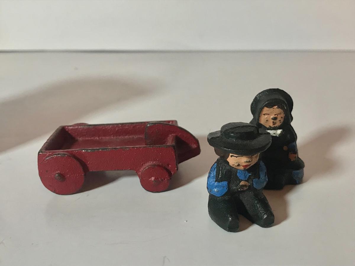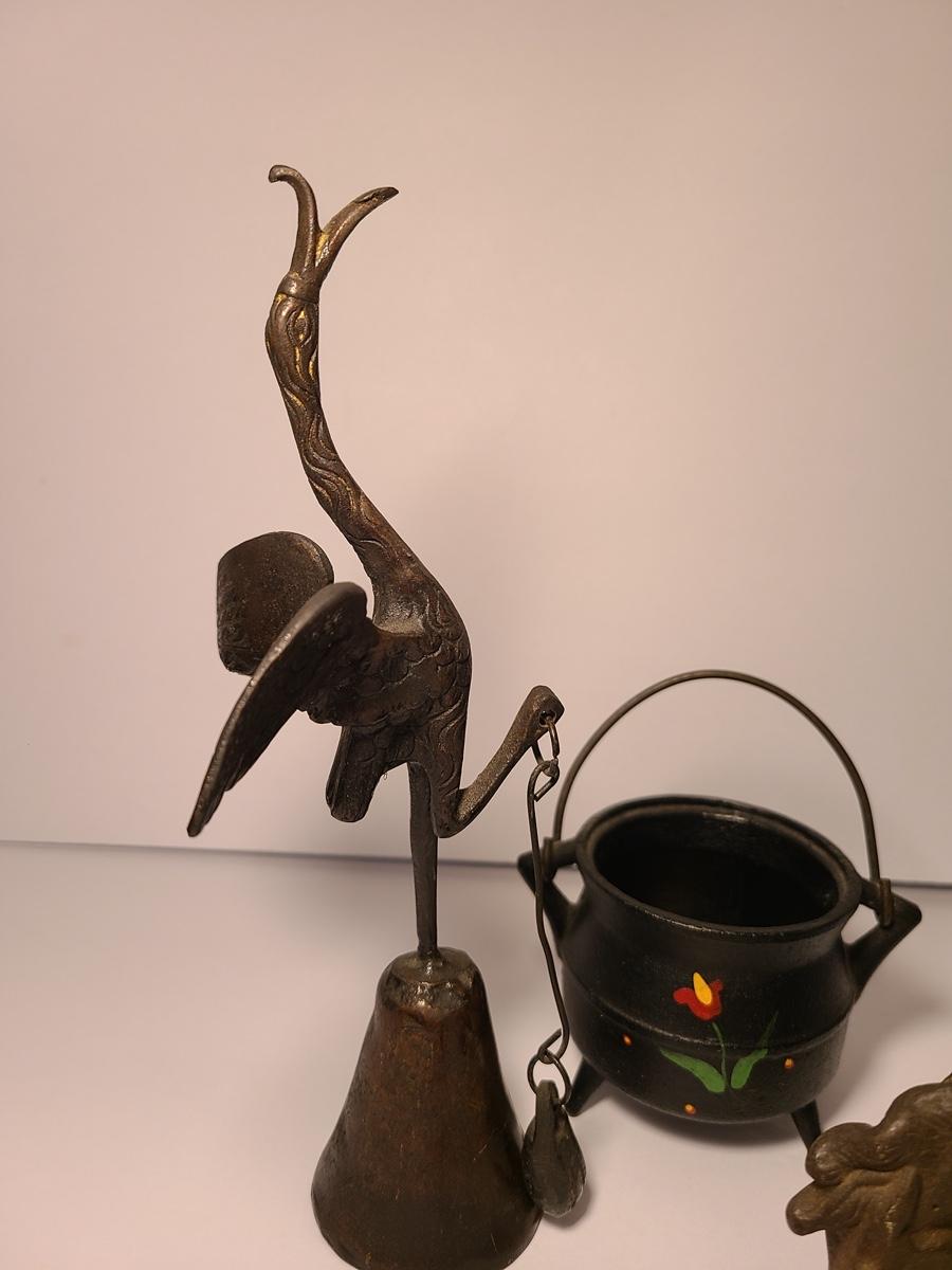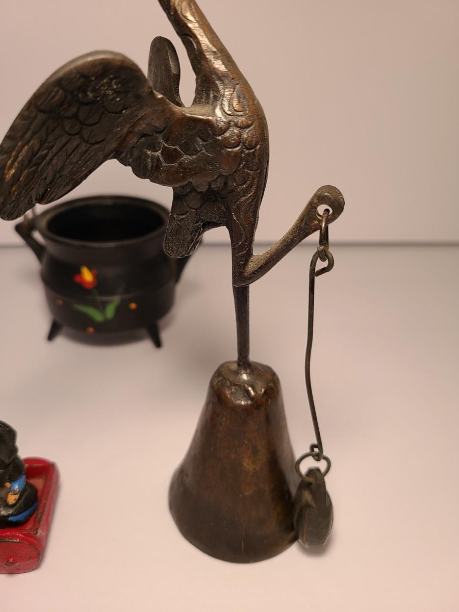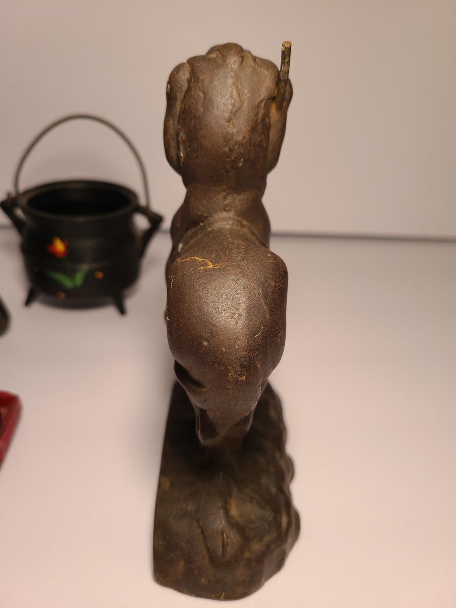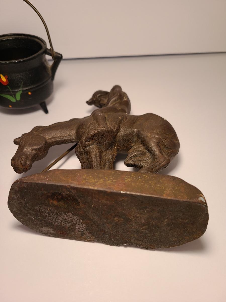 Amish boy and girl on wagon, a caldron, a door stop of horse and rider, and a crane on a bell. Please see all pictures as they are the best representation of the items. The pictures show condition, measurements if taken, and what is included in the lot. Due to the large amount that we photograph and the time frame, we are not always able to take measurements. All items unless noted, are pre-owned and have been used. If you purchased furniture, you must bring help. We do not allow one person to carry large furniture out on their own. Bring help, tools and a truck for the safety of our client’s homes, and your personal safety. Company policy. Thank you.