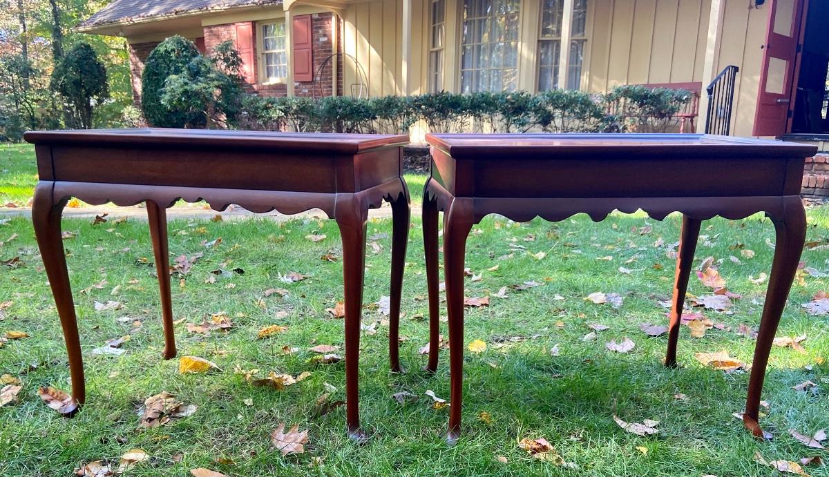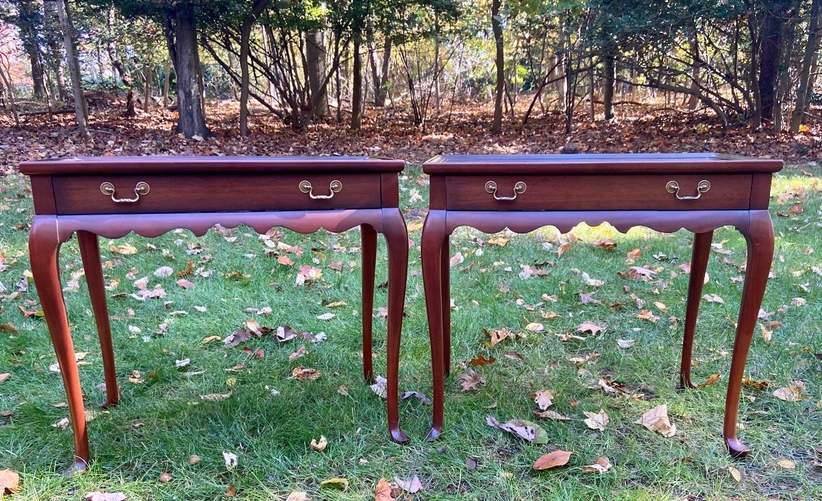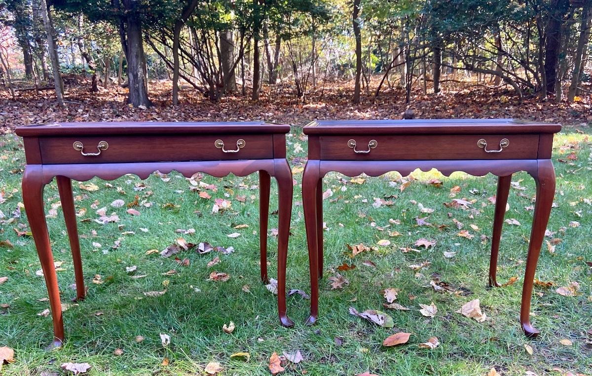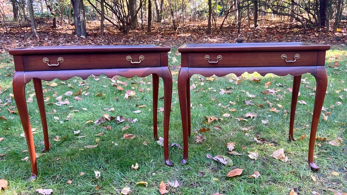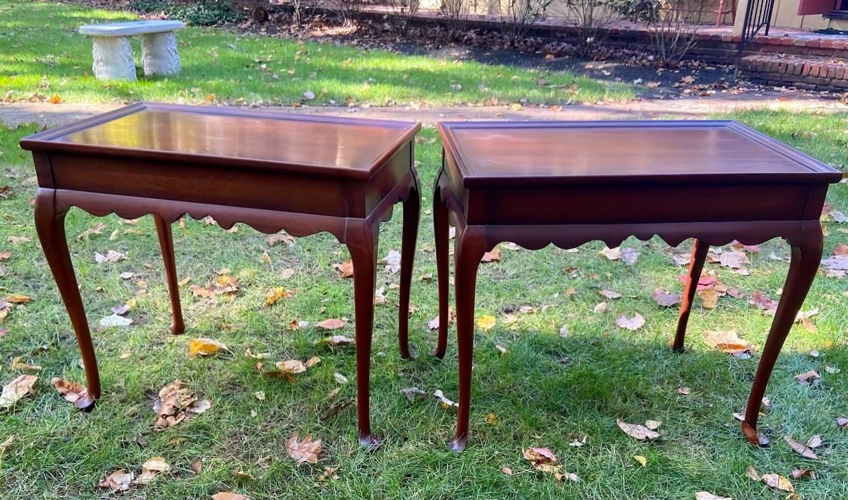 Antique Mahogany bedside/end tables with Queen Anne legs. 29"L x 18"W x 26"H. Please see all pictures as they are the best representation of the items. The pictures show condition, measurements if taken, and what is included in the lot. Due to the large amount that we photograph and the time frame, we are not always able to take measurements. All items unless noted, are pre-owned and have been used. If you purchased furniture, you must bring help. We do not allow one person to carry large furniture out on their own. Bring help, tools and a truck for the safety of our client’s homes, and your personal safety. Company policy. Thank you.