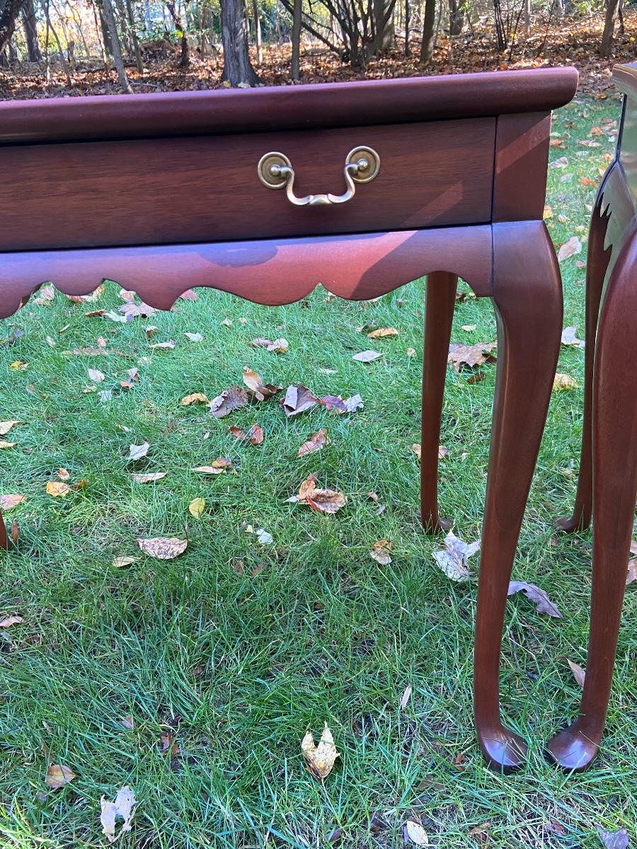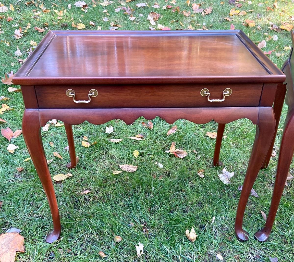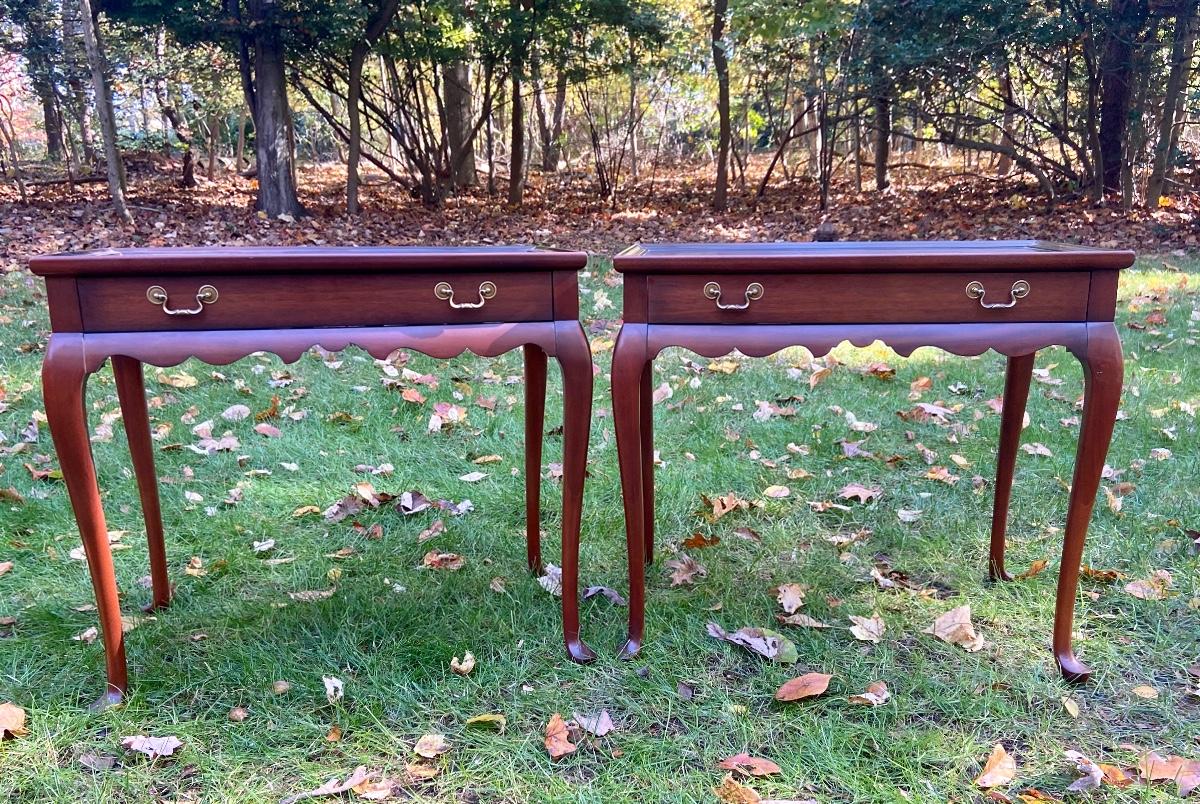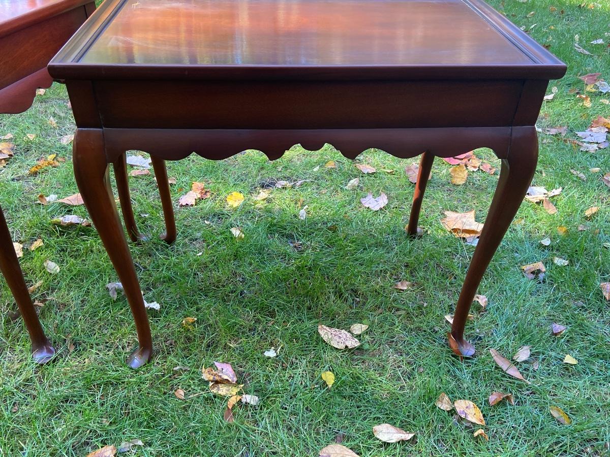 Antique Mahogany bedside/end tables with Queen Anne legs. 29"L x 18"W x 26"H. Please see all pictures as they are the best representation of the items. The pictures show condition, measurements if taken, and what is included in the lot. Due to the large amount that we photograph and the time frame, we are not always able to take measurements. All items unless noted, are pre-owned and have been used. If you purchased furniture, you must bring help. We do not allow one person to carry large furniture out on their own. Bring help, tools and a truck for the safety of our client’s homes, and your personal safety. Company policy. Thank you.