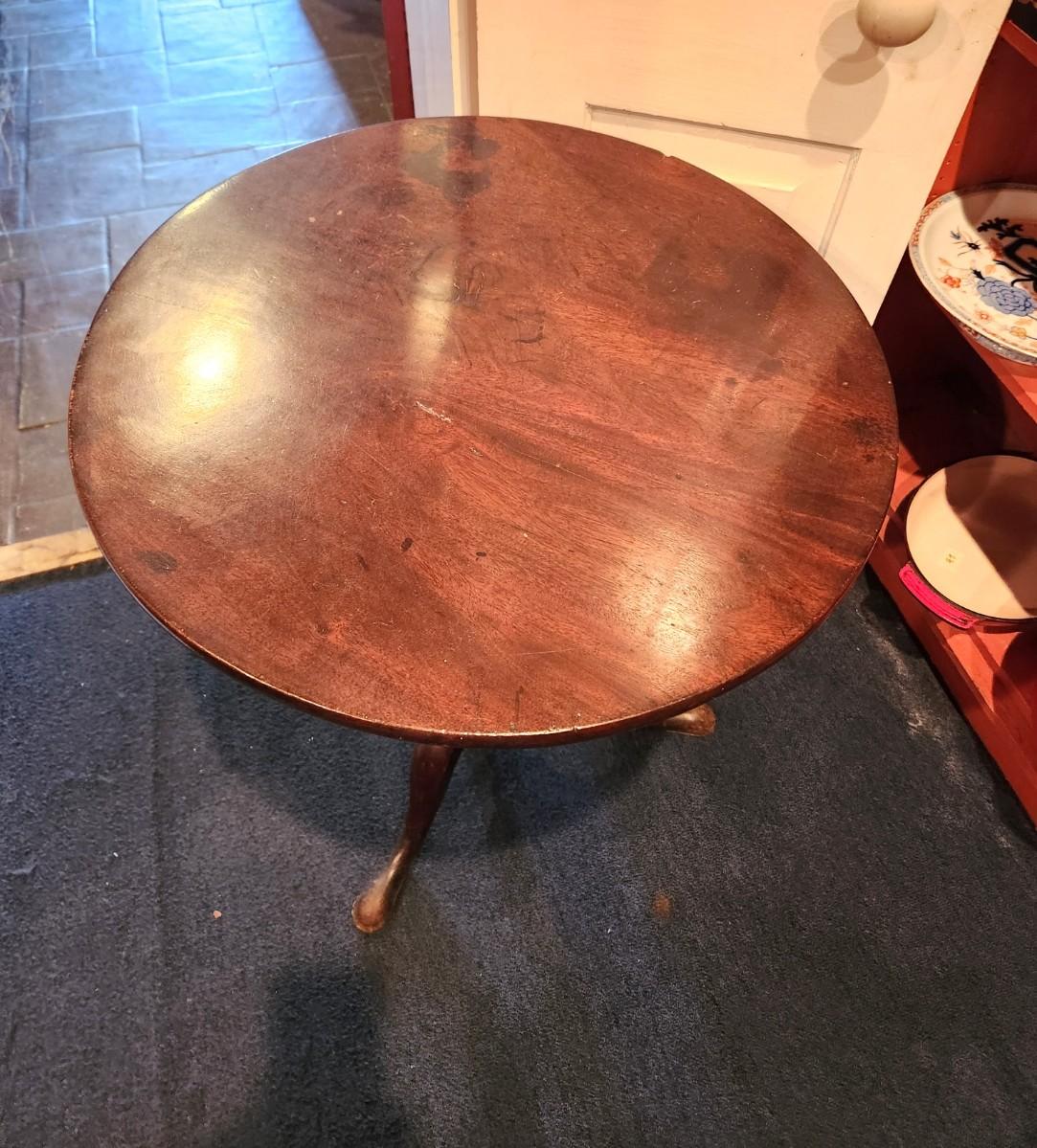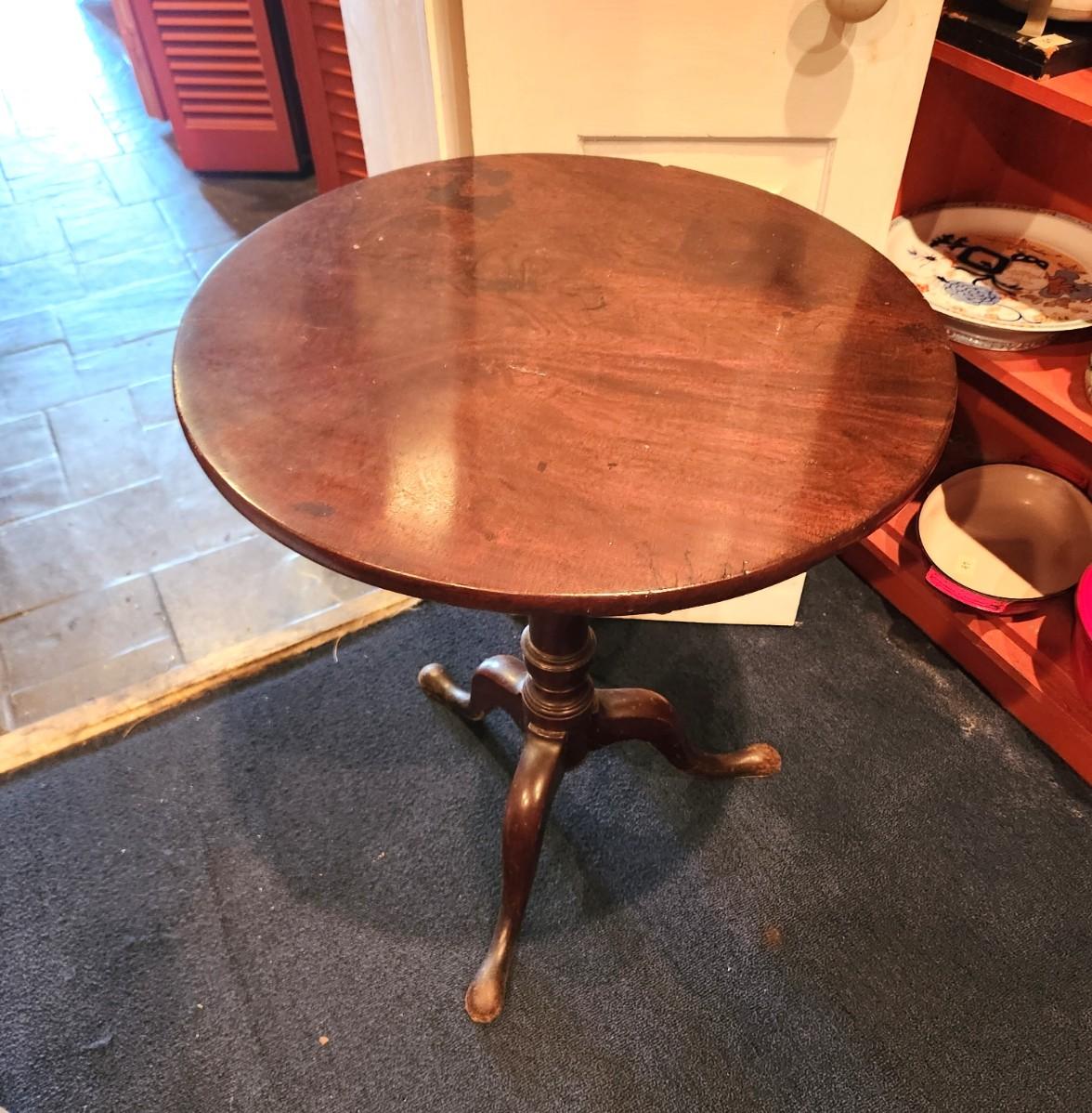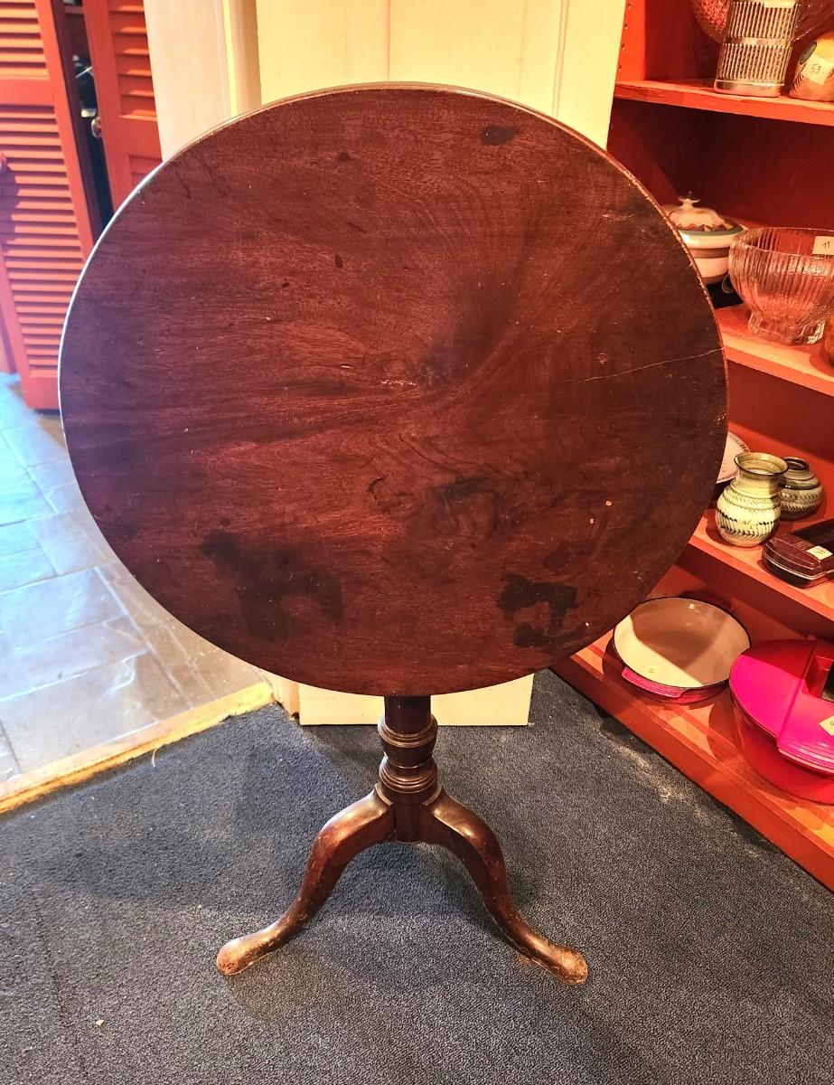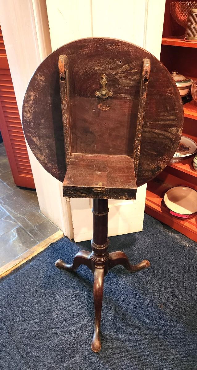 This antique tilt top table is likely from the late 19th century - works fine - three legs, antique condition. 23" across, 28" tall when flat, 43" tall when standing up.
