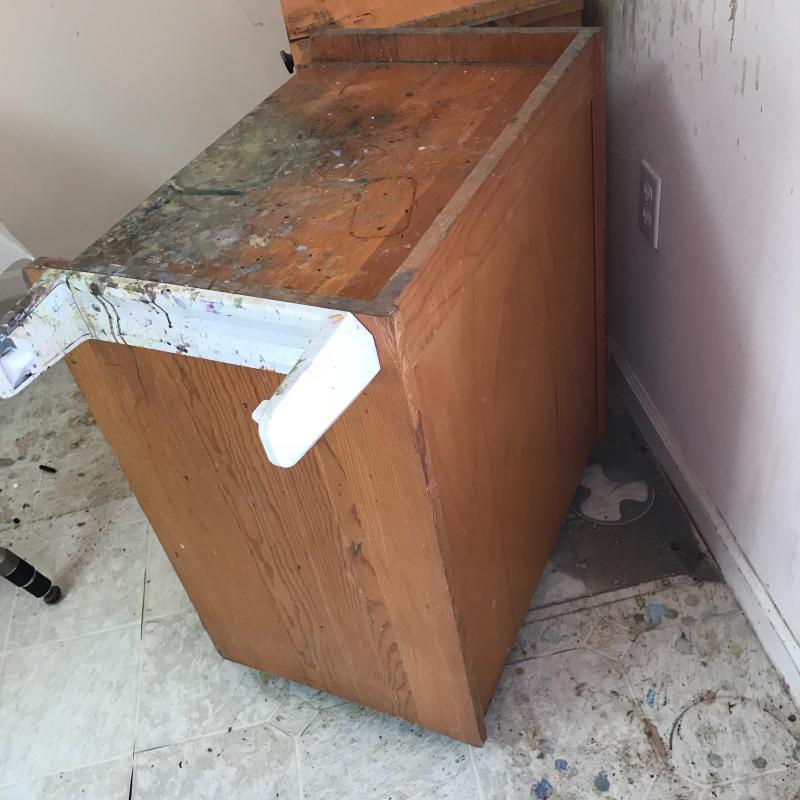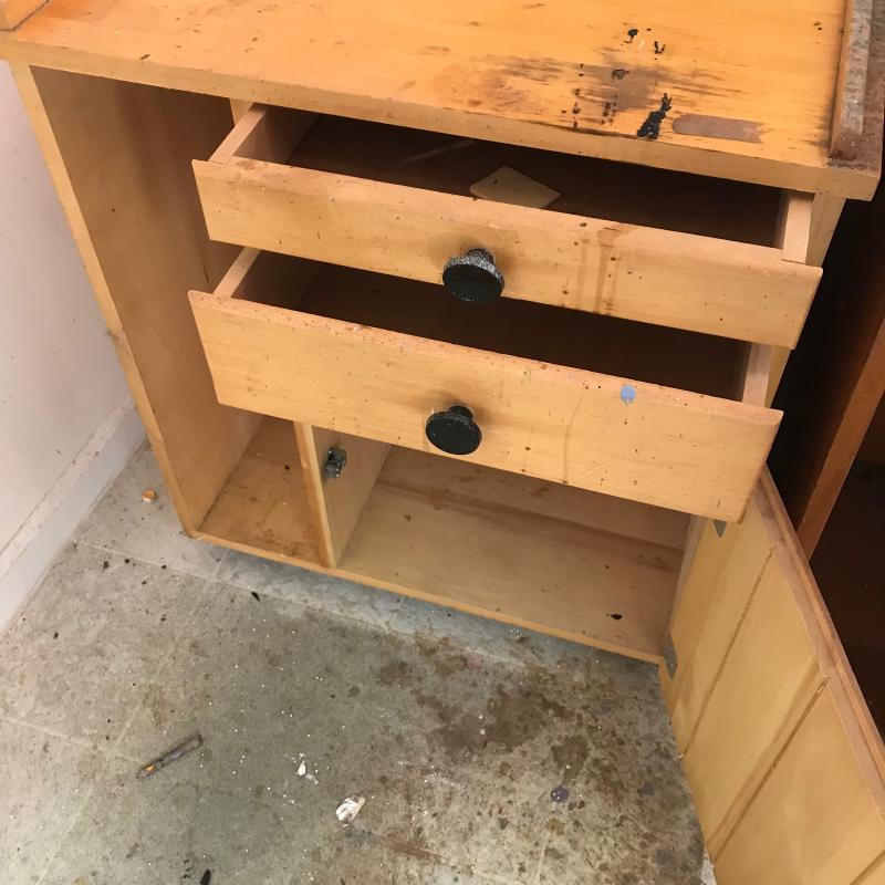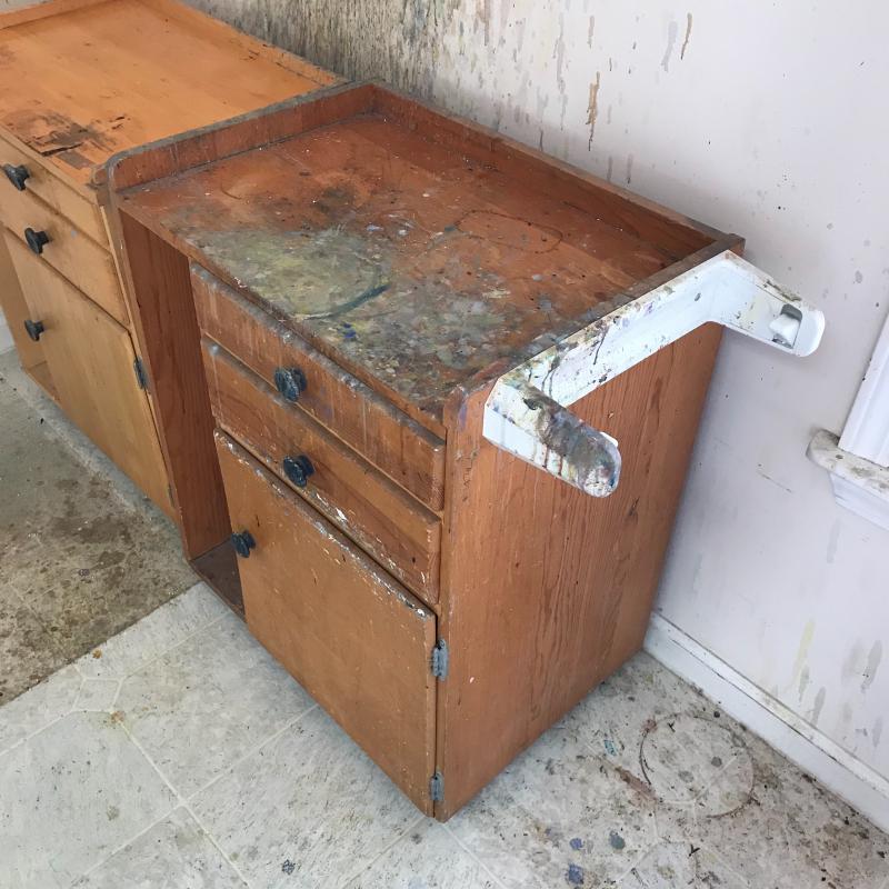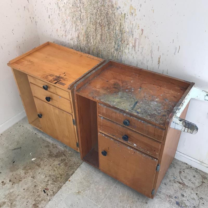 Two wooden work stations with two drawers, cabinet and sketch pad storage shelf each. Each measures approx. 24” 16.5” x 28.5”. Darker wood one has a paper towel holder mounted on one side and is not included in measurement. This lot is available for local pick up in Asheville, NC only.