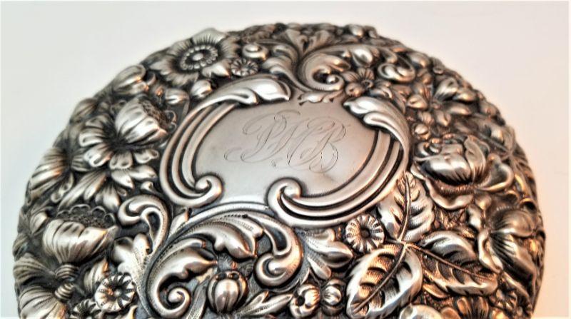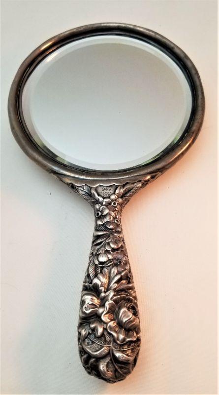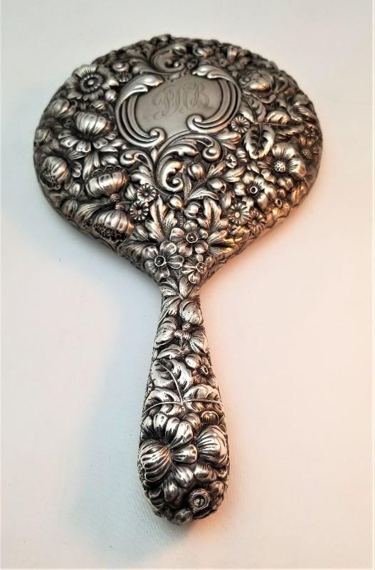 The sterling silver work on this hand mirror is absolutely gorgeous - initials PHB engraved on back - repousse leaves and flowers all over the mirror - mirror itself is beveled and in great condition. This one is a REAL beauty - I couldn't find any flaws. Measures 9.5" tall, about 5 inches across. Early 20th century.