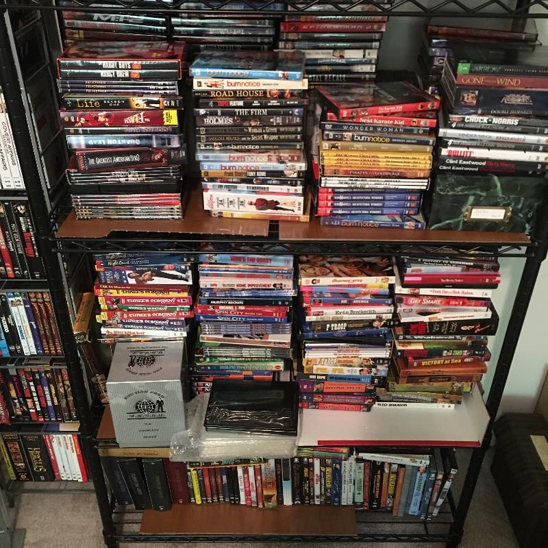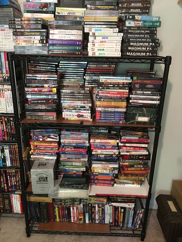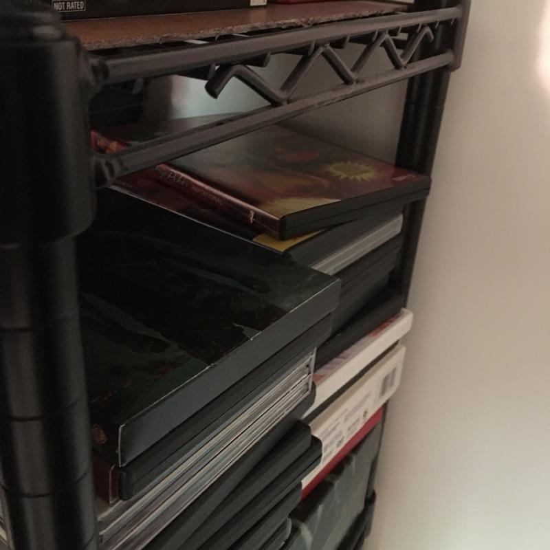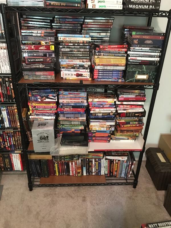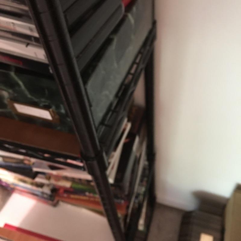 Black metal shelving unit is a great piece to have in your home, it comes apart for easy storage and transport. DVDs not included but available in lot 189. Unit measures 14” x 36” x 53”.