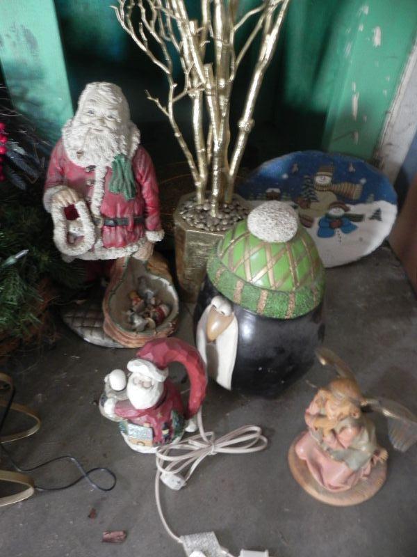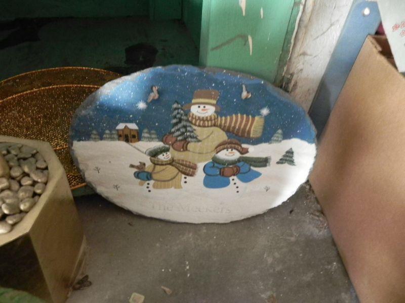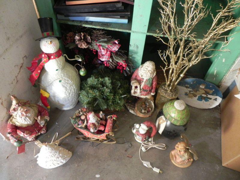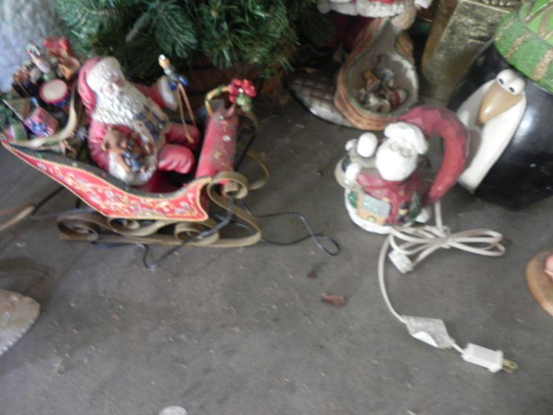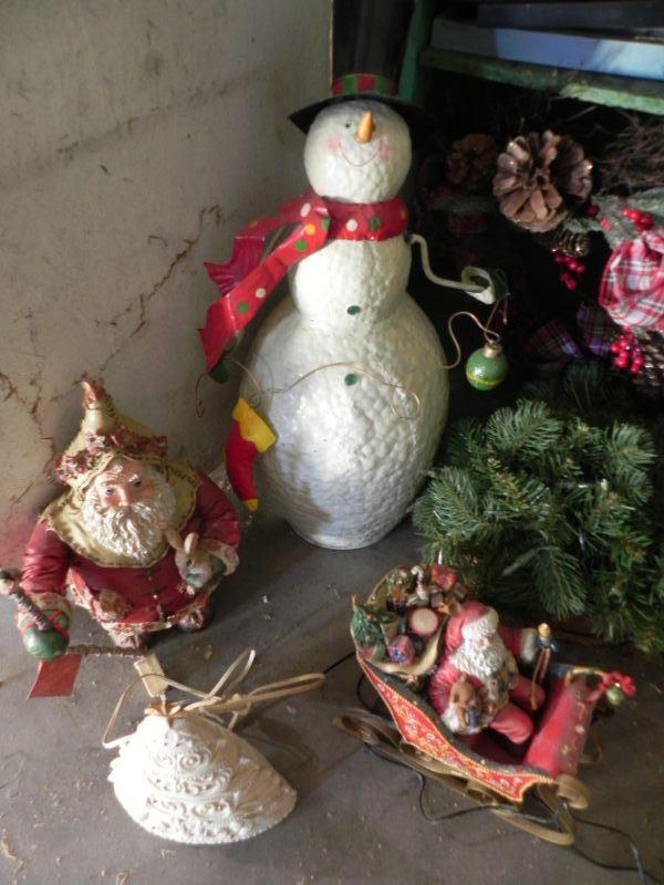 SNOWMAN-SANTA IN SLEIGH -SMALL SANTA LIGHT UP (UNTESTED), WREATH, PAINTED WALL DECOR AND MORE