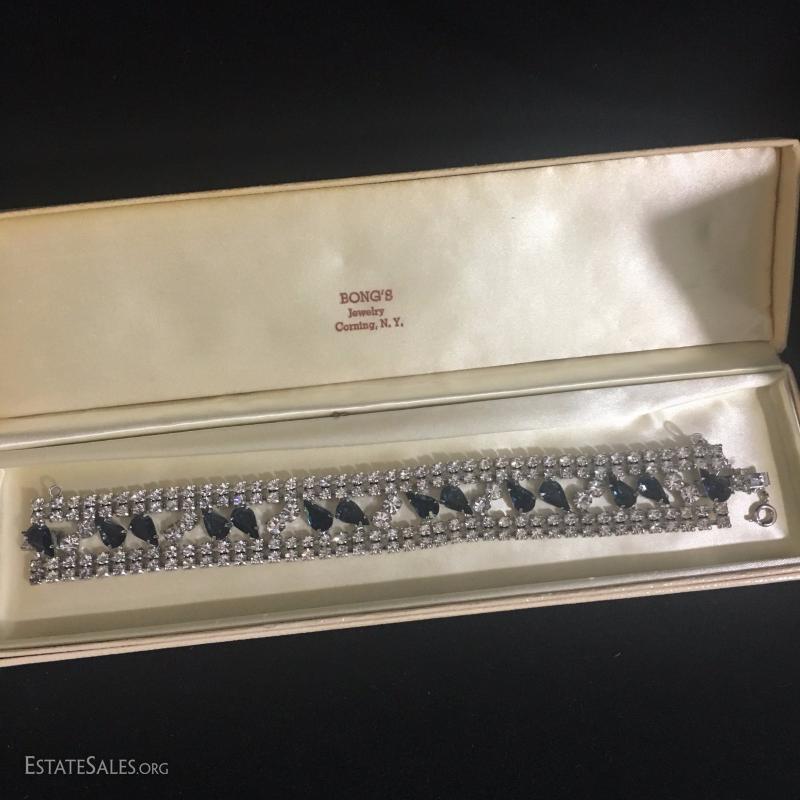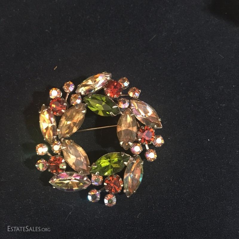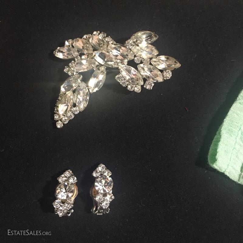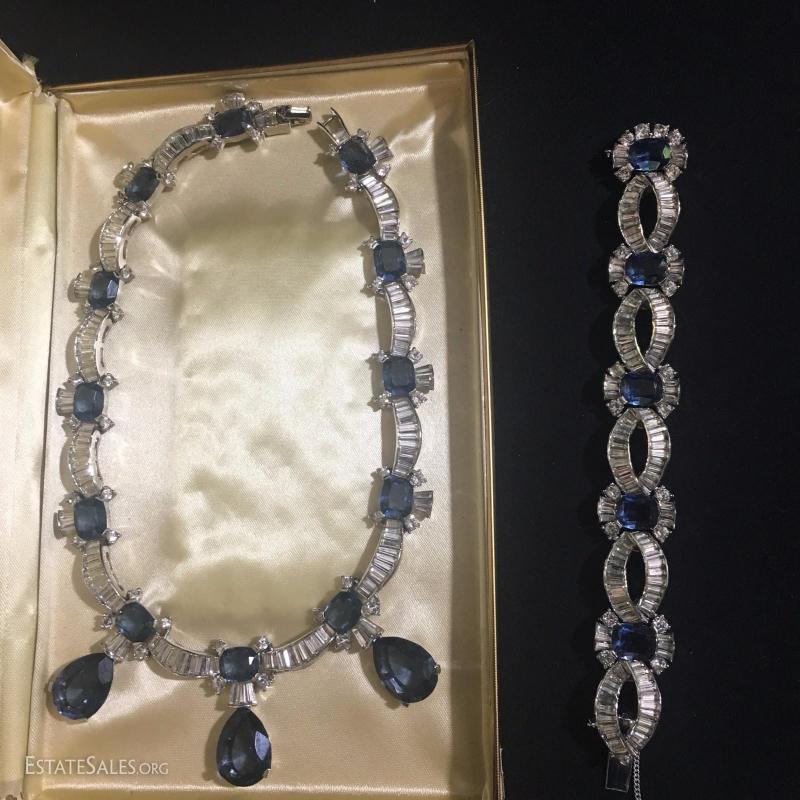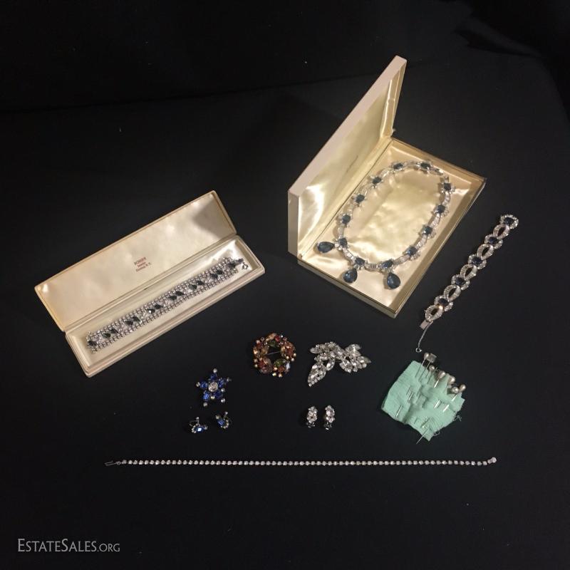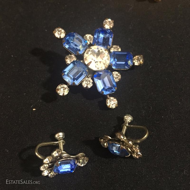 Assorted costume jewelry. Includes Necklace and bracelet set by Joseph Mazer. Blue stone and crystal. Weiss pin. Other pins, earrings and bracelets included. See photos.