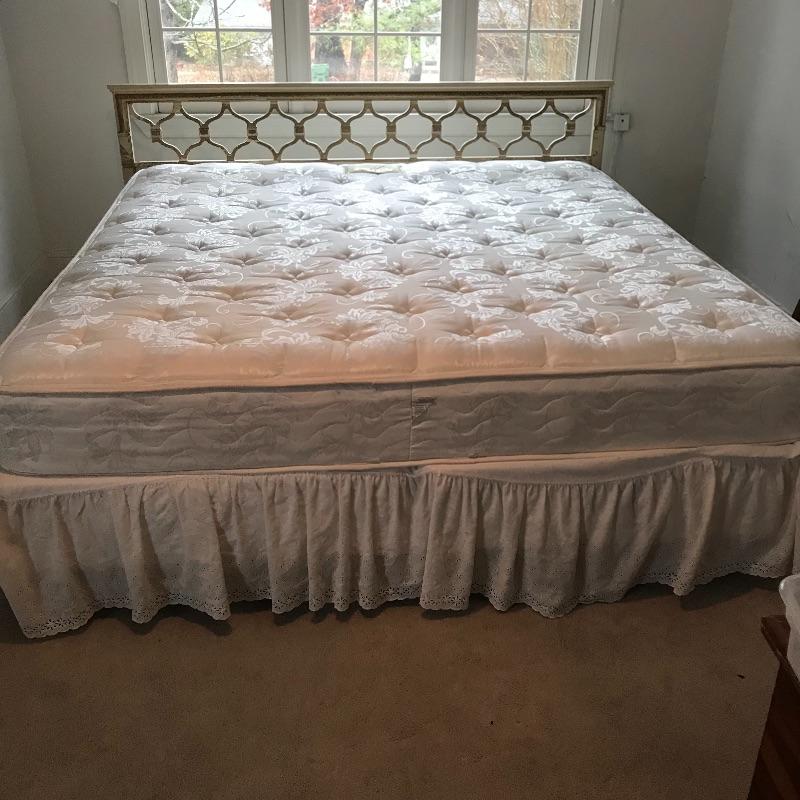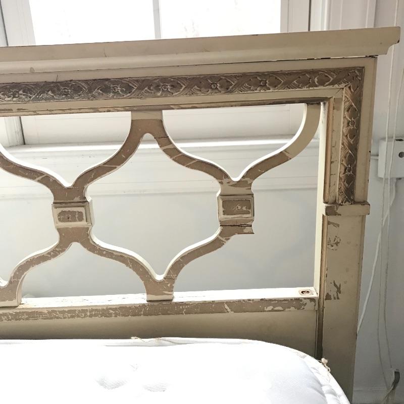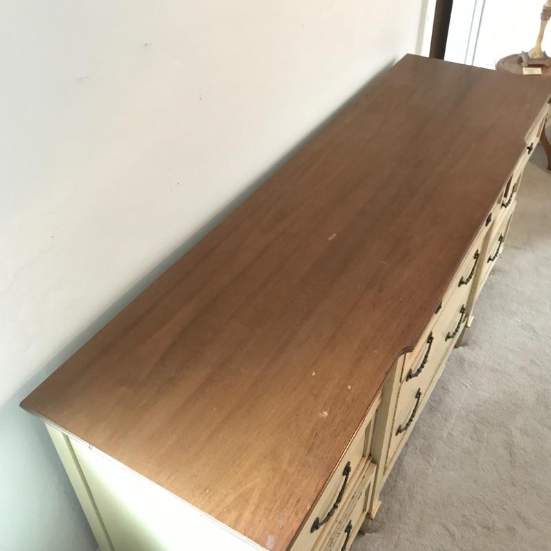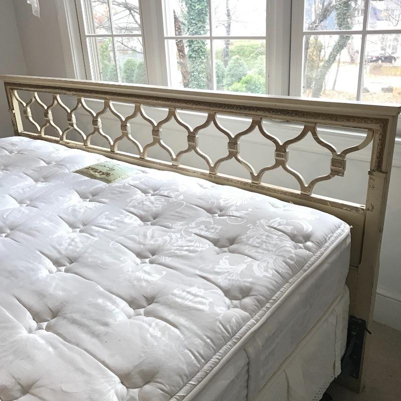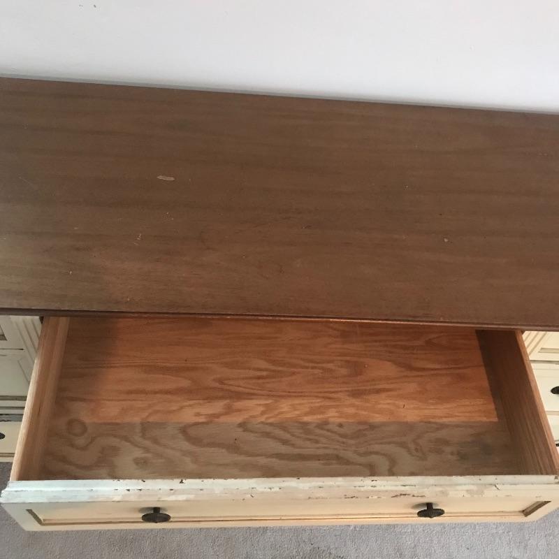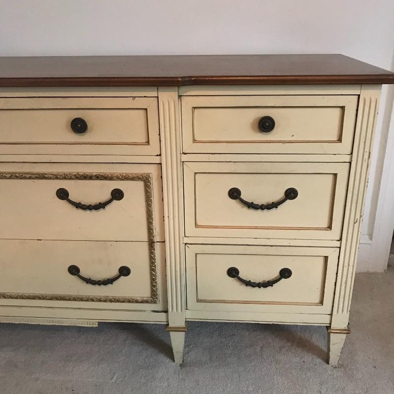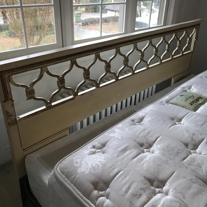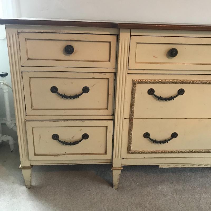 We love matching bedroom furniture! Large nine drawer dresser by Drexel with antique ivory and gold finish. Drawers glide smoothly and appear in newer condition than the style of the dresser. Dresser measures approximately 70” x 21” x 32”. There are a few blemishes on dresser top, see and zoom photos. Dresser is accompanied by a matching wood king headboard and metal bed frame. Headboard measures approximately 80” x 38”. There are two spots where the design is broken, but they are in complementary spots looking as though it was on purpose. Mattress and box springs appear in great shape and they are included if winning bidder desires. See photos for signs of other wear to backside of headboard. Dresser is very heavy and up a flight of stairs, please bring help to load. No shipping.