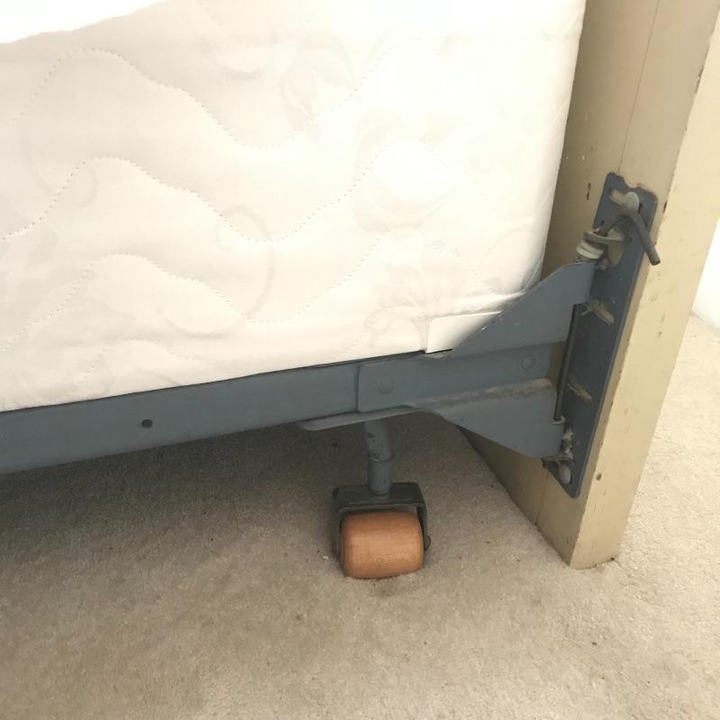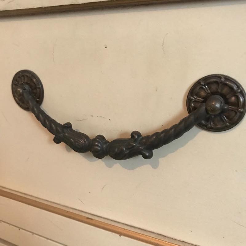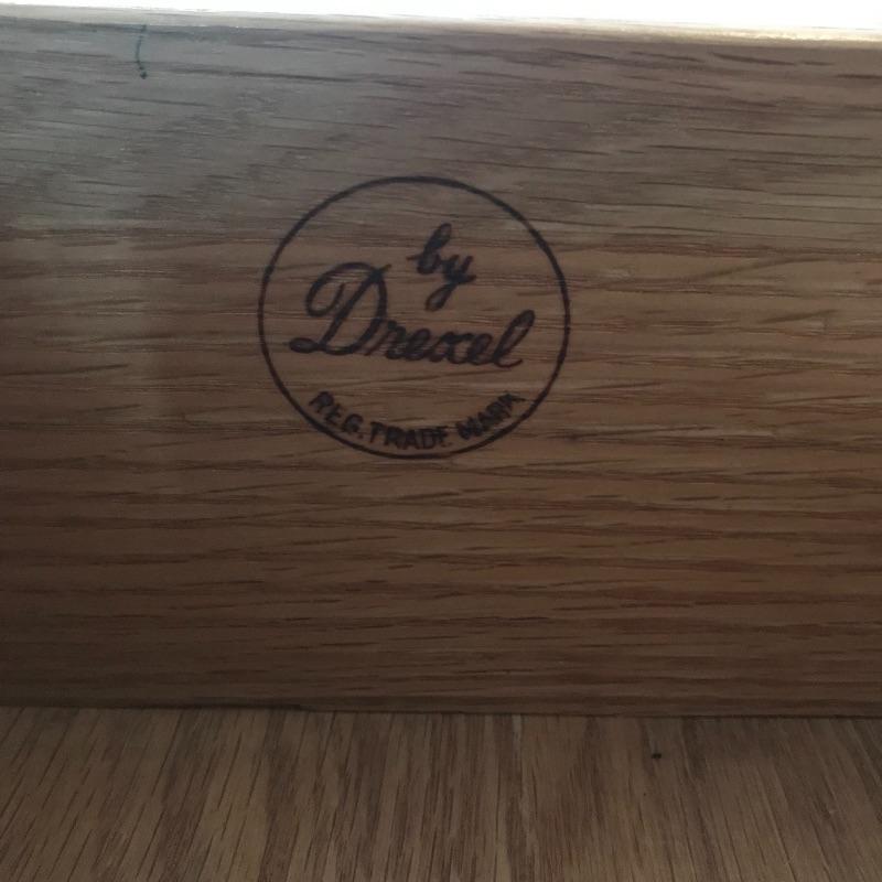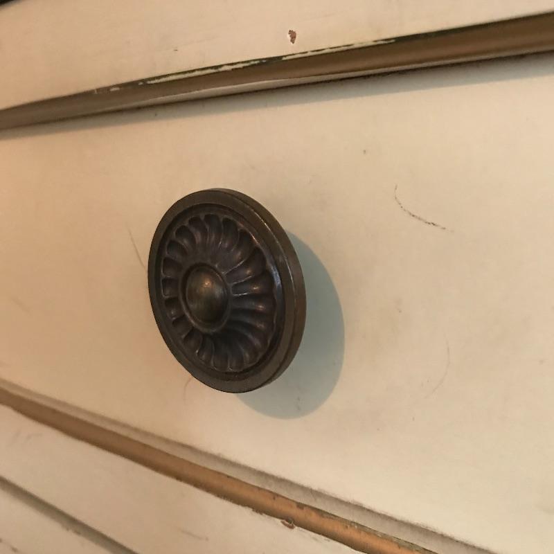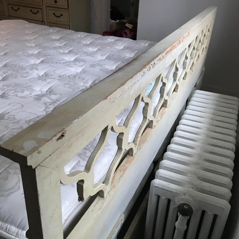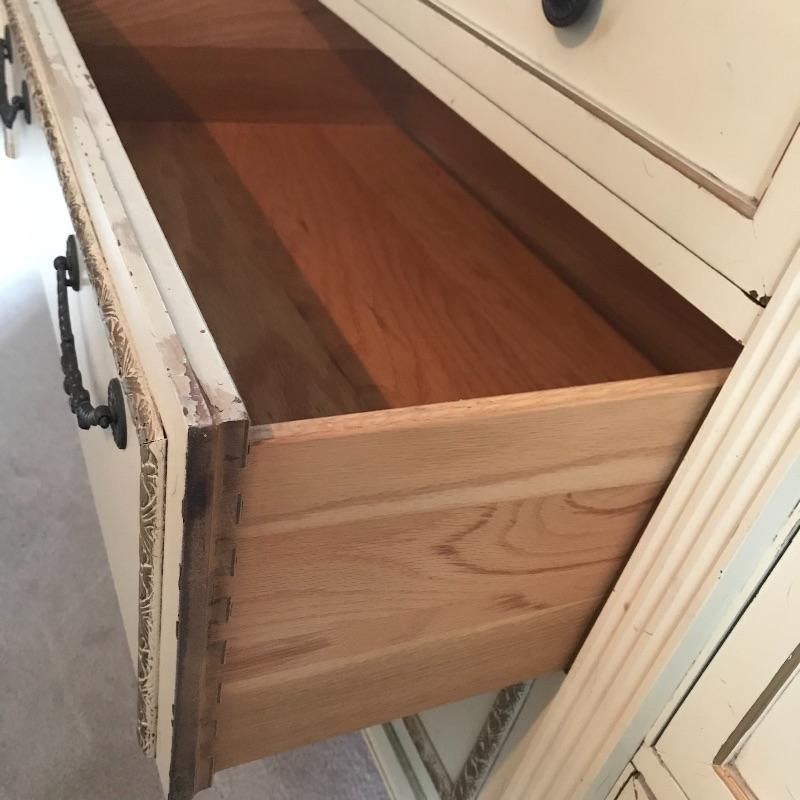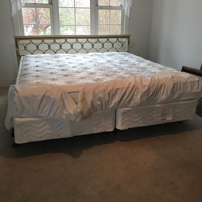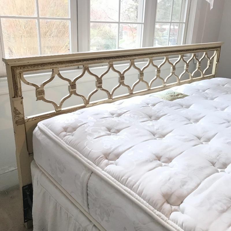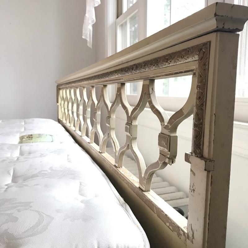 We love matching bedroom furniture! Large nine drawer dresser by Drexel with antique ivory and gold finish. Drawers glide smoothly and appear in newer condition than the style of the dresser. Dresser measures approximately 70” x 21” x 32”. There are a few blemishes on dresser top, see and zoom photos. Dresser is accompanied by a matching wood king headboard and metal bed frame. Headboard measures approximately 80” x 38”. There are two spots where the design is broken, but they are in complementary spots looking as though it was on purpose. Mattress and box springs appear in great shape and they are included if winning bidder desires. See photos for signs of other wear to backside of headboard. Dresser is very heavy and up a flight of stairs, please bring help to load. No shipping.