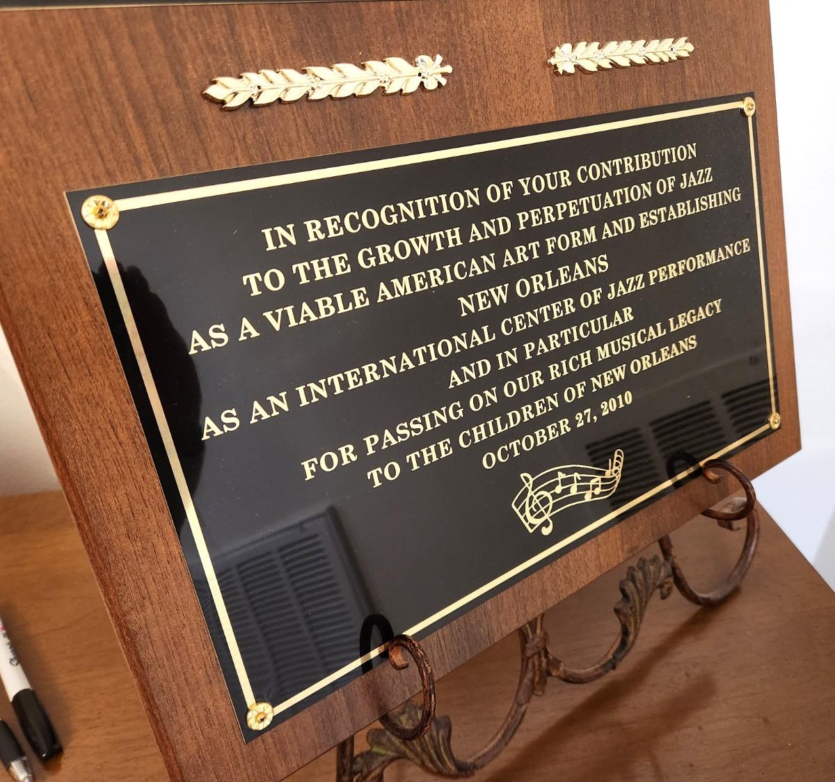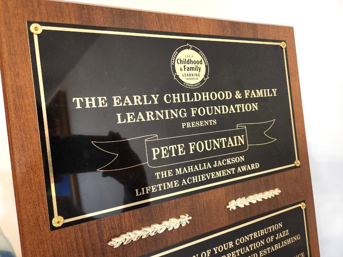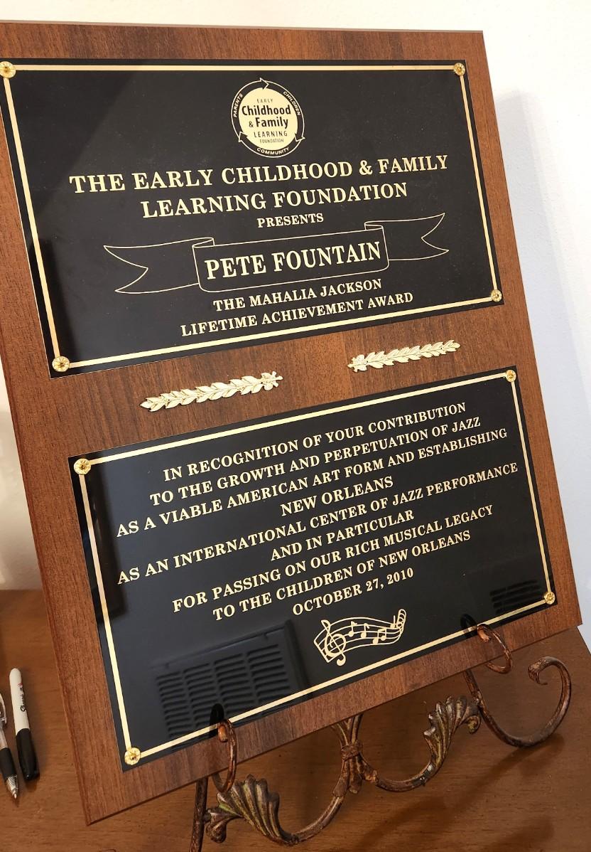 Mahalia Jackson Lifetime Achievement Award from the Early Childhood & Family Leaning Foundation to Pete Fountain, awarded in October 2010. Measures 16" x 20".