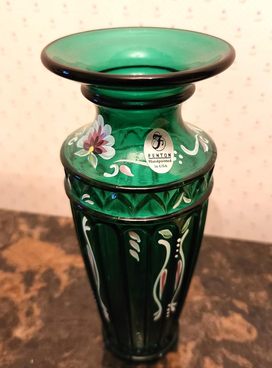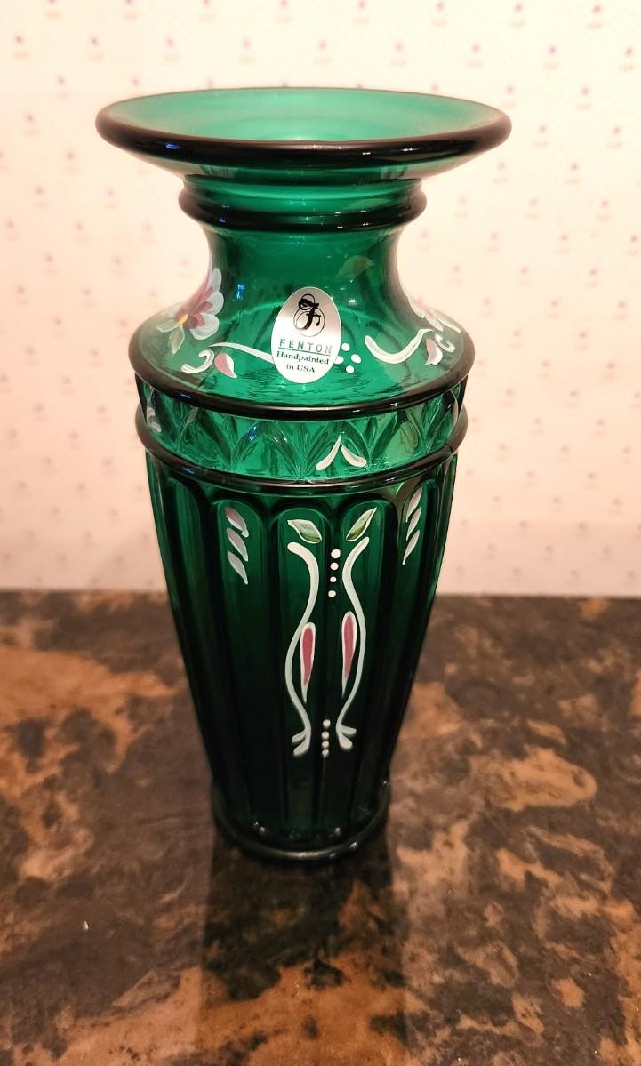 Fenton Art glass - emerald green vase, signed, hand painted, label - 7" tall. Good condition. No box.