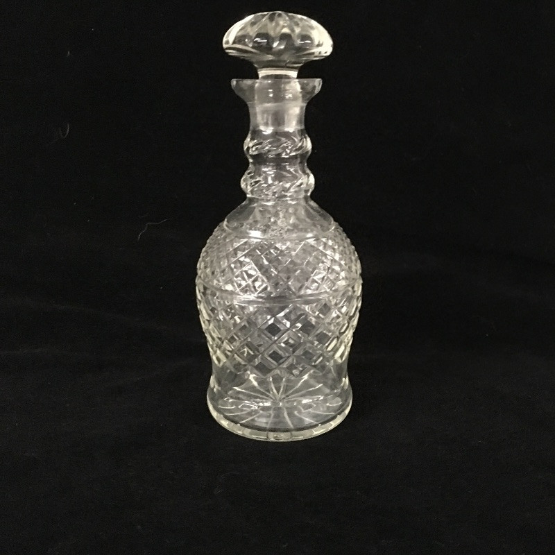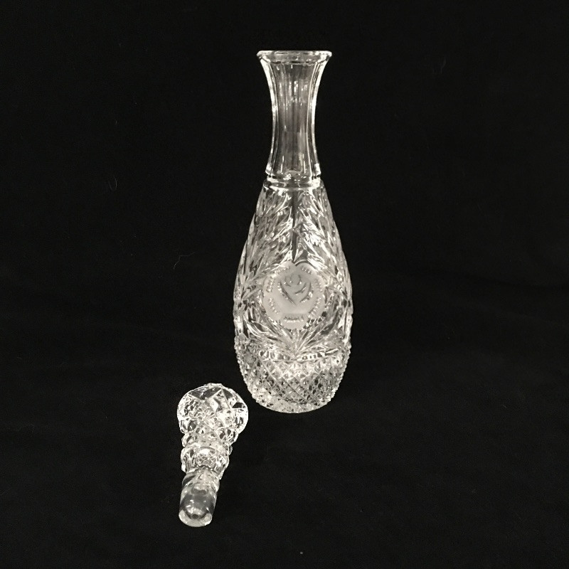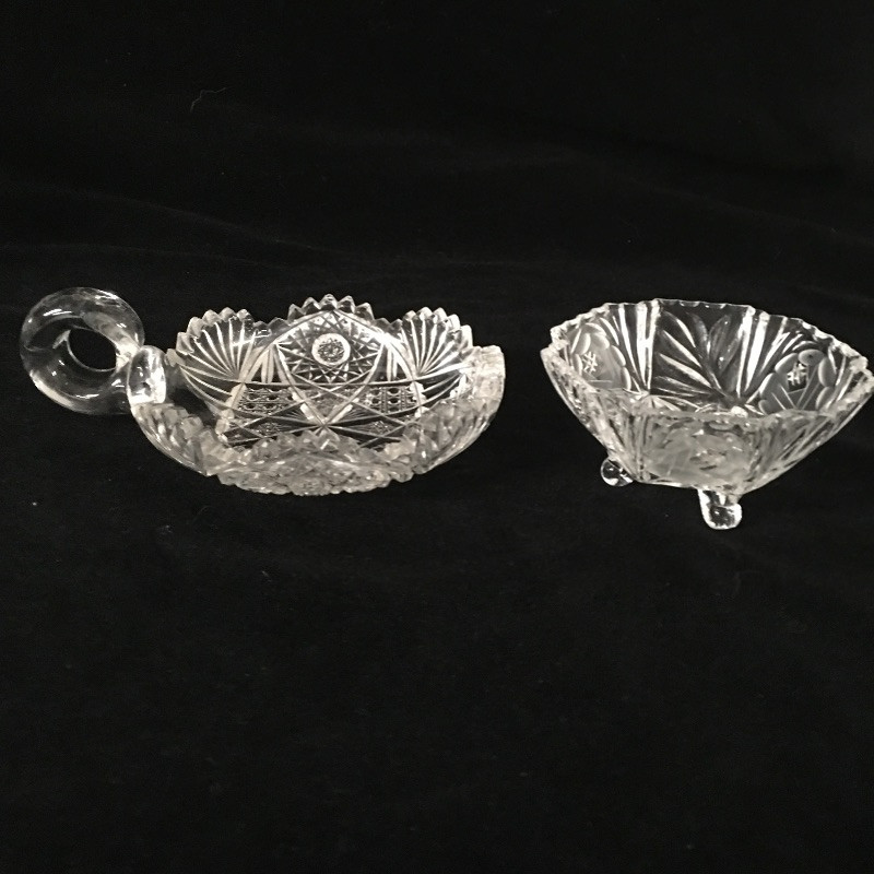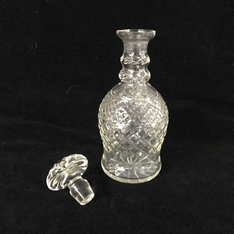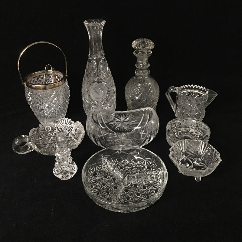 Selection of formed glass includes ashtray, two bottles with tops, three small dishes, small cup and handled container with tongs. Tallest bottle with top measures 3.5”D x 15” tall.