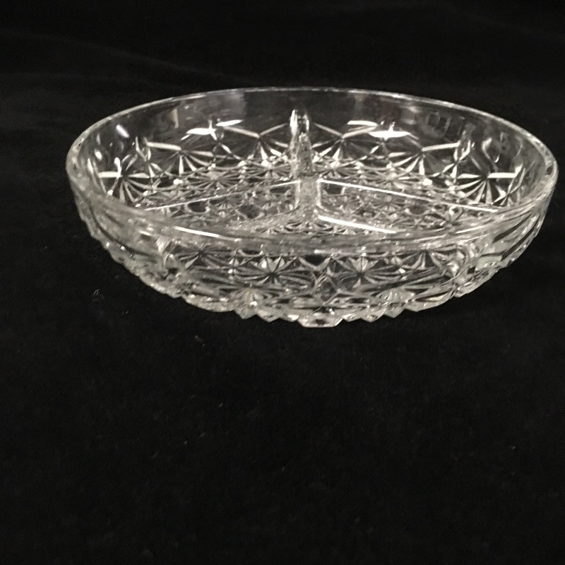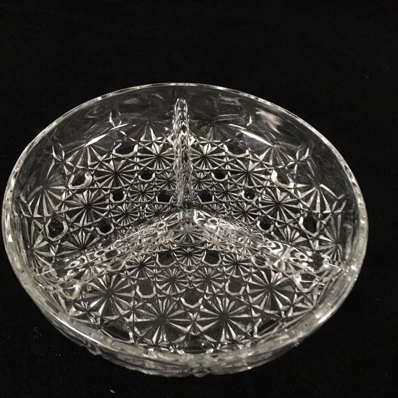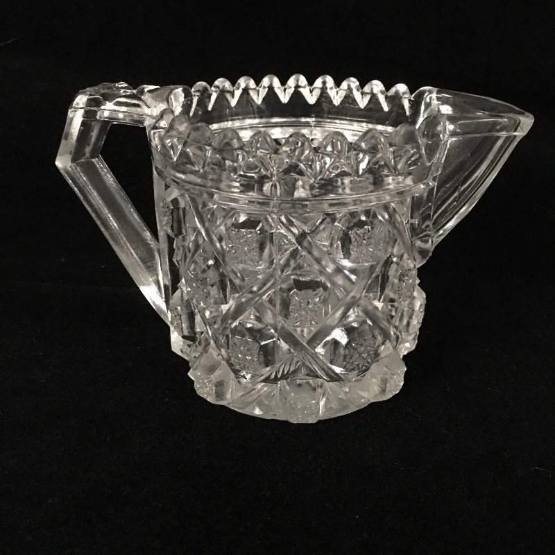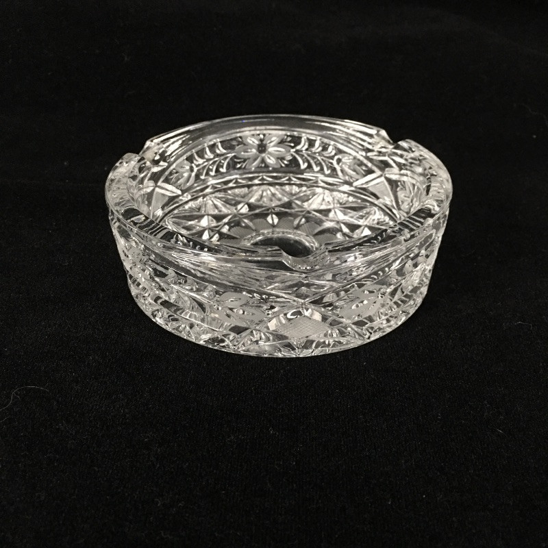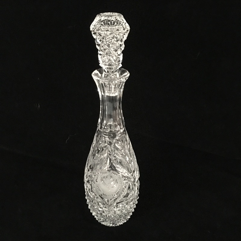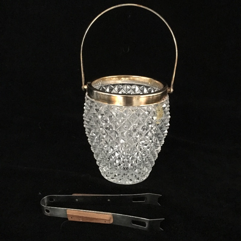 Selection of formed glass includes ashtray, two bottles with tops, three small dishes, small cup and handled container with tongs. Tallest bottle with top measures 3.5”D x 15” tall.