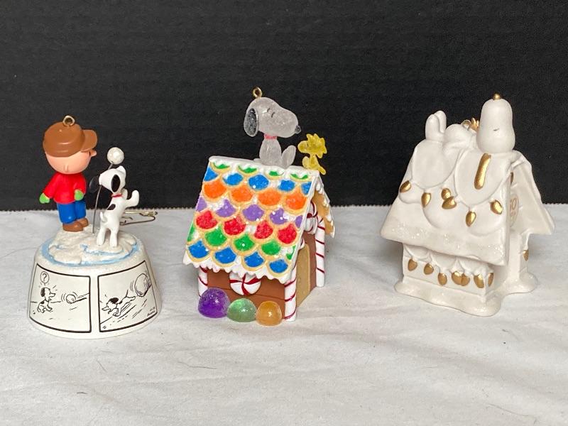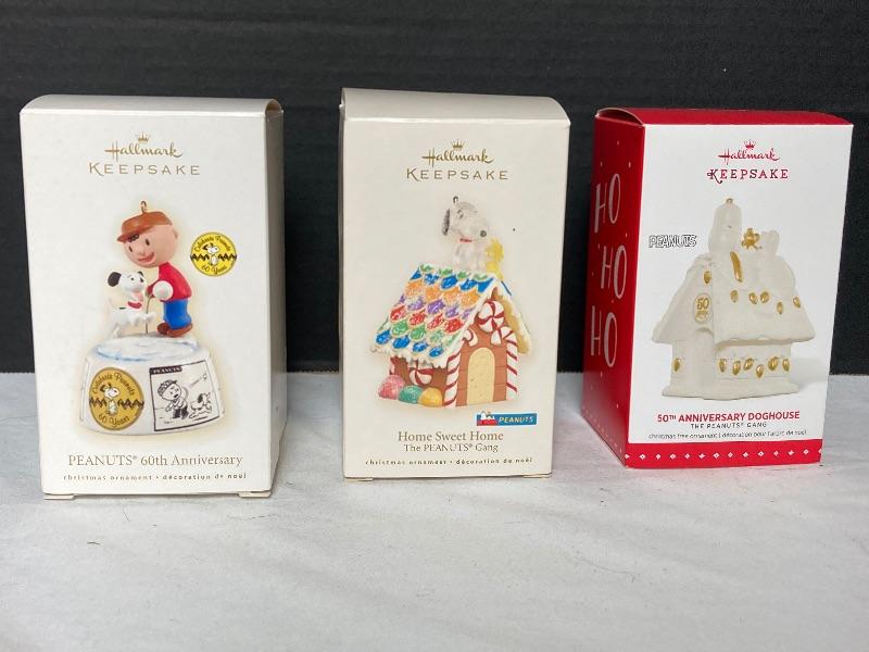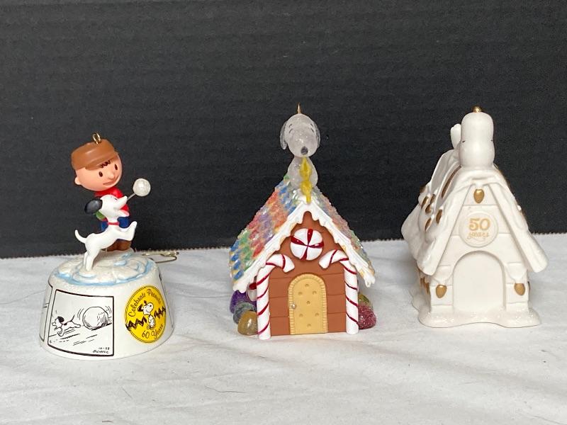 Peanuts 60th Anniversary ornament (2009) 3-1/2” , “Home Sweet Home” 4”, 50th Anniversary Dog House 4”