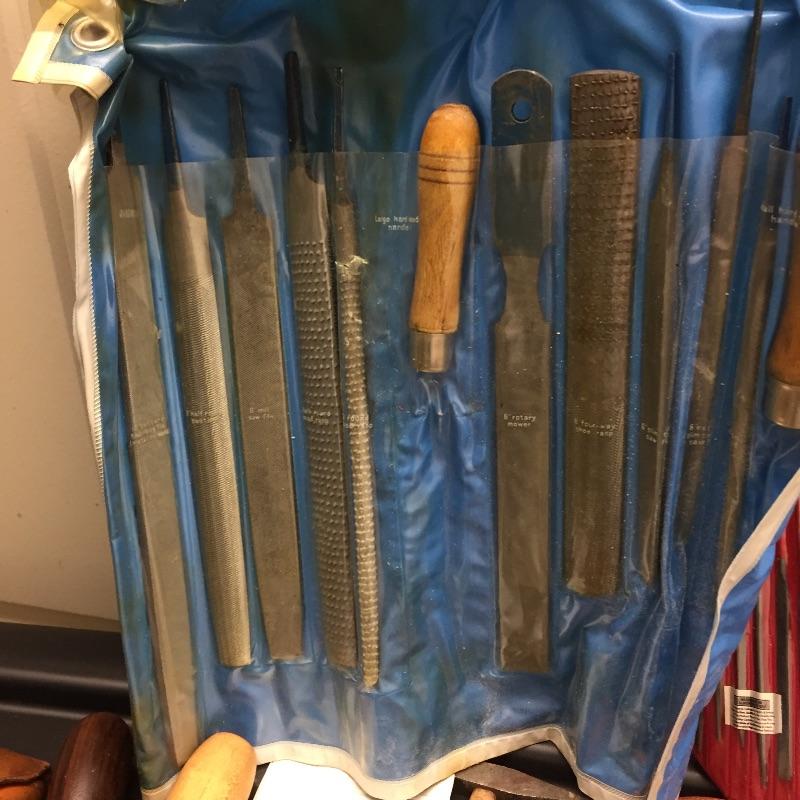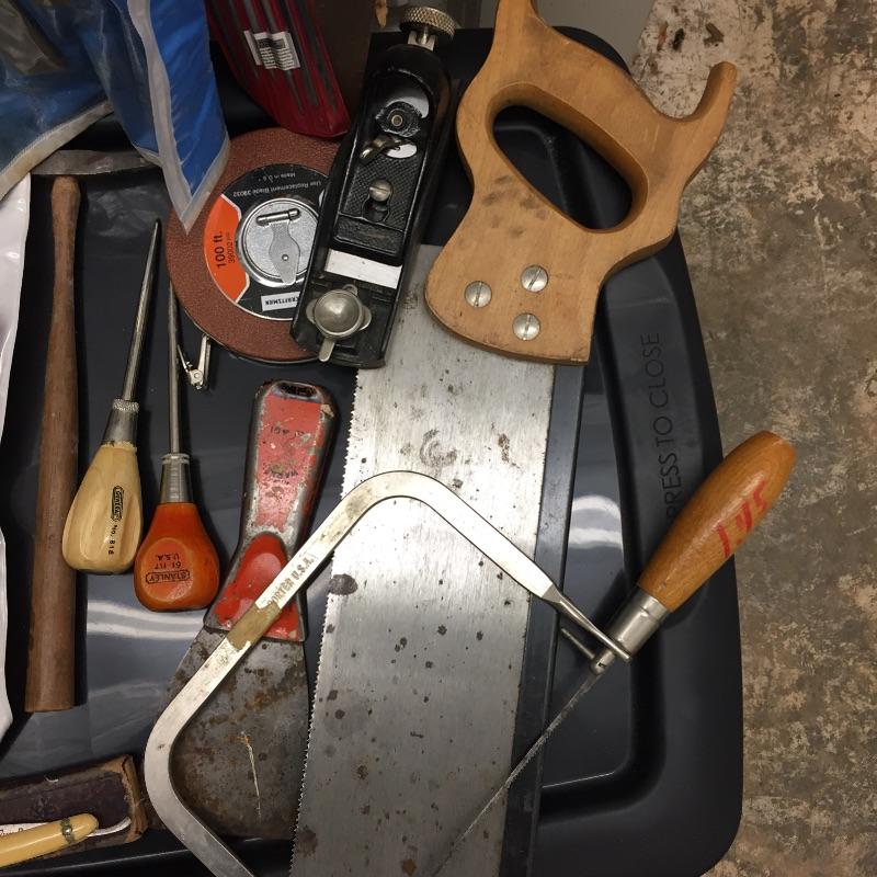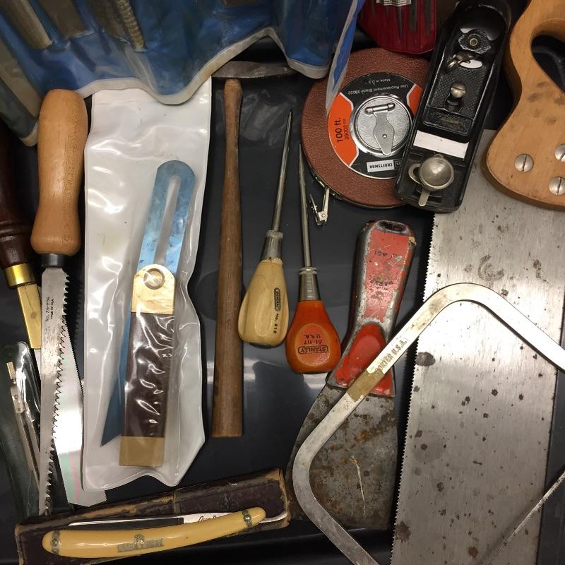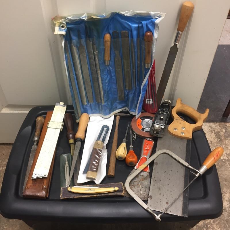 Nice assortment of hand tools. Hand planer,saw,files,tape measure,F.W. Engels straight razor and more.