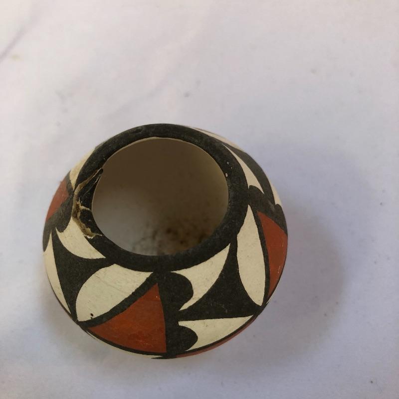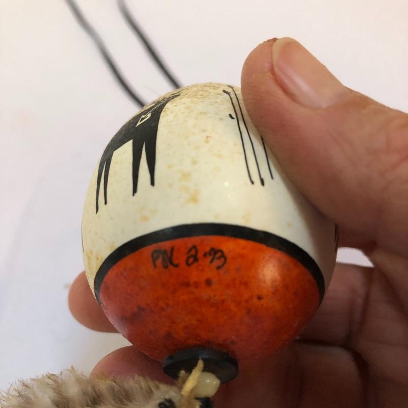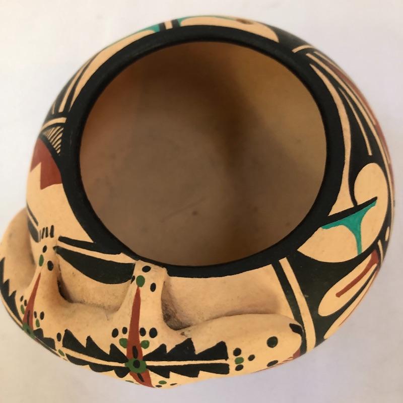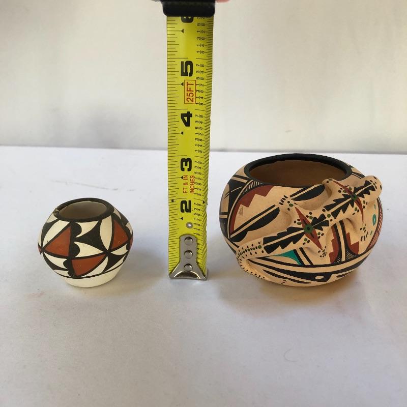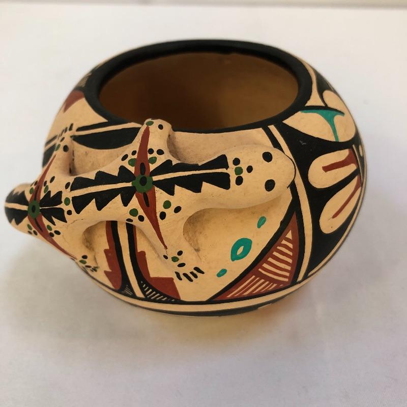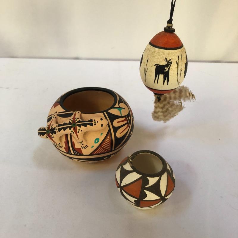 This precious trio of pieces all have a Native American feel to them. The largest bowl has a lizard on its side and is signed by the artist that appears to be the card in the last image. Also included is a hanging egg that has feathers and a tiny ceramic urn that does have a crack in its rim, see images. The egg is not ceramic. It appears to be an actual egg. Shipping Available