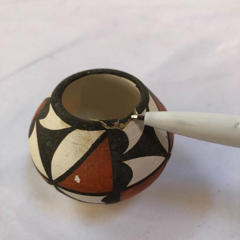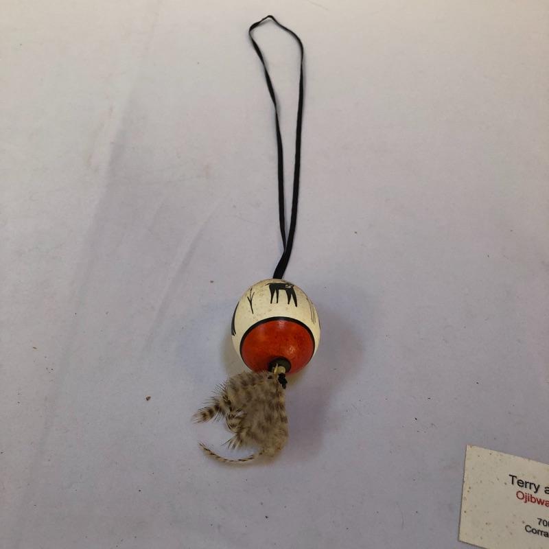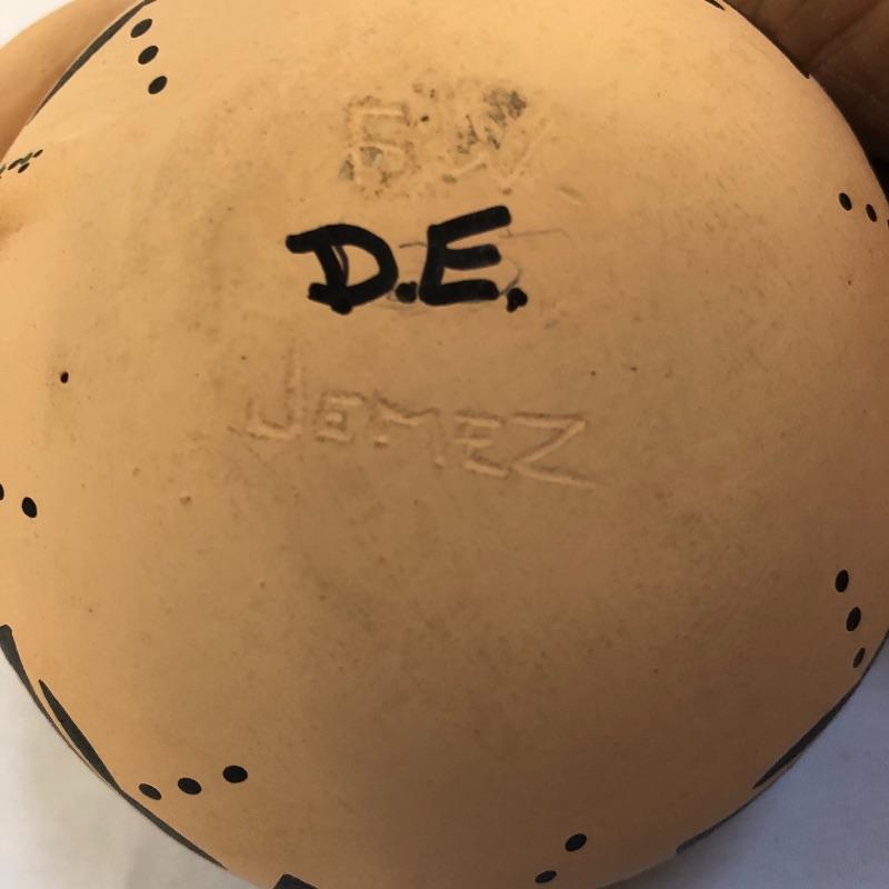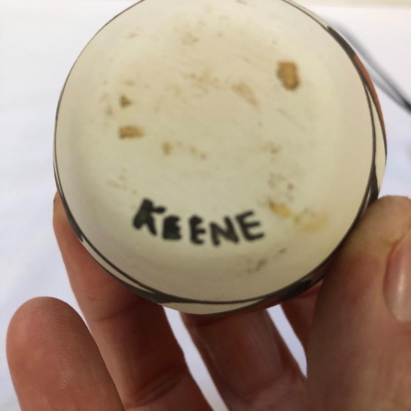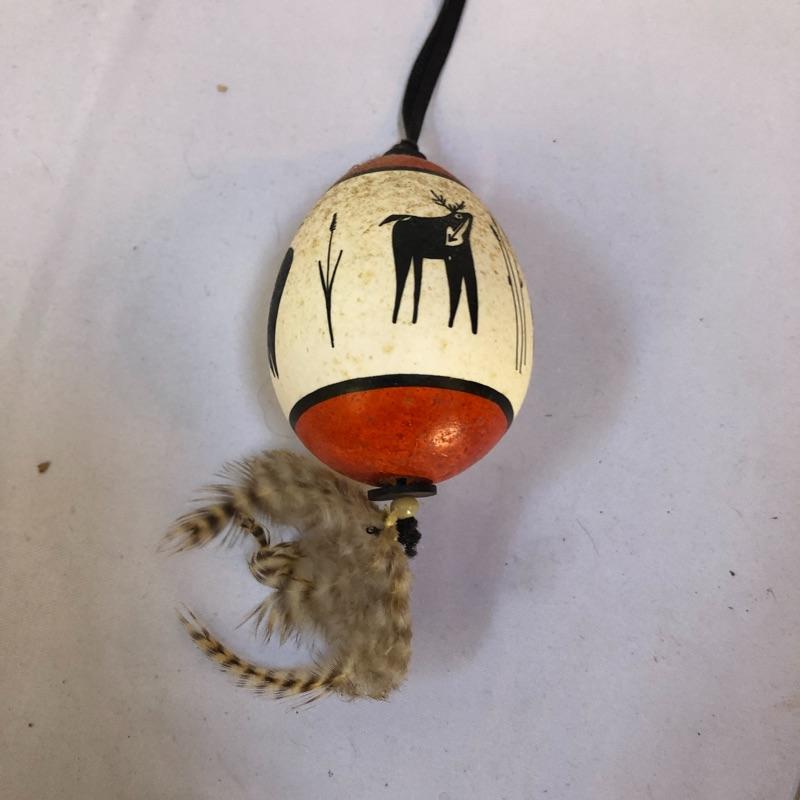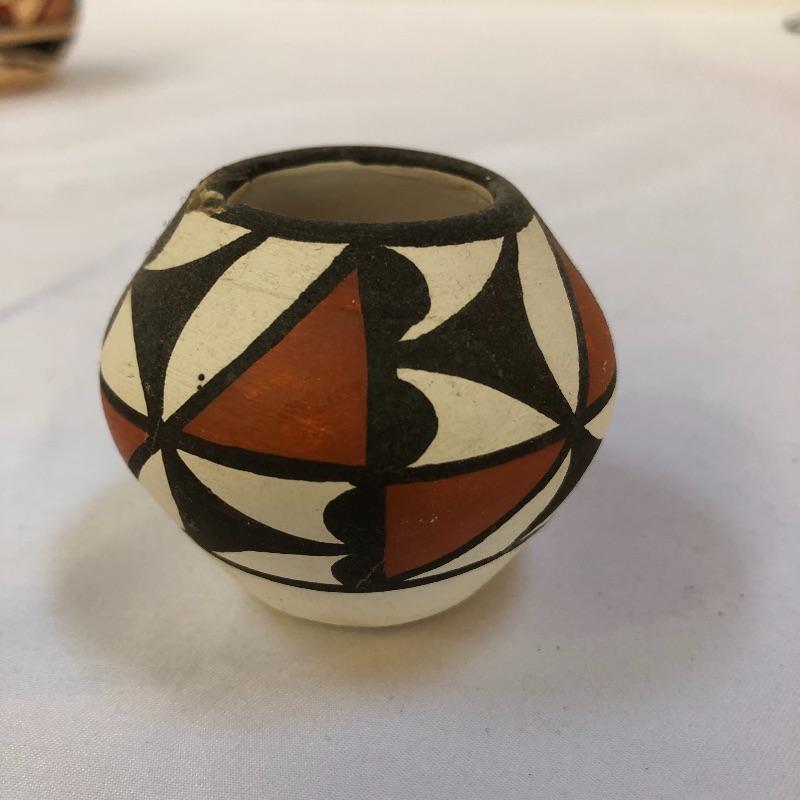 This precious trio of pieces all have a Native American feel to them. The largest bowl has a lizard on its side and is signed by the artist that appears to be the card in the last image. Also included is a hanging egg that has feathers and a tiny ceramic urn that does have a crack in its rim, see images. The egg is not ceramic. It appears to be an actual egg. Shipping Available