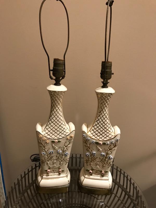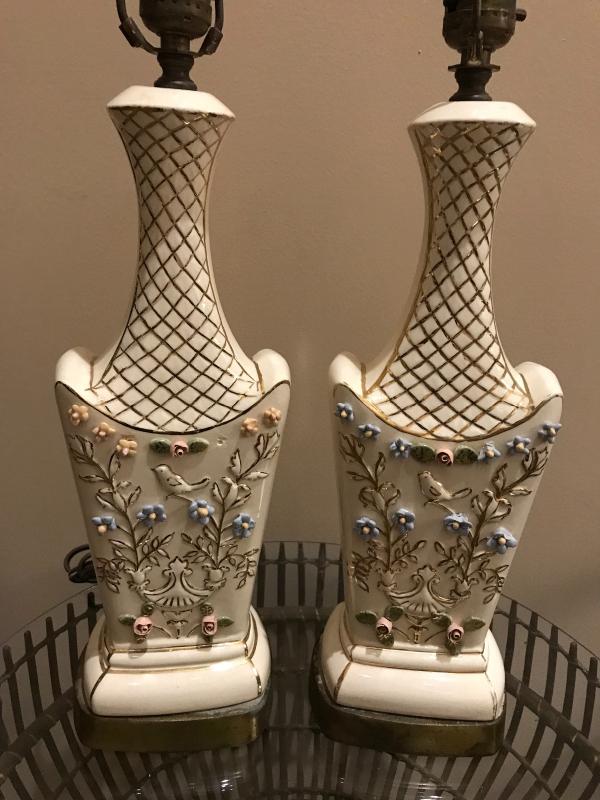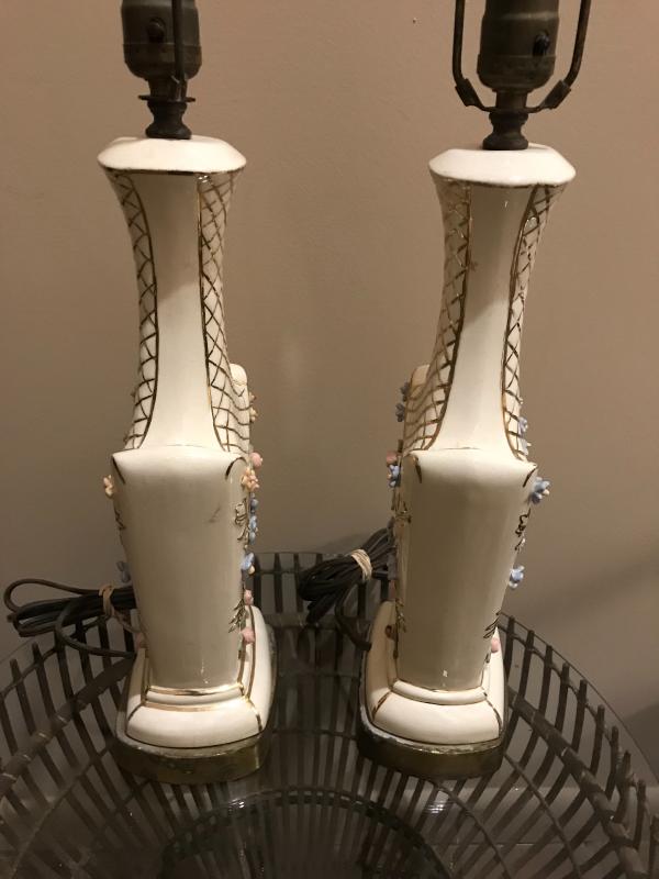 Pair of MC French style table lamps. White ceramic urn shaped lamp bases are decorated with three diminsional pink and blue roses and lots of gold accents. Brass base. 5 1/2" x 4" x 25" H each