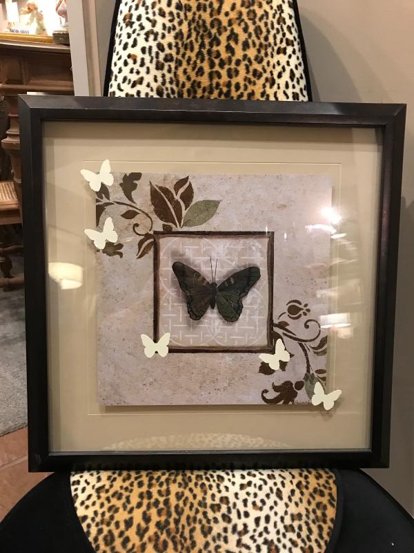 Pair of decorator framed prints of butterflies by Hakimipour/Ritter. Uniquely mounted to the glass and undermatted to create a shadowbox effect. Bronze finish frames. 19" x 19" H.