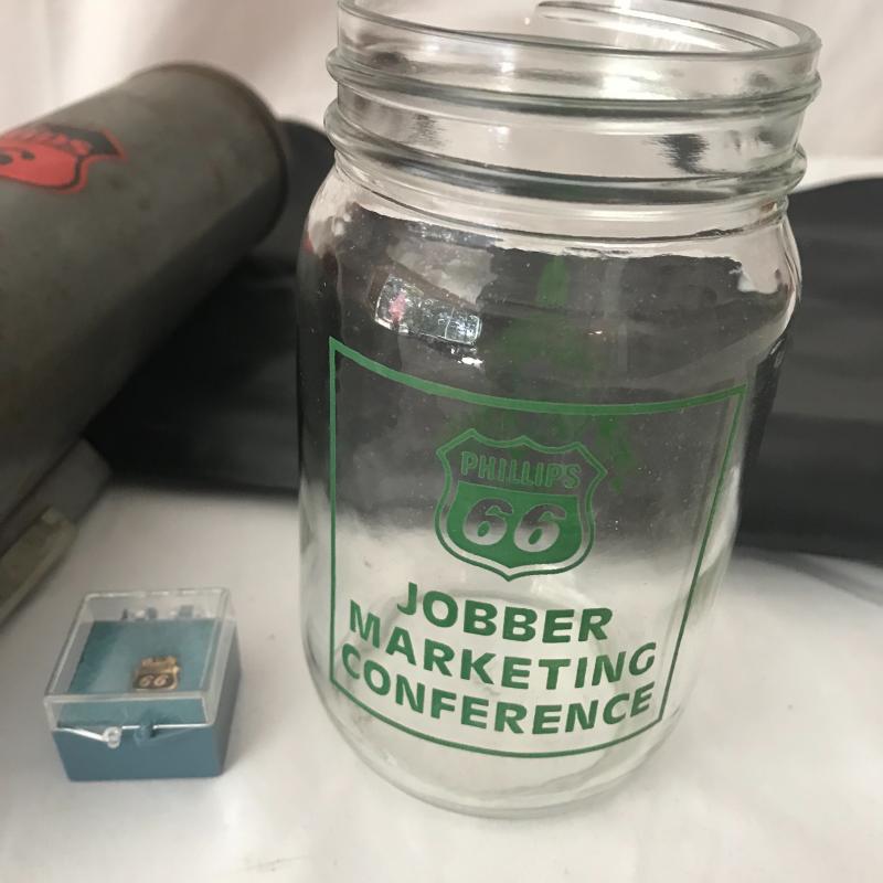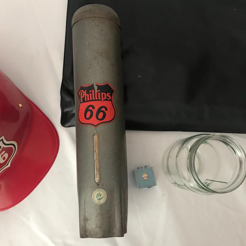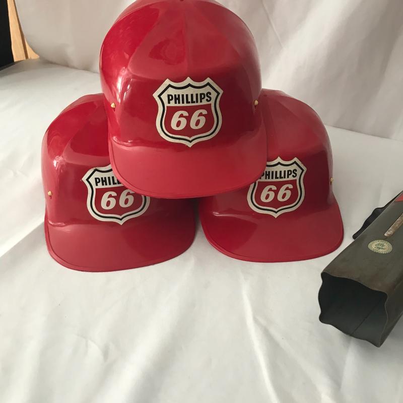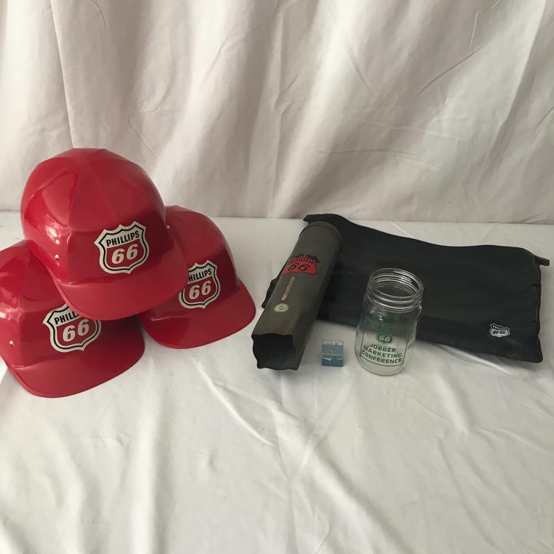 Three hard hats, paper cup dispenser, pin, jar glass and pouch with Phillips 66 logo. Shipping available.