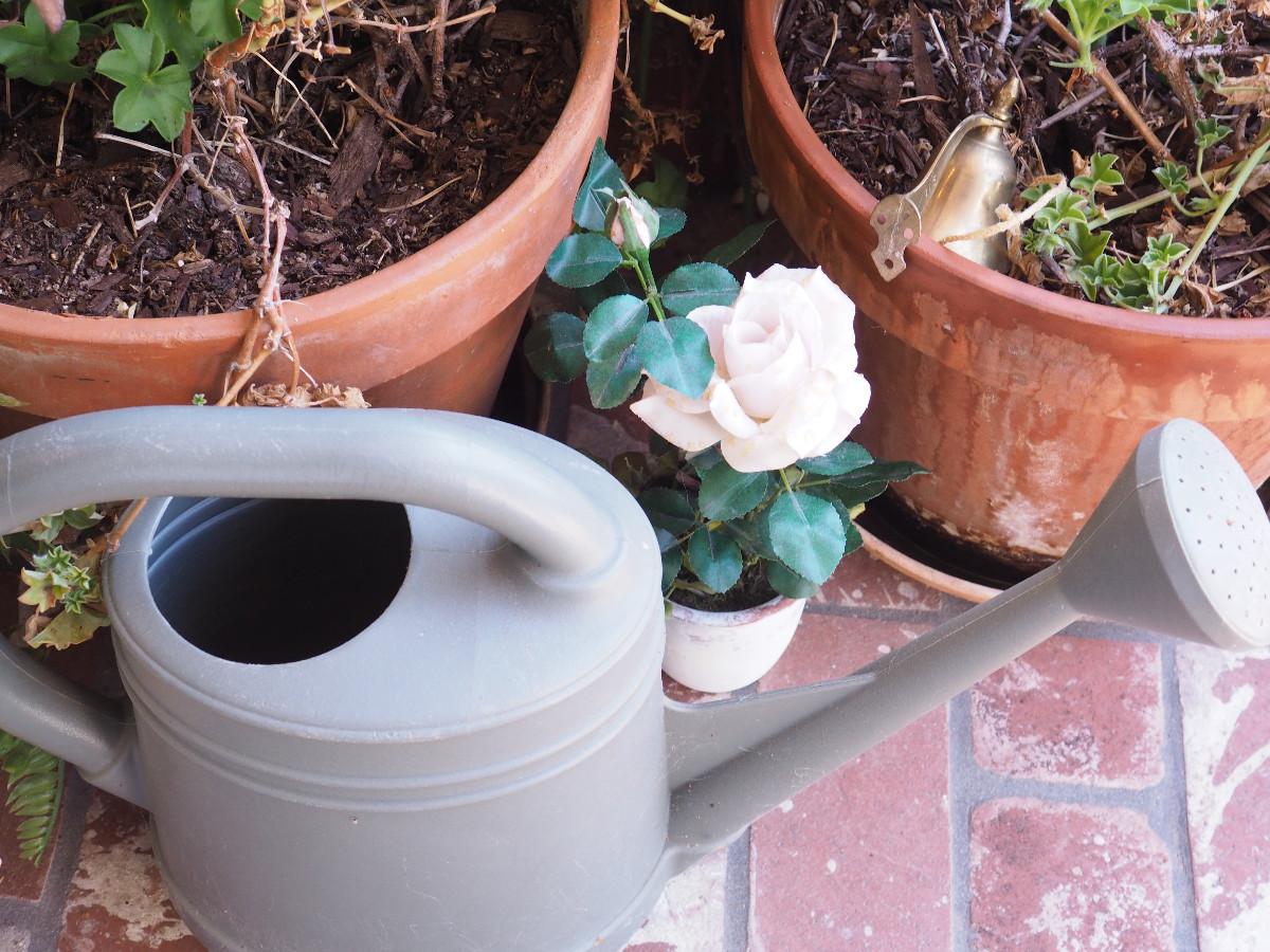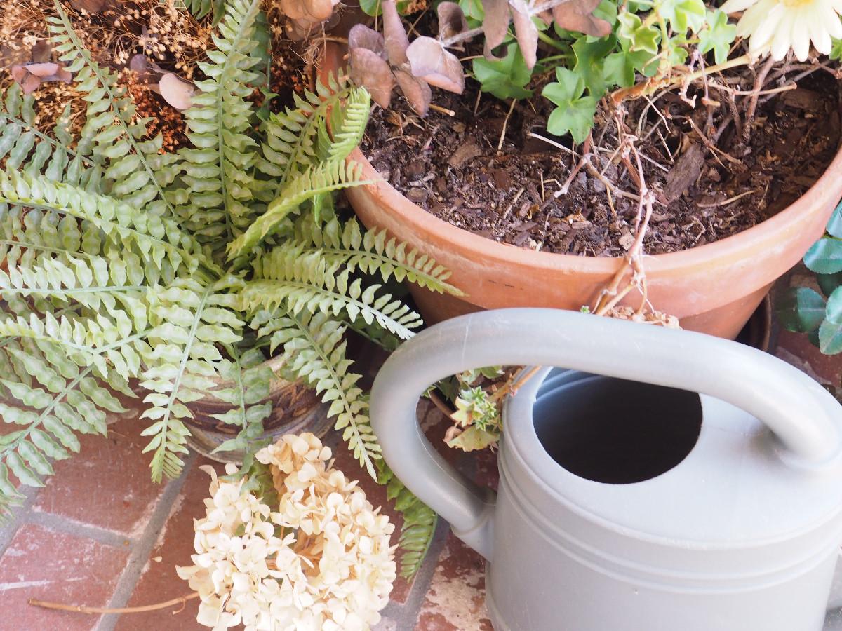 Live and silk plants, Terra Cotta pots, plastic watering can, metal plant stand