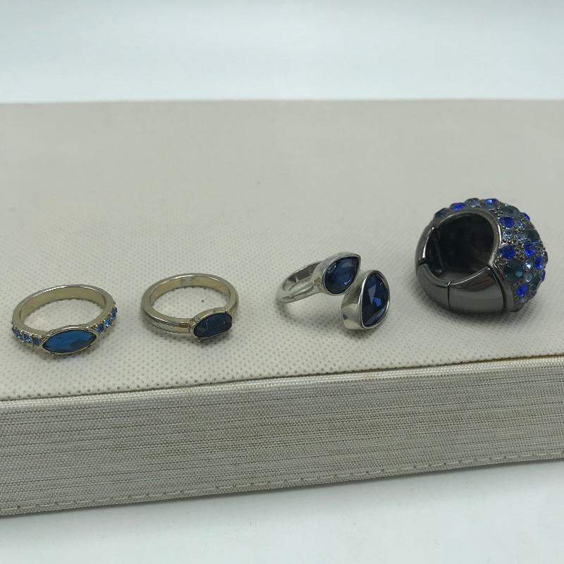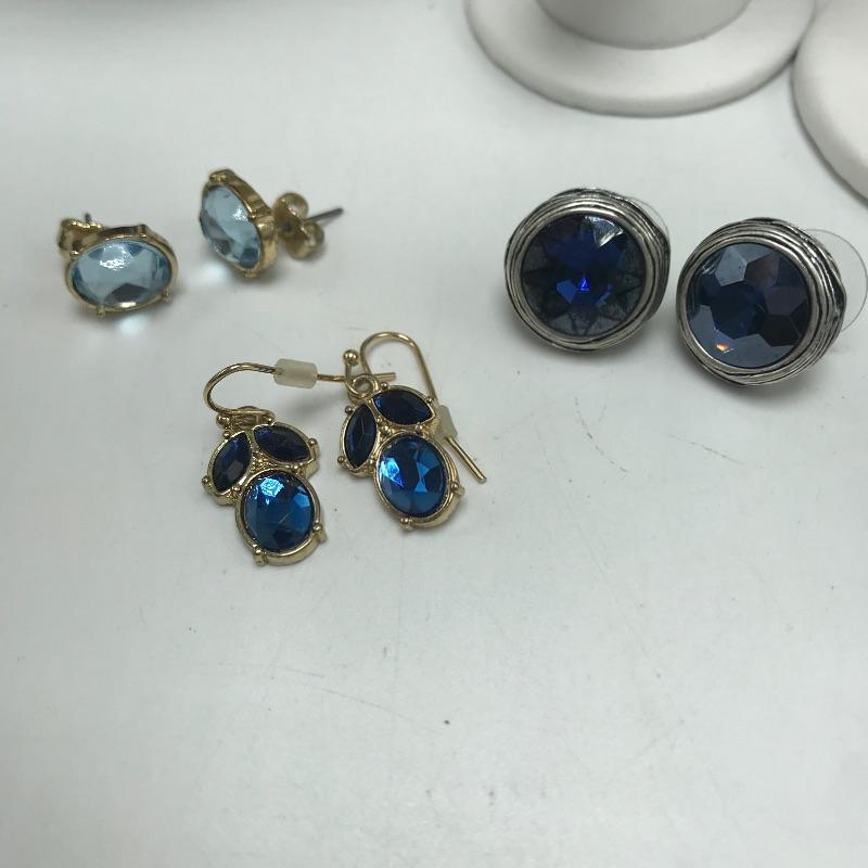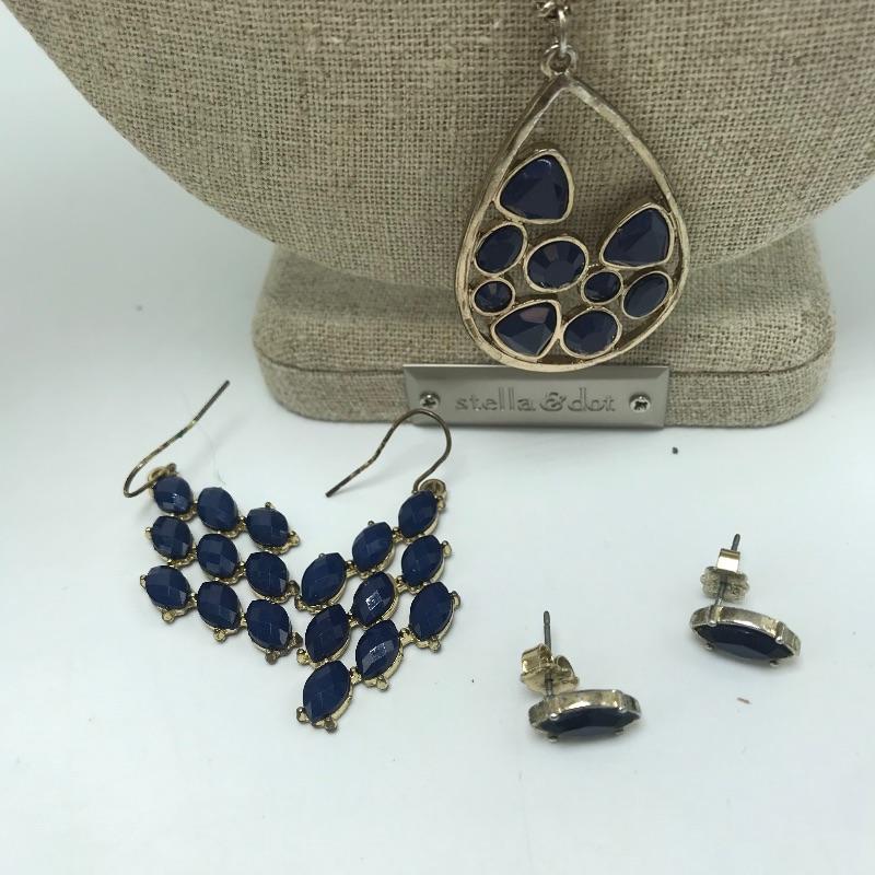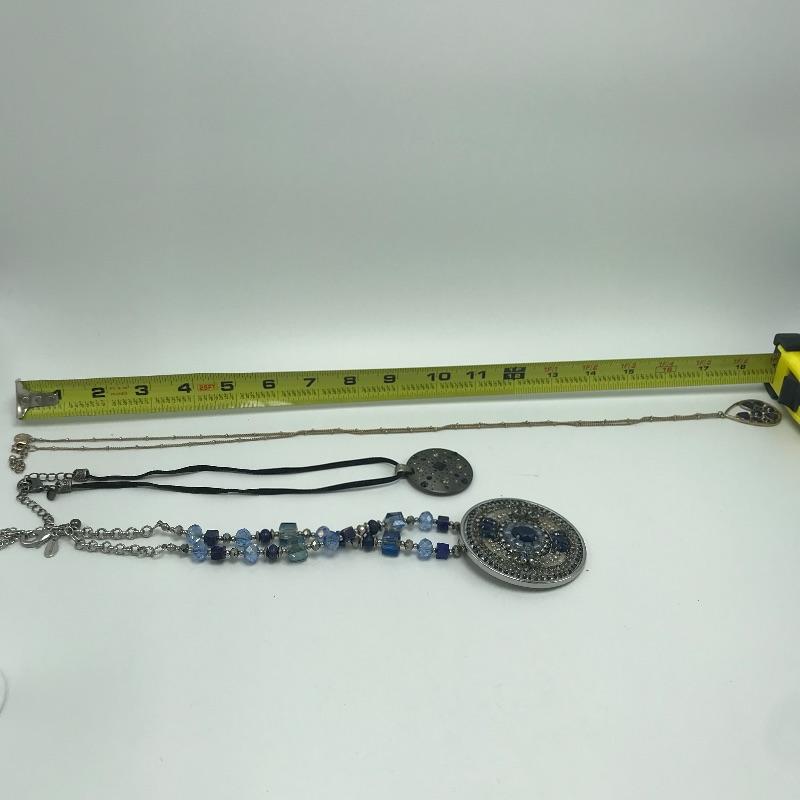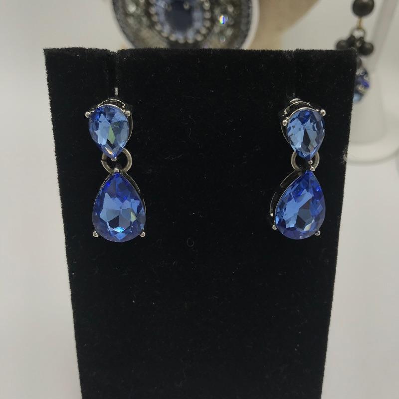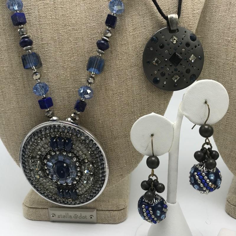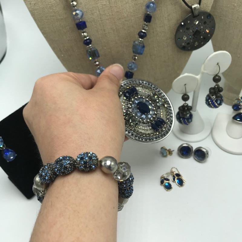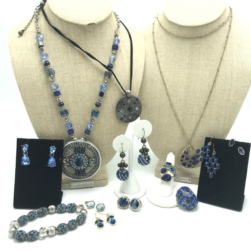 Sparkly collection of blue highlighted jewelry. Stretch bracelet and largest pendant are heavy as well as dazzling and look great with the sparkly globe earrings. Longest necklace is by Charming Charlie. Yet again, many opportunities to mix and match.