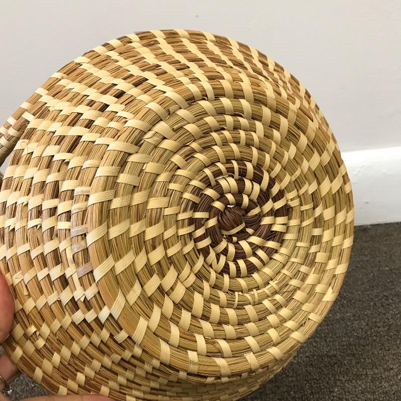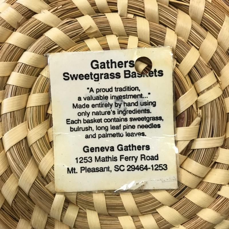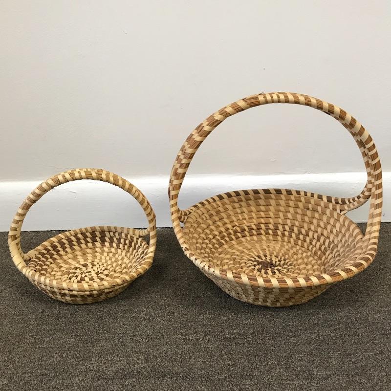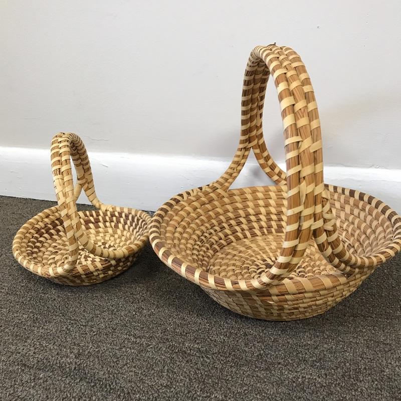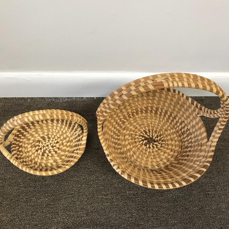 Two Sweetgrass baskets. One has a label from Charleston. The other does not have label or signature so we can not verify it’s origin. Both have nice handles and are in good condition. Largest measures 10” diameter and 11” high. Shipping available.