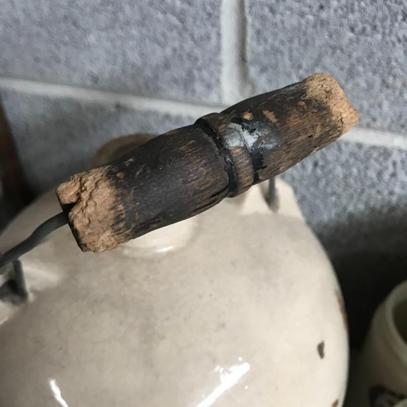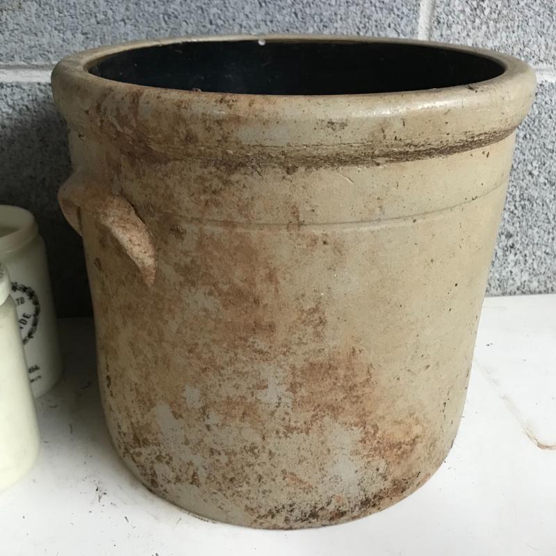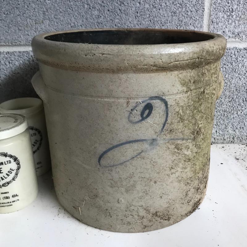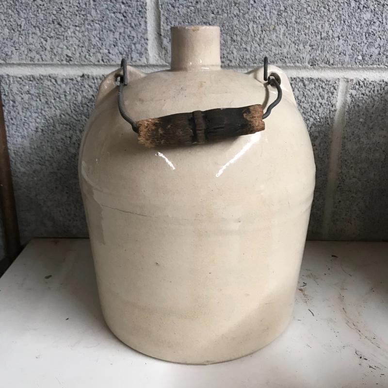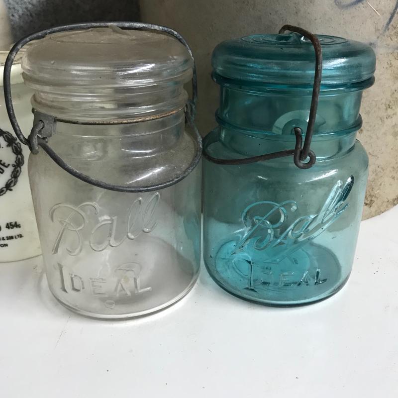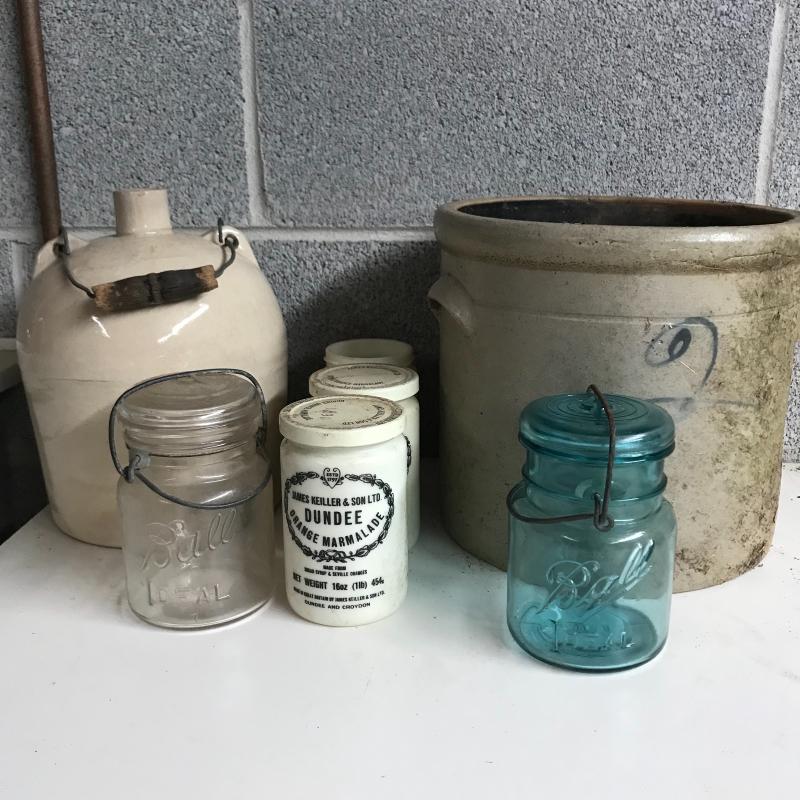 Lot includes two swing top Ball jars with glass tops and wire bales, three vintage marmalade jars, a #2 pot measuring approx 9.75”d and 8.75”h. Lastly, collection includes a large pottery jug with a wooden handle. All jars need cleaning. No shipping.