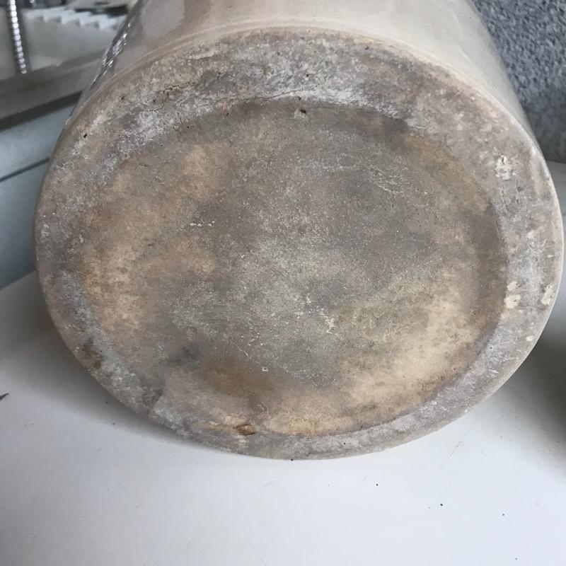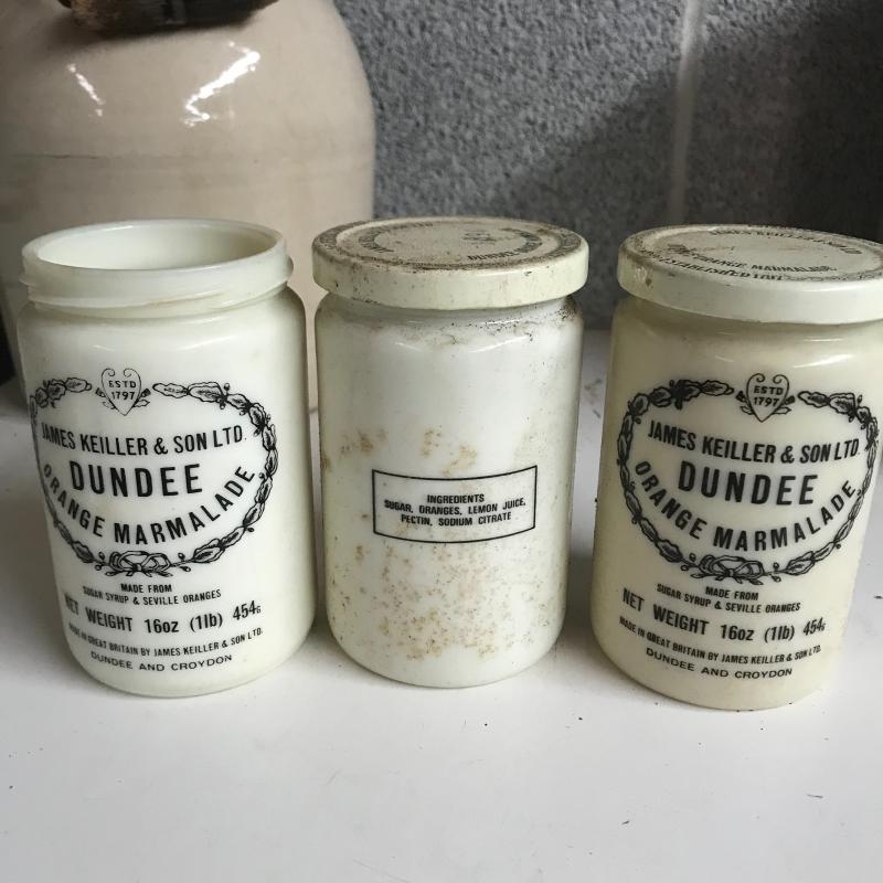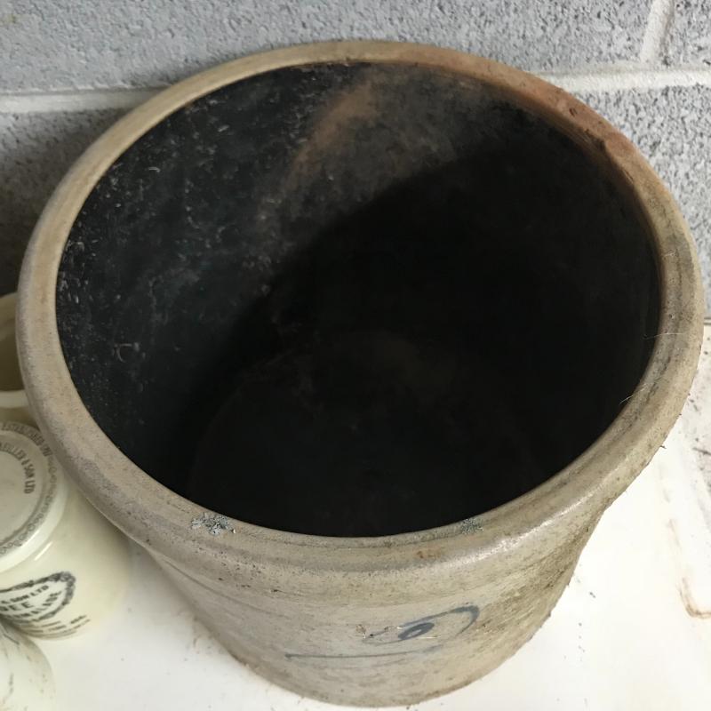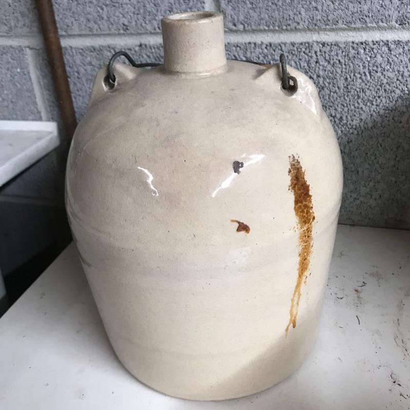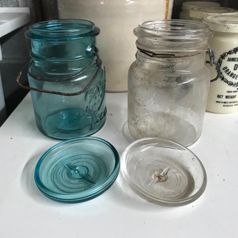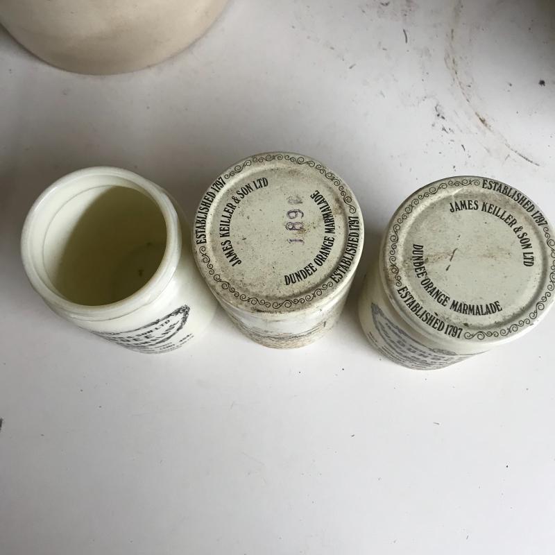 Lot includes two swing top Ball jars with glass tops and wire bales, three vintage marmalade jars, a #2 pot measuring approx 9.75”d and 8.75”h. Lastly, collection includes a large pottery jug with a wooden handle. All jars need cleaning. No shipping.