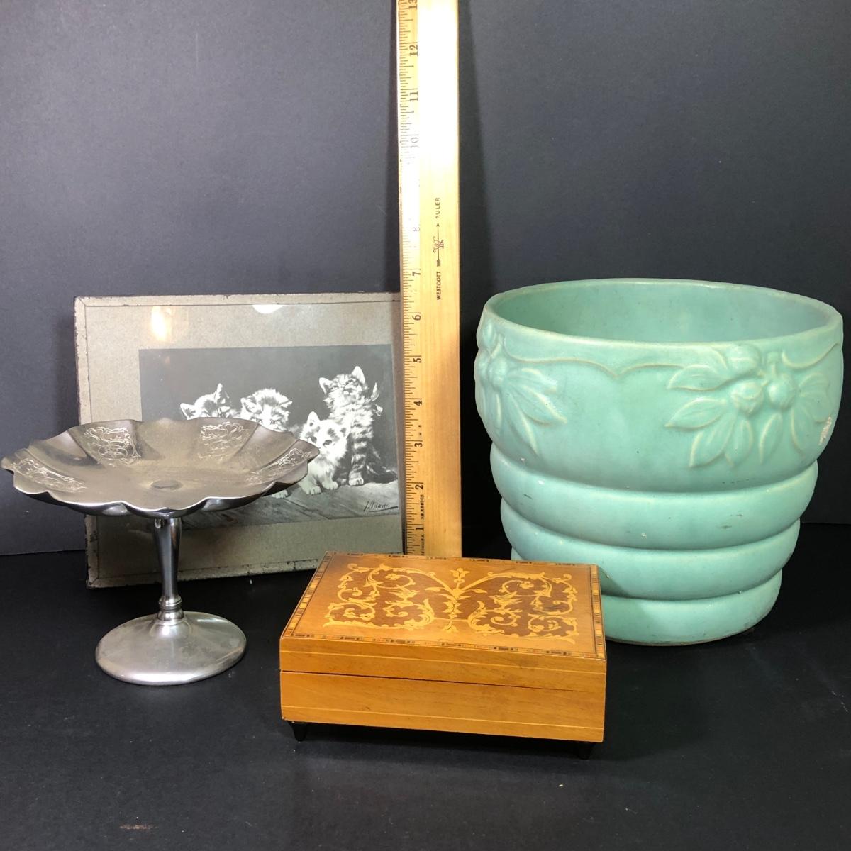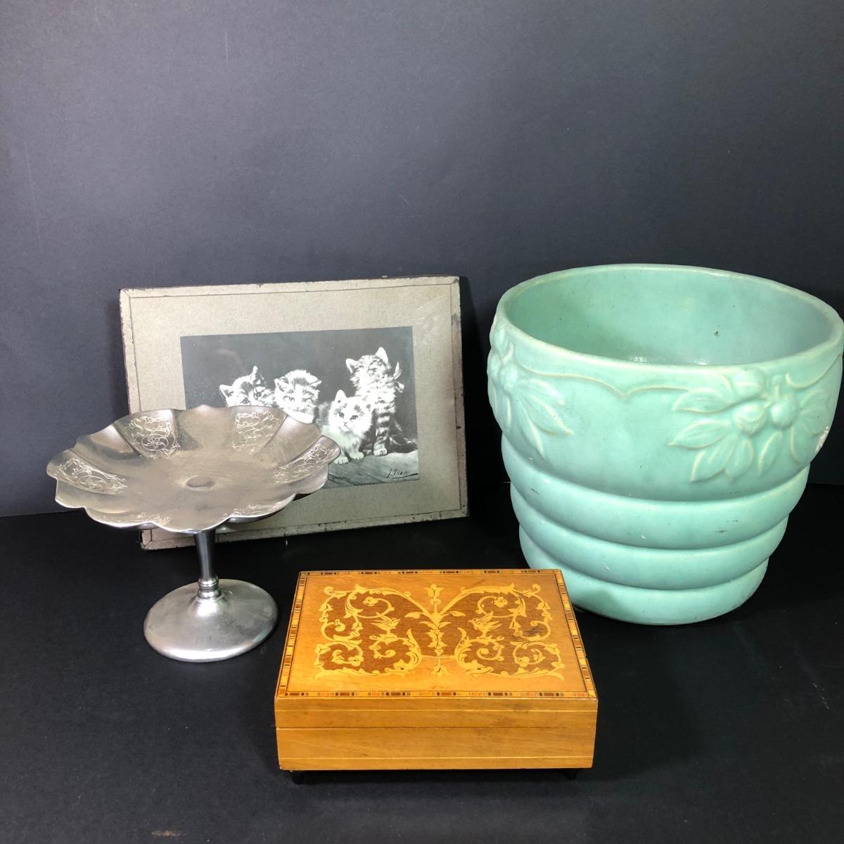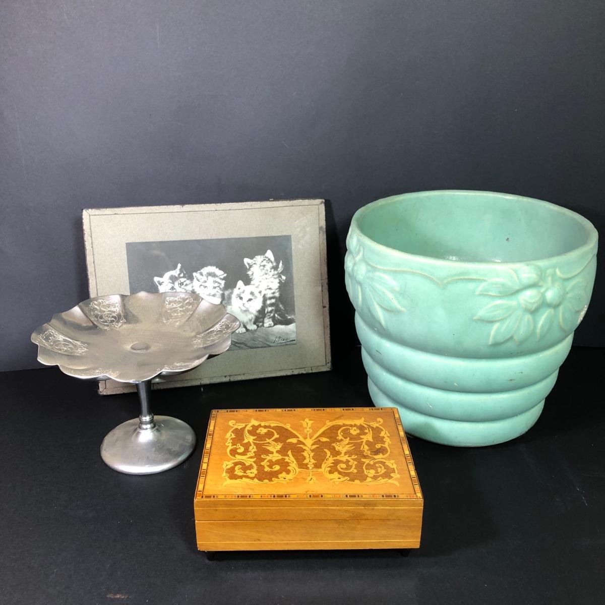 LOT 197M: Krome-Kraft Farber Bros Pedestal Dish, Signed 1906 Kitten Photograph, Piccerella Music Box & Teal Pottery Piece