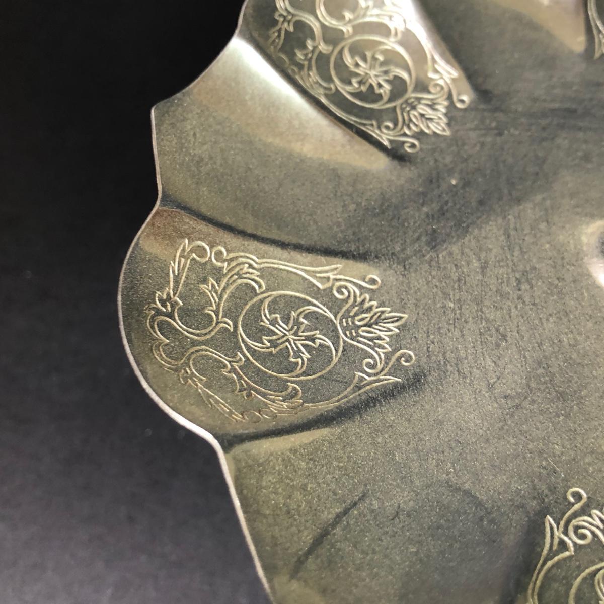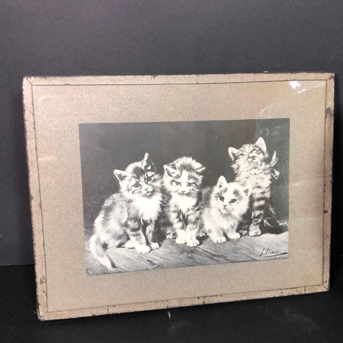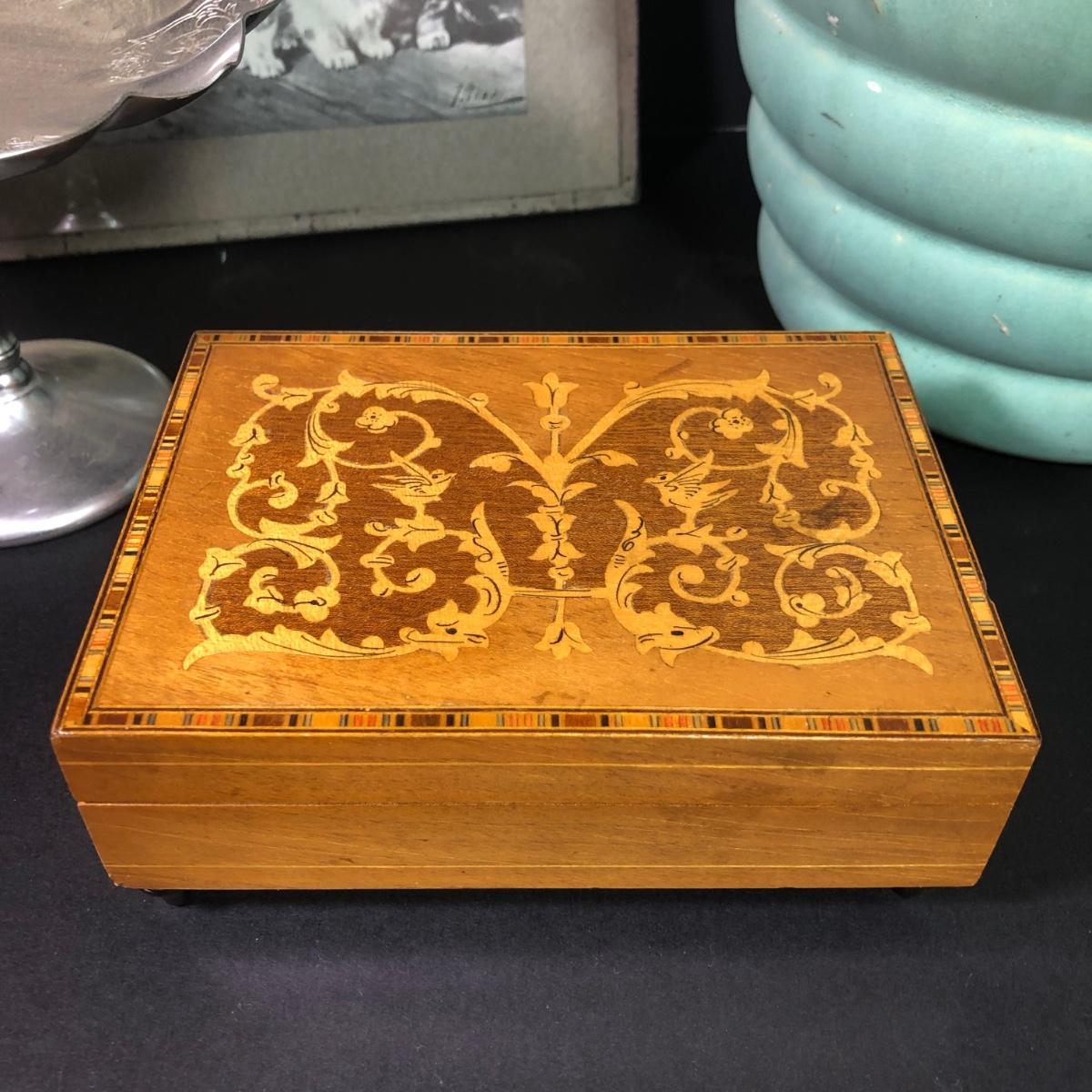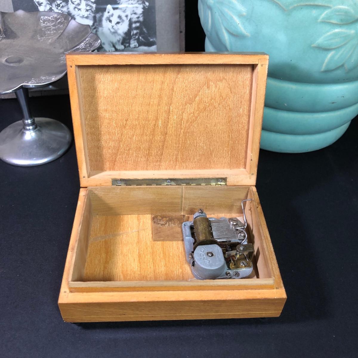 LOT 197M: Krome-Kraft Farber Bros Pedestal Dish, Signed 1906 Kitten Photograph, Piccerella Music Box & Teal Pottery Piece