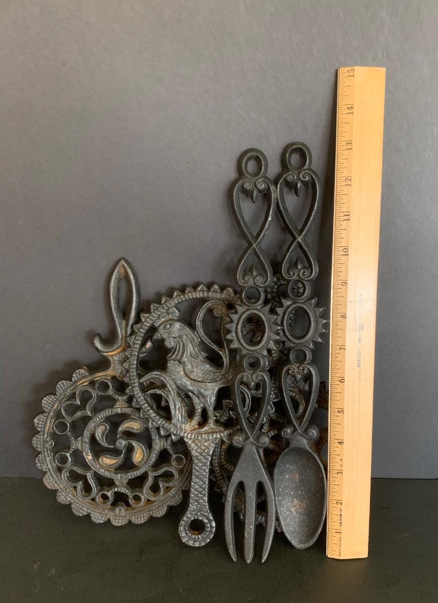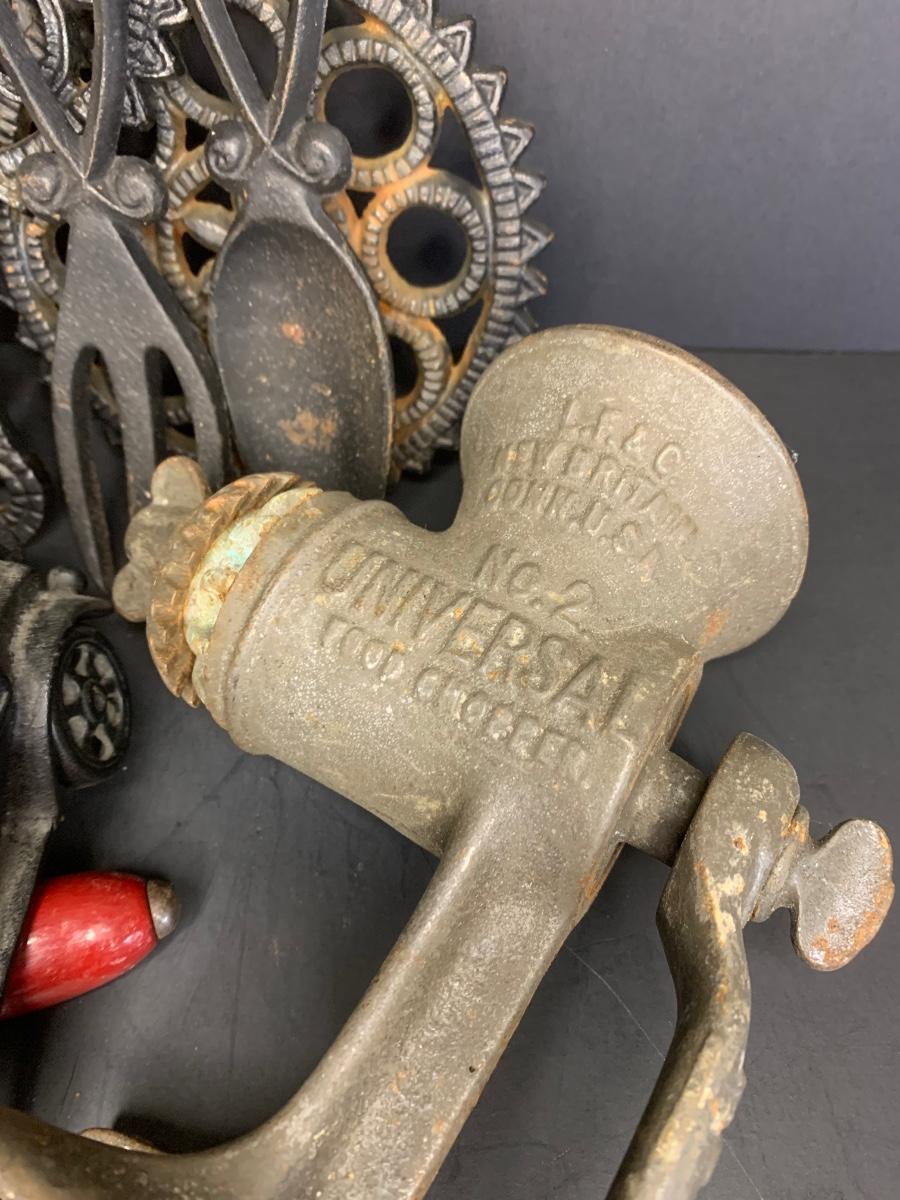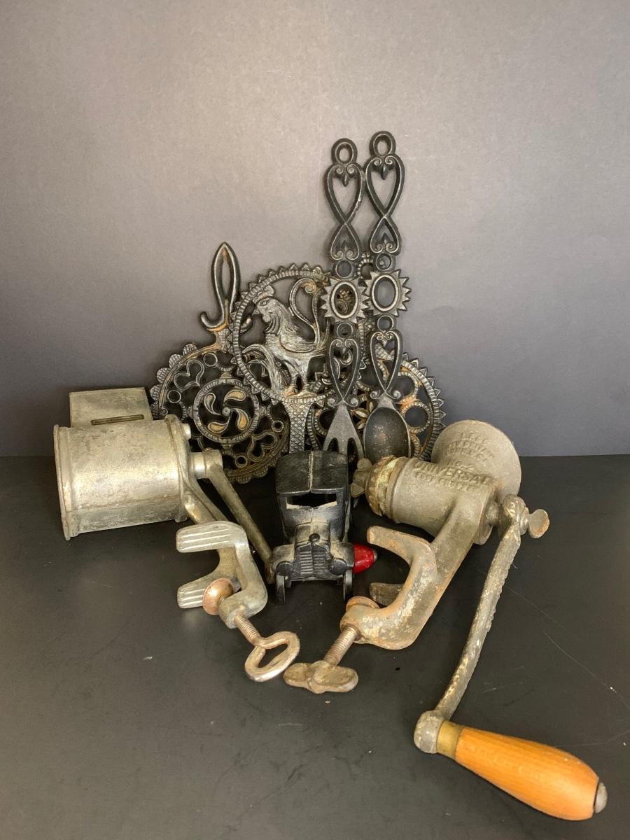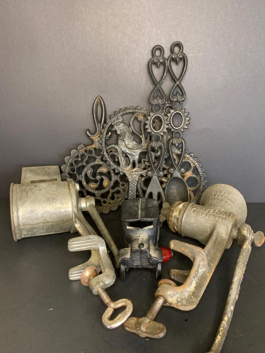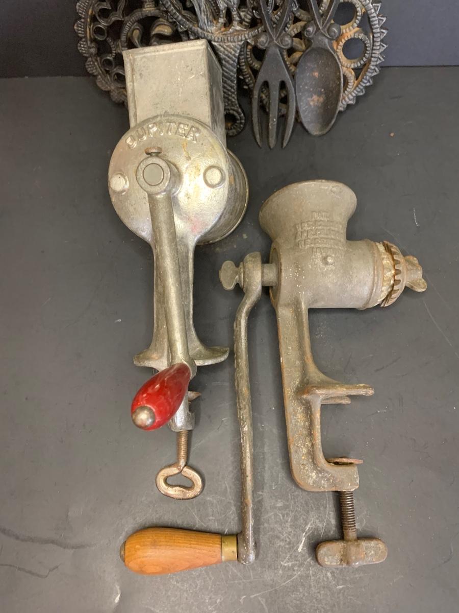 Lot 197R: Vintage Cast Iron Trivets, Spoon & Fork Wall Hanging, Vintage Food Grinders & Cast Iron Toy Truck