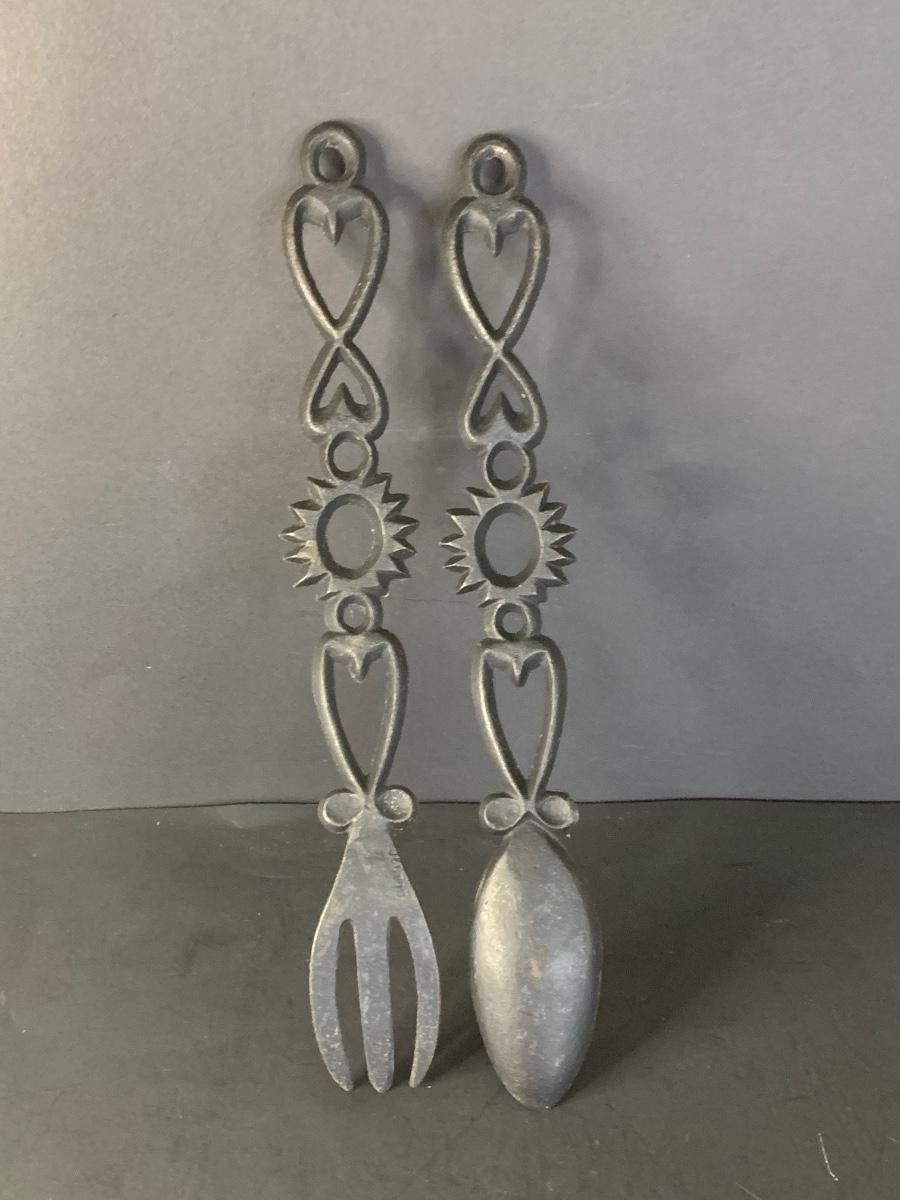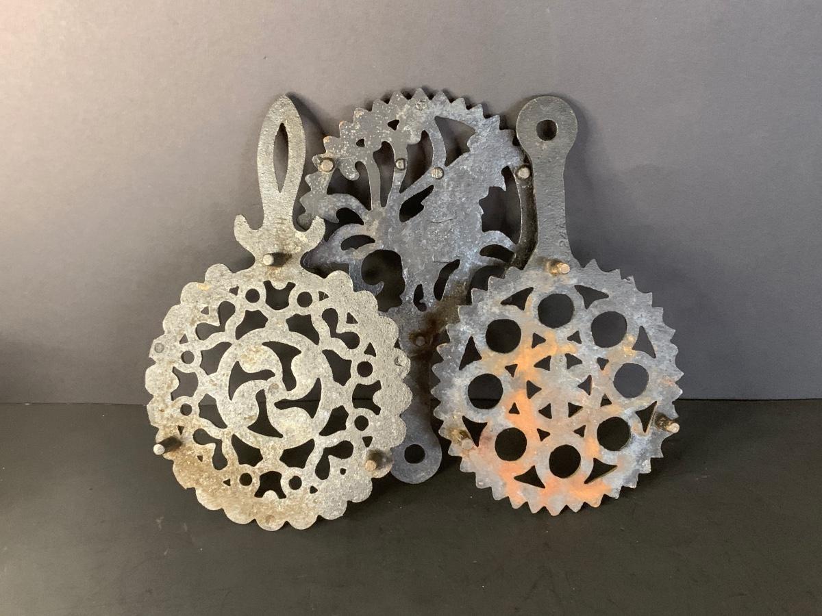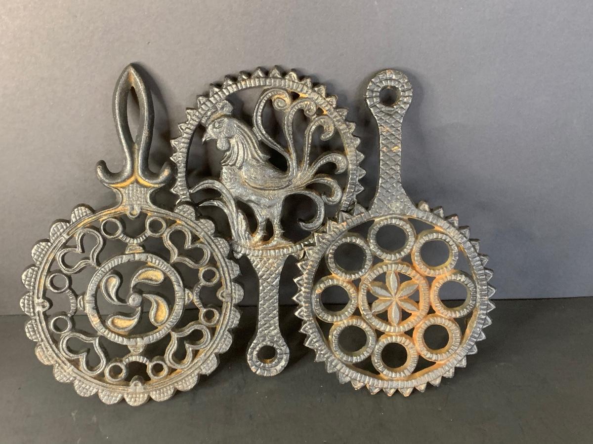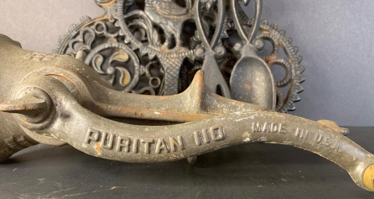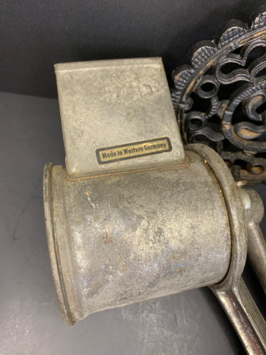 Lot 197R: Vintage Cast Iron Trivets, Spoon & Fork Wall Hanging, Vintage Food Grinders & Cast Iron Toy Truck