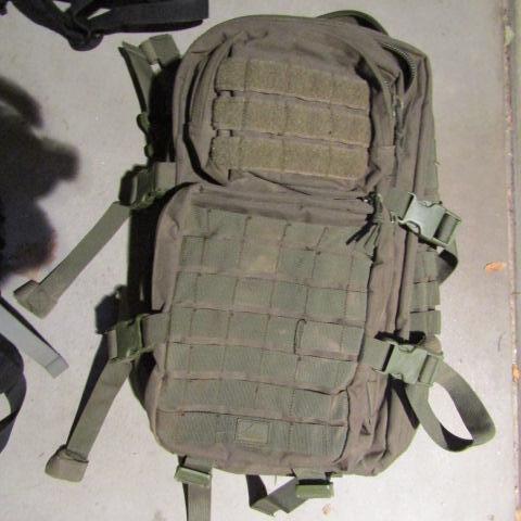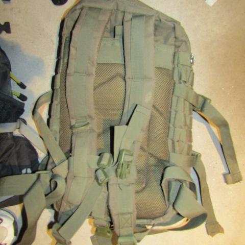 SMALL ARMY GREEN BACKPACK HAS VELCRO LIKE STRIPS ON THE FRONT AND BACK